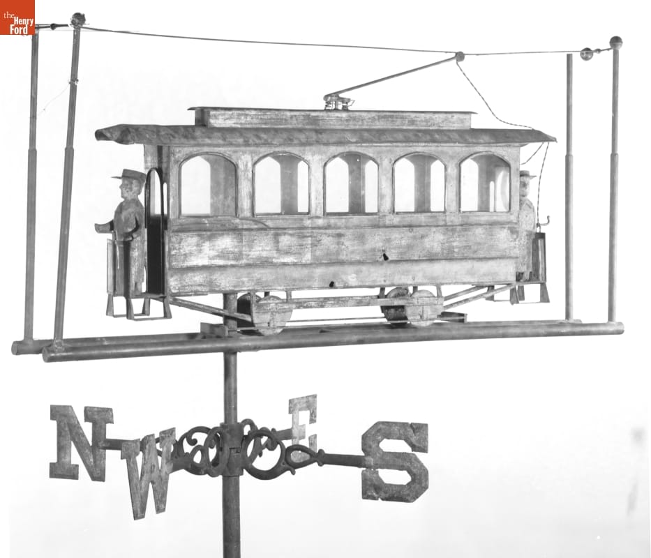 Weathervanes point into the direction of the wind. This helped viewers anticipate weather changes before local forecasts became common after 1920. Functional vanes required a basic pointing device and directional arms, but manufacturers added decorative elements, or ornaments, to appeal to consumer interests. Changing transportation technologies became popular symbols of modernity during the late-19th and early-20th centuries.
