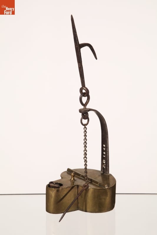 Betty lamps were one of the earliest forms of American lighting, burning grease and fat. They could be hung or placed on a table. The flame projected from the spout on the front of the lamp. This lamp features the design characteristics of noted lighting maker and metal worker Peter Derr, which included a sheet copper bottom and wrought iron wick support.