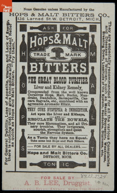 Text on reverse, in part: None Genuine unless Manufactured by the HOPS & MALT BITTERS CO., 136 Larned St. W. DETROIT, MICH....Compounded from the well known Curatives Hops, Malt, Buchu, Mandrake, Dandelion, Sarsaparilla, Cascara Sagrada, etc., combined with an agreeable Aromatic Elixir. THEY CURE DYSPEPSIA & INDIGESTION, Act upon the Liver and Kidneys, REGULATE THE BOWELS...For General Debility, Loss of Appetite, Vitality...They are especially recommended for all the various Complaints and Diseases of Women.../