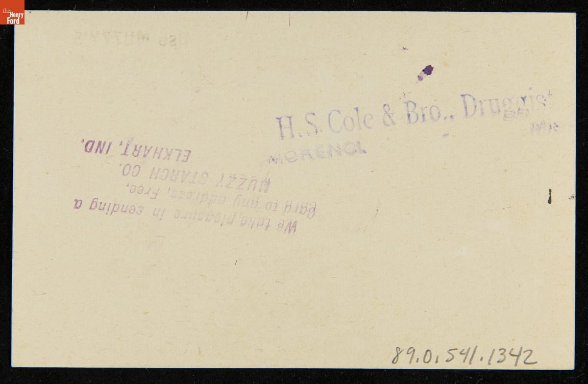 As color printing gained momentum in the late 19th century, trade cards became a major means of advertising goods and services. Americans enjoyed and often saved the little advertisements found in product packages or distributed by local merchants. This trade card advertises Muzzy's Corn Starch.