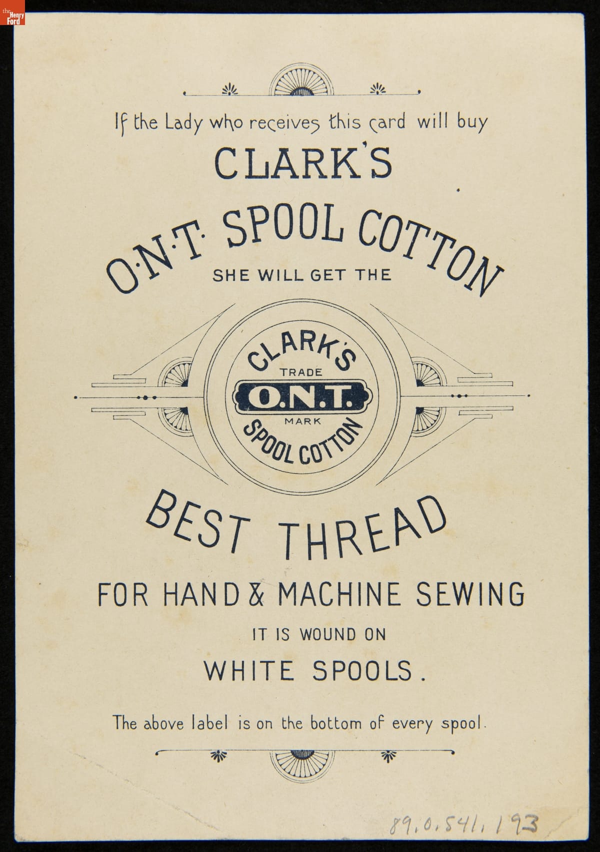 Trade Card for Clark's O.N.T. Spool Cotton Thread, 1880-1890