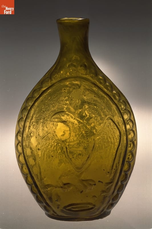 Glass factories in America began producing inexpensive, mold-formed flasks in the early 1800s. These figured flasks, often decorated with symbols of national pride or political or cultural affiliation, appealed to America's common man. Many flasks, like this one, contain images of an eagle -- a traditional symbol for America.