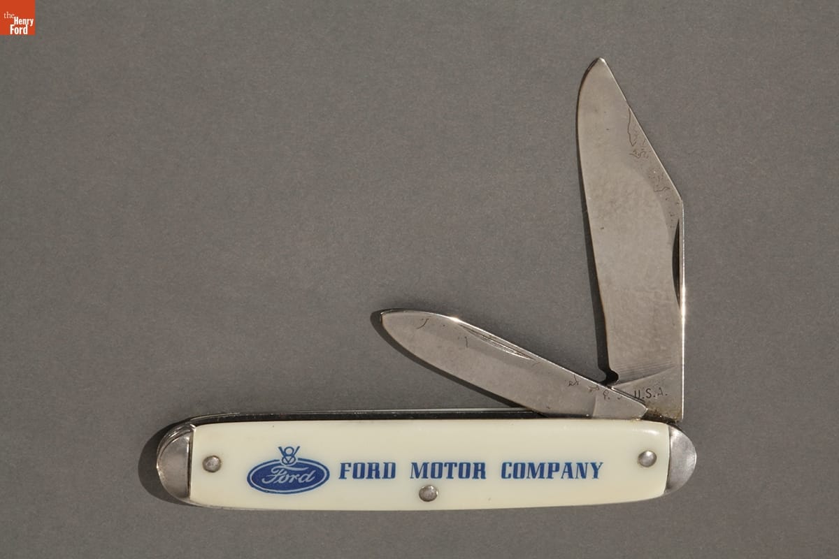 Ford Motor Company produced this jackknife for the Ford Exposition at the Century of Progress 1934 Chicago World's Fair. This souvenir reminded the visitor of his time at the fair. It also advertised Ford's newest innovation, the V-8 engine. Ford introduced the V-8, the first compact and powerful engine affordable to the general auto buying public, in 1932.