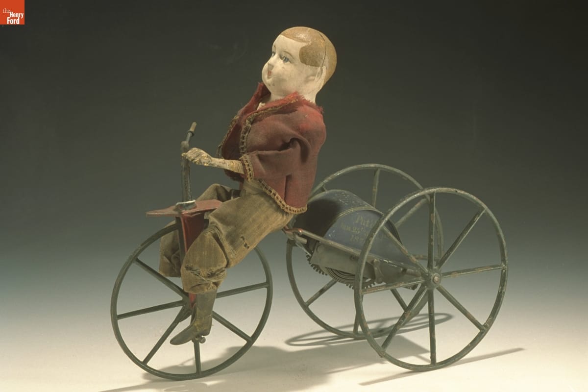 Toy makers have long experimented with ways that toys could simulate human and other real-life action. Key-wound clockwork mechanisms, mass produced by the late 1800s, revolutionized the toy world. In this toy, when a key is wound, the mechanism mounted between the wheels causes the boy's legs to pedal, moving the velocipede forward.