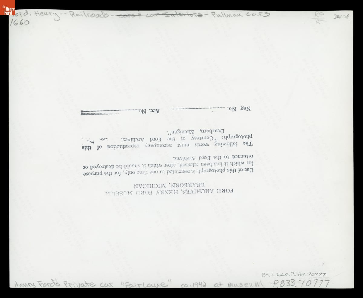By 1920, Henry and Clara Ford found it increasingly difficult to travel with any degree of privacy. They purchased a private railcar and named it Fair Lane. The car had four private rooms, an observation lounge, a dining room, and a fully equipped kitchen. It could accommodate eight passengers. The couple made over 400 trips using Fair Lane before selling the passenger car in 1942.
