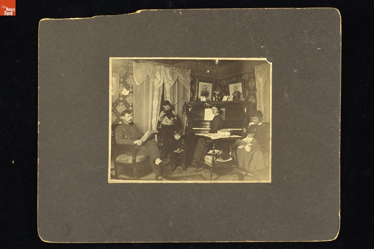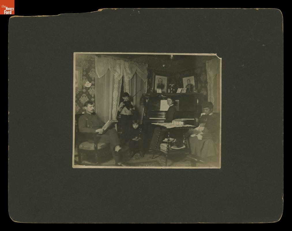 The parlor of this middle-class northern Indiana family is filled with fashionable goods that provided a comfortable lifestyle. By the late 19th century, factories were turning out consumer goods of all kinds, advertising told potential customers what was available, and railroads made it easier to get goods to local stores. This family could also have obtained goods by mail order--even the piano.