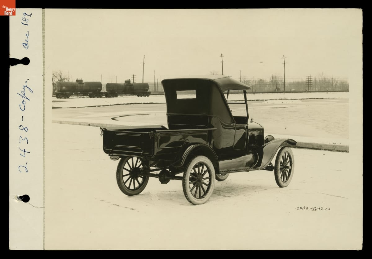 Ford Motor Company introduced its light-duty Model T runabout pickup in April 1925. It came with a factory-installed steel pickup bed measuring 56 inches long by 40-3/4 inches wide. The bed also included an adjustable tailgate and four pockets for stakes. Ford's pickup was priced at $281, and the company sold nearly 33,800 units in that first year.