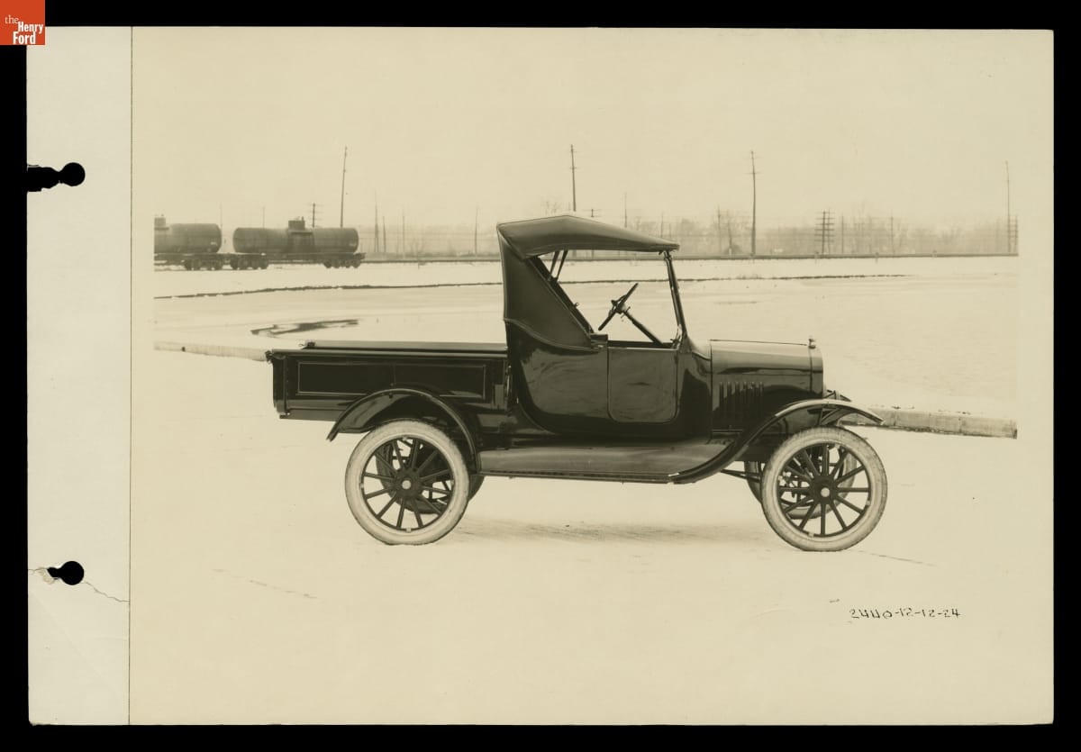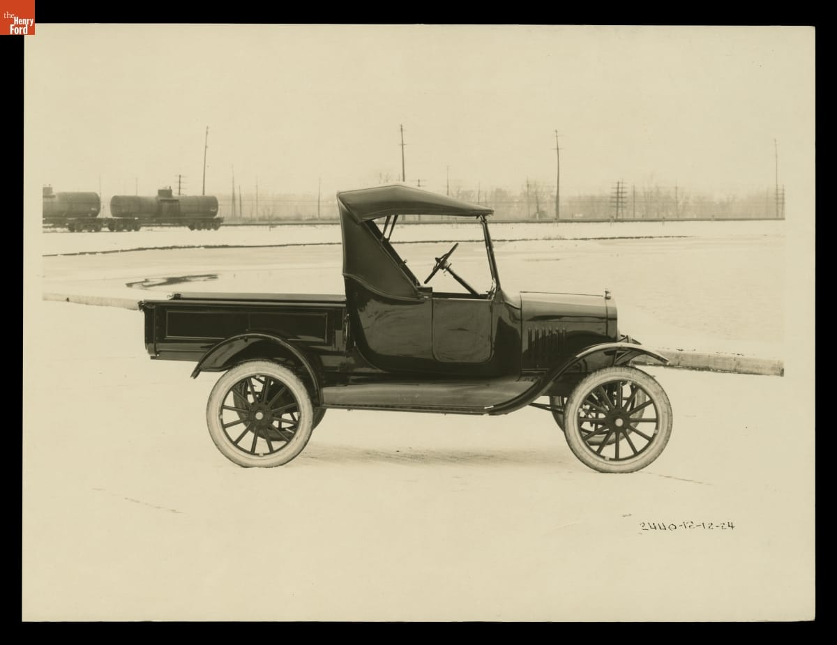 Ford Motor Company introduced its light-duty Model T runabout pickup in April 1925. It came with a factory-installed steel pickup bed measuring 56 inches long by 40-3/4 inches wide. The bed also included an adjustable tailgate and four pockets for stakes. Ford's pickup was priced at $281, and the company sold nearly 33,800 units in that first year.