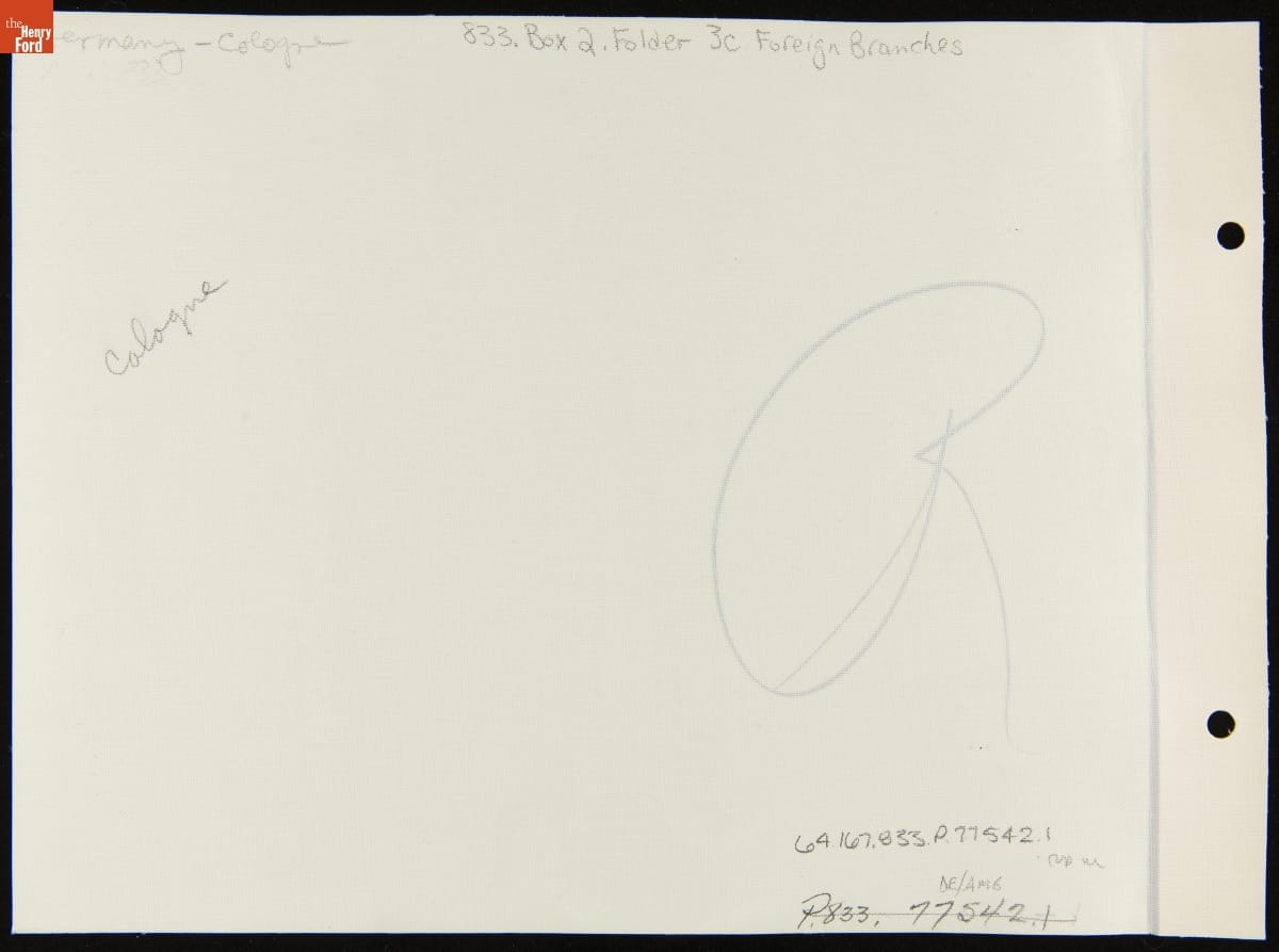Ford Motor Company operated sales and service branches, as well as factories, in cities around the world. This photograph shows the company's plant in Cologne, Germany. The cornerstone was laid by Henry Ford himself, who visited the site during a European tour in 1930. When the factory opened the following year, it employed some 2,000 people.