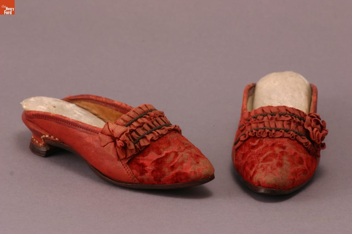 Mules are backless shoes. Women in the late 19th and early 20th centuries typically wore these easy-to-slip-on shoes in the bedroom, but by the late 20th century mules had become a fashion item worn nearly everywhere. Mercy Lavinia Magri, the diminutive performer employed by P. T. Barnum, owned this pair.