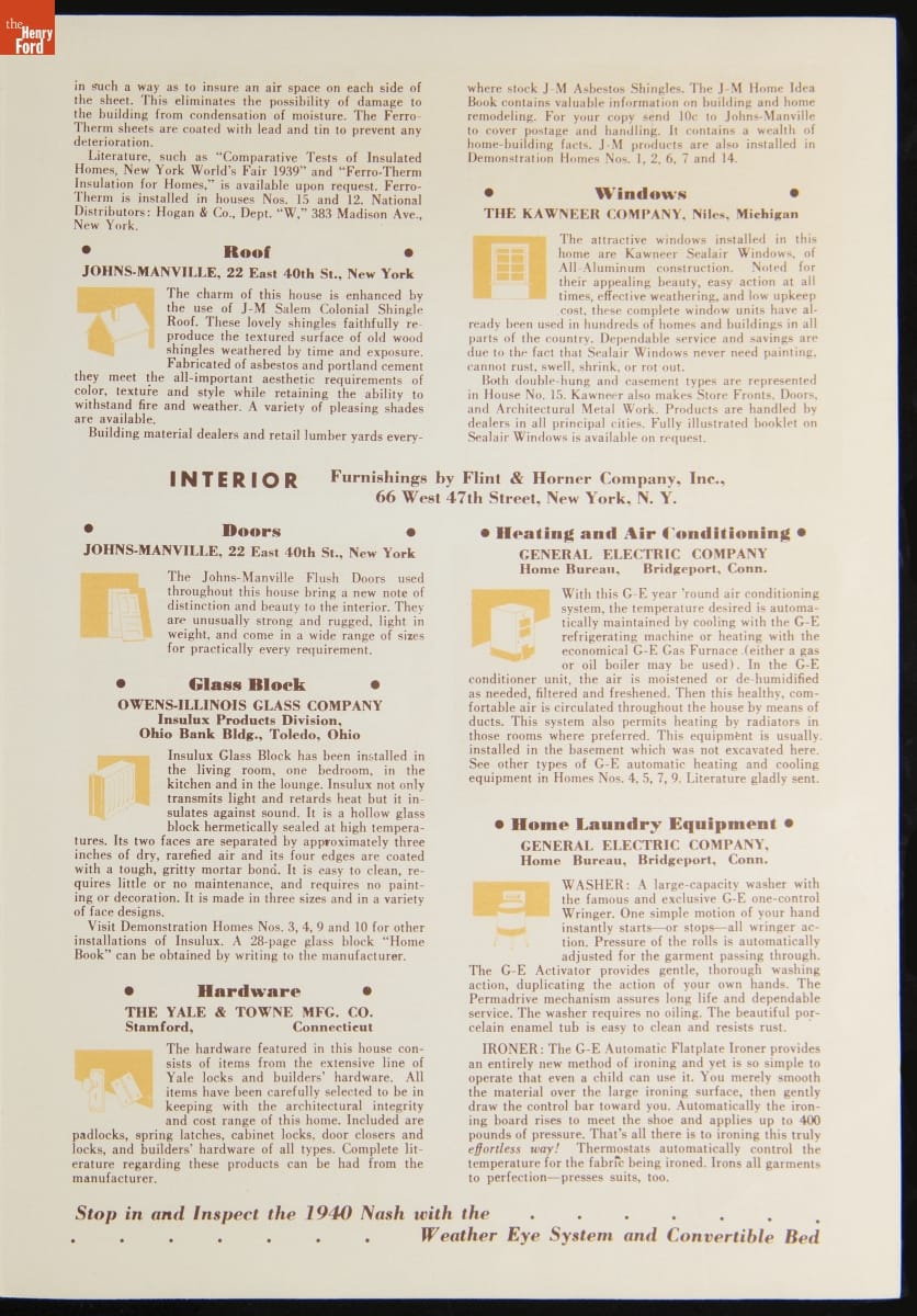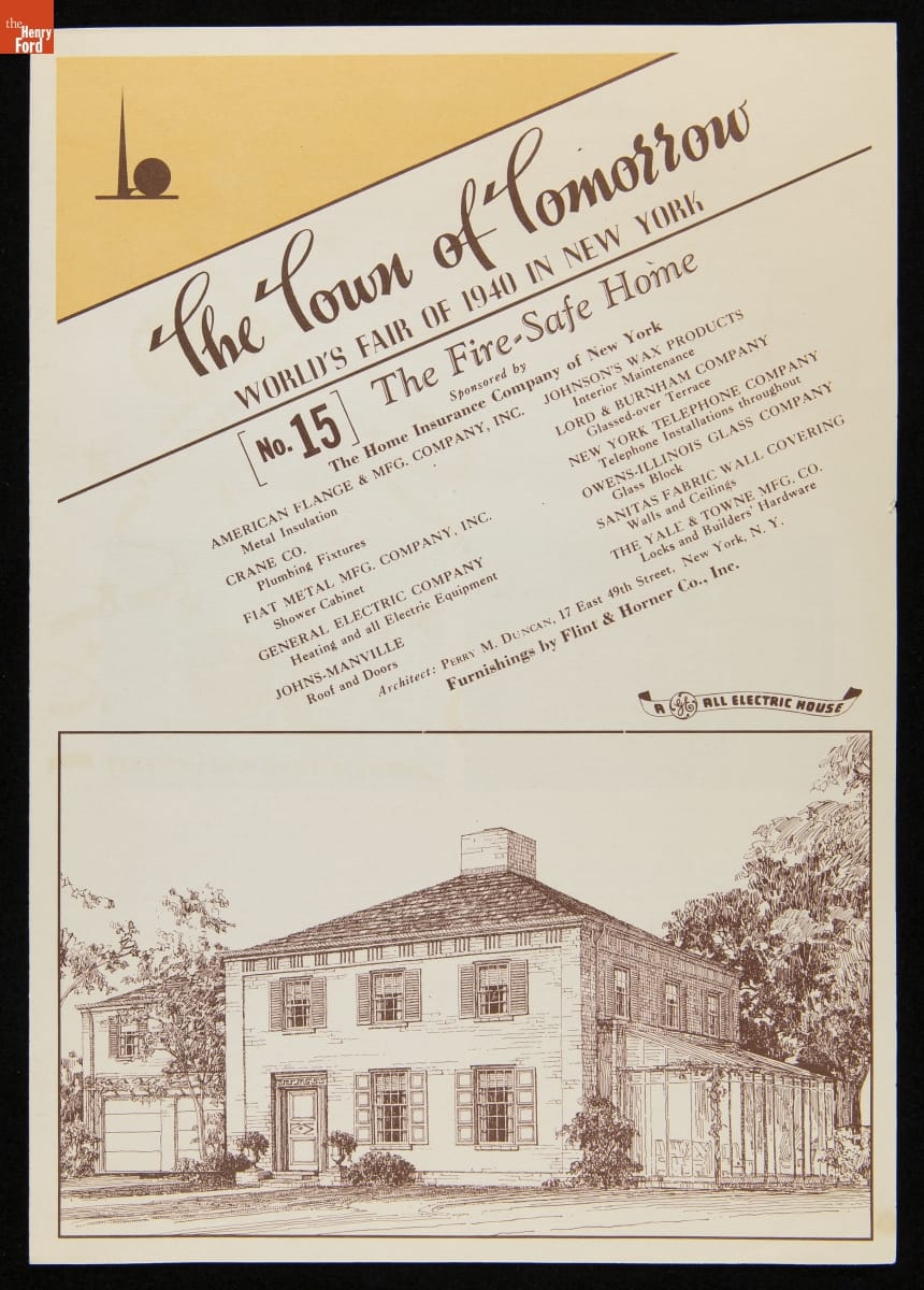 The 1939-40 New York World's Fair encouraged a depression-weary public that the future would be rosy. One exhibition, the Town of Tomorrow, particularly expressed the fair's utopian "Building the World of Tomorrow" theme. Fifteen Demonstration Homes comprised the Town of Tomorrow. Each house practically demonstrated modern building equipment and materials, which were described for fairgoers in a complimentary booklet.