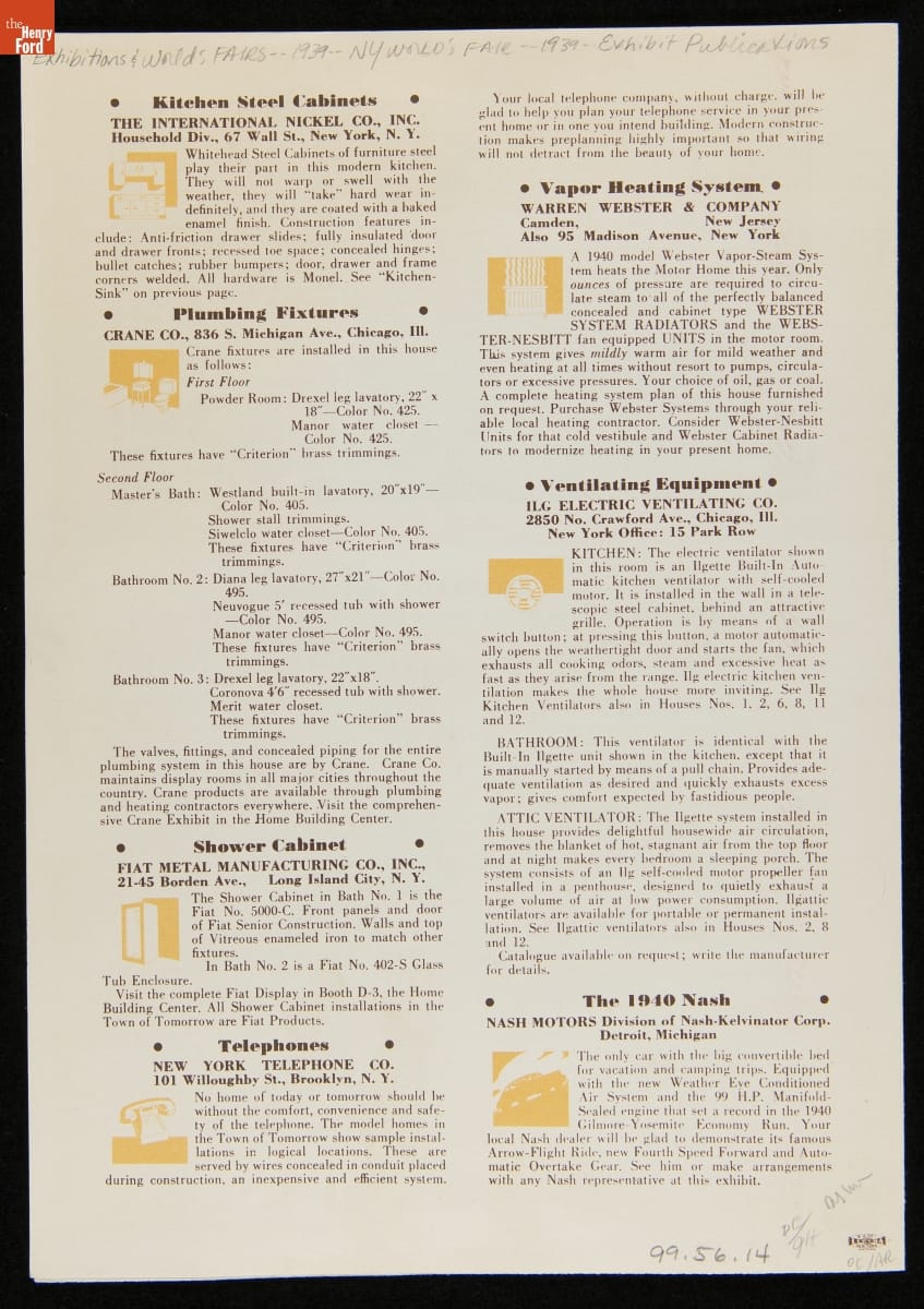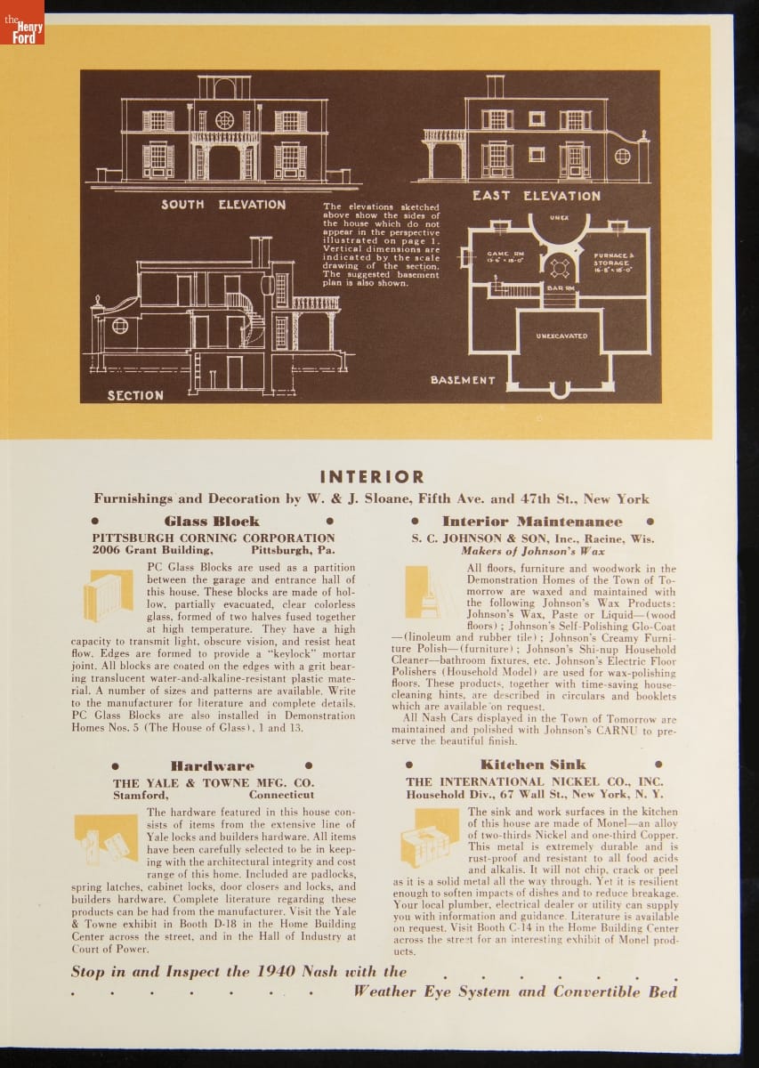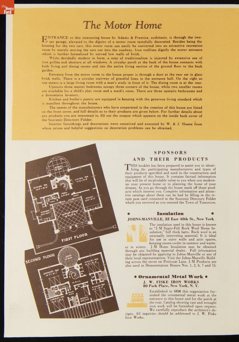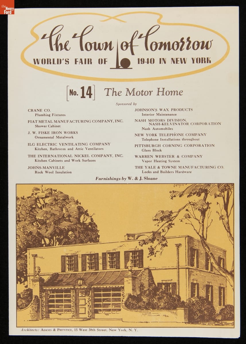 The 1939-40 New York World's Fair encouraged a depression-weary public that the future would be rosy. One exhibition, the Town of Tomorrow, particularly expressed the fair's utopian "Building the World of Tomorrow" theme. Fifteen Demonstration Homes comprised the Town of Tomorrow. Each house practically demonstrated modern building equipment and materials, which were described for fairgoers in a complimentary booklet.