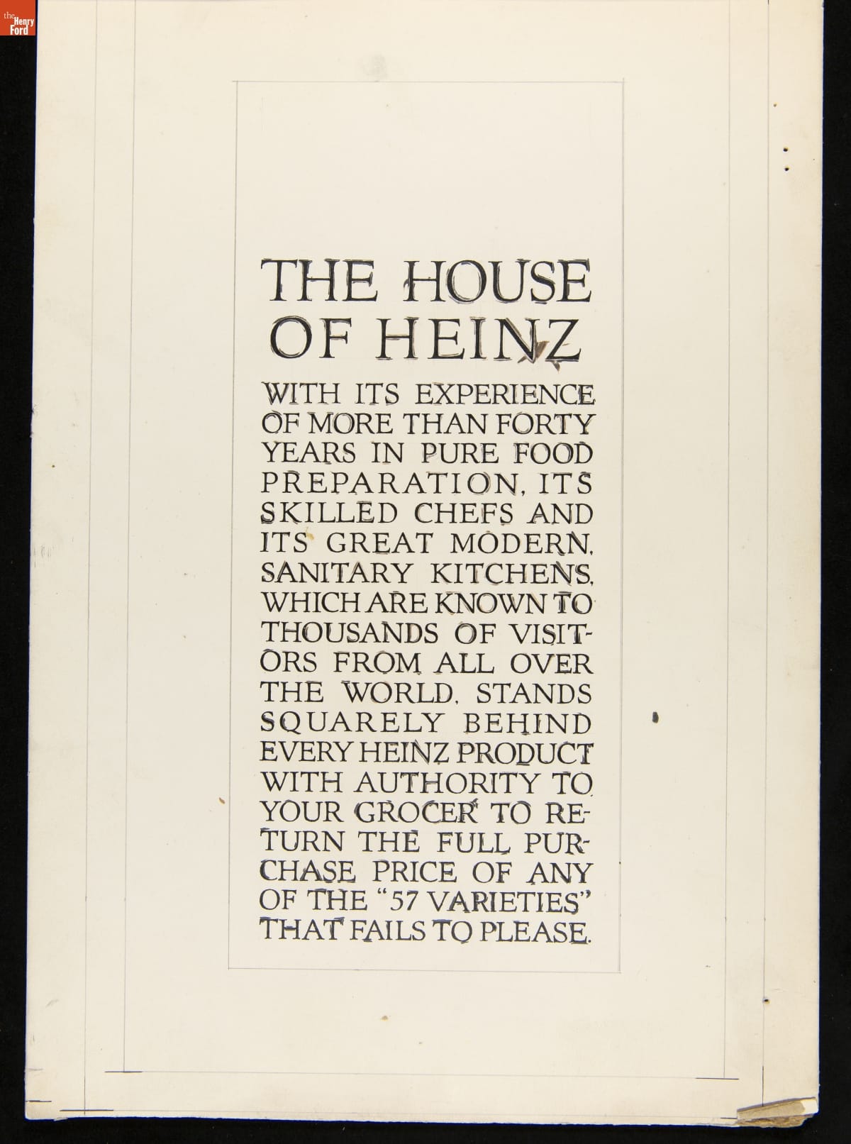 The H.J. Heinz Company published pamphlets, brochures, and booklets that detailed the company's history and manufacturing process. It also produced trade catalogs which featured every product under the famous "57 Varieties." This advertising layout was created for the back cover of a Heinz trade catalog from about 1915.