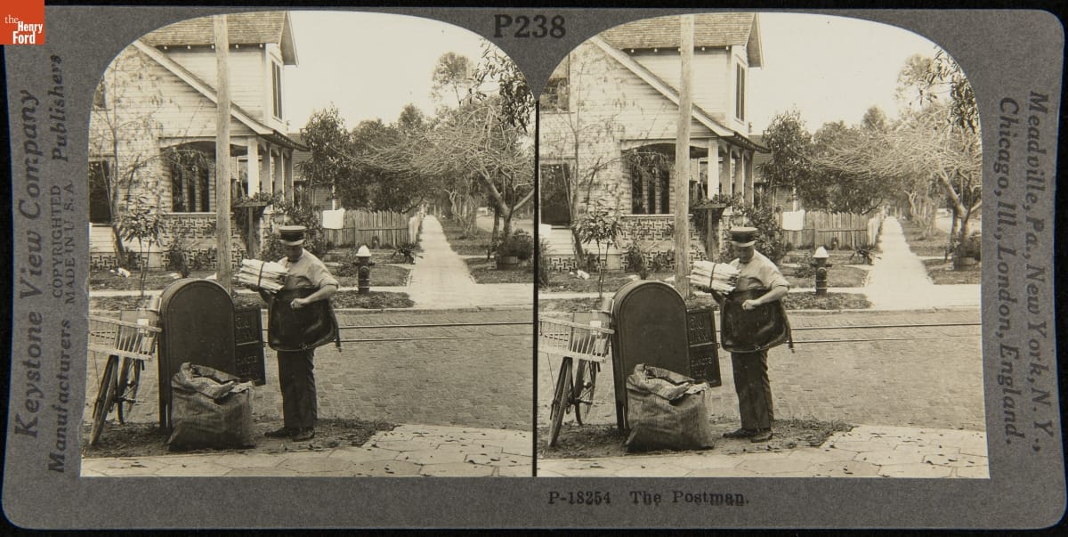 Bicycles found uses beyond recreational and competitive riding. Police officers, municipal workers and delivery couriers in larger cities used bikes to complete their tasks. Letter carriers, like the small-town postal worker photographed for this stereograph, also used bicycles to speed their rounds.