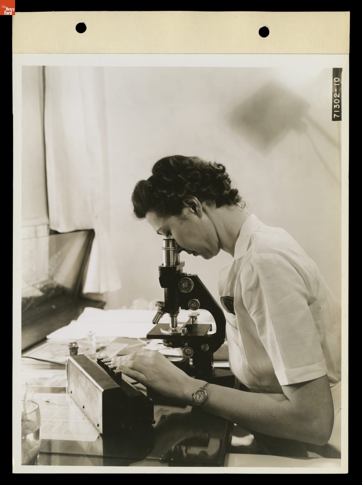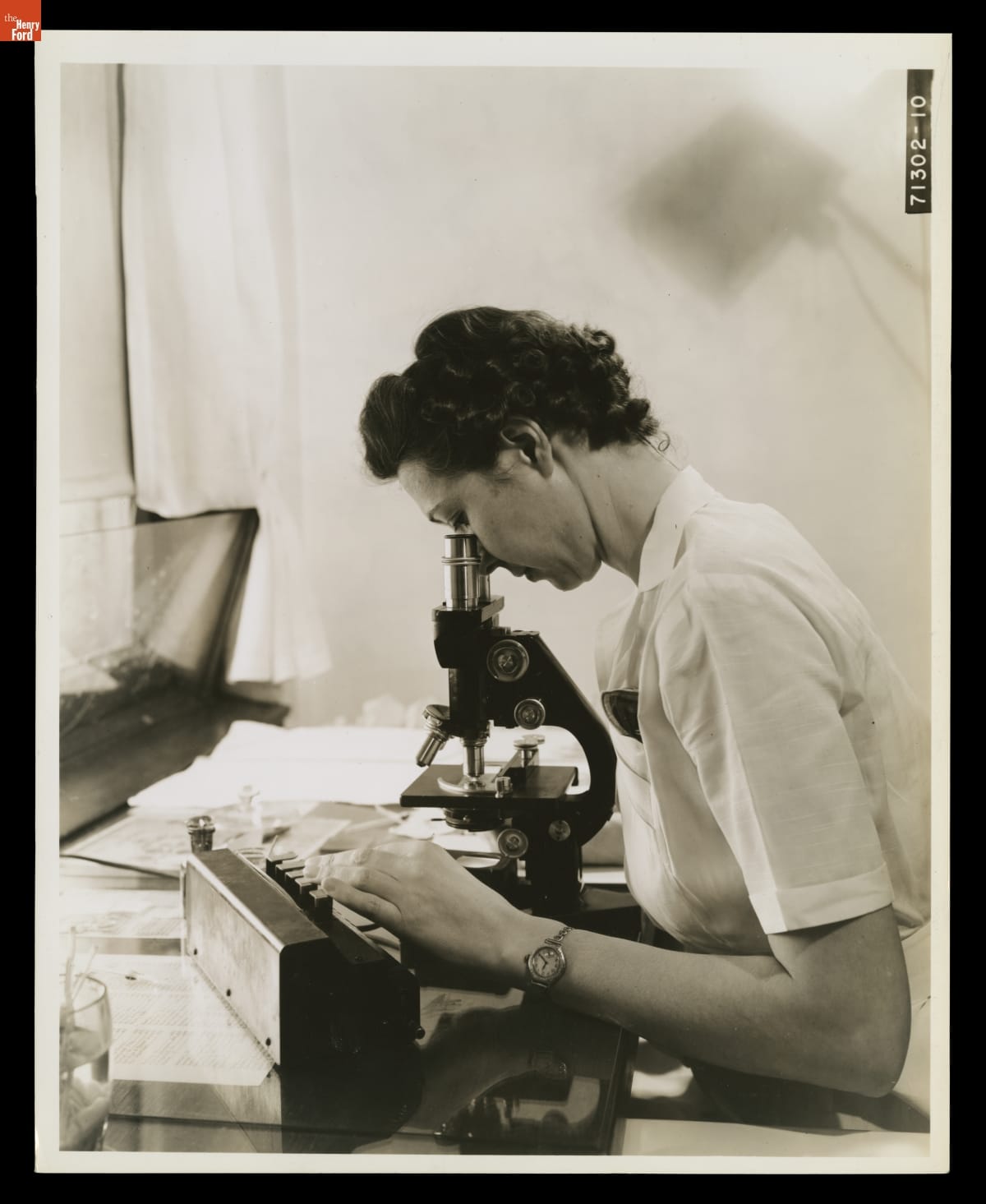 Woman Using a Research Laboratory Microscope at Henry Ford Hospital, Detroit, Michigan, January 1939
