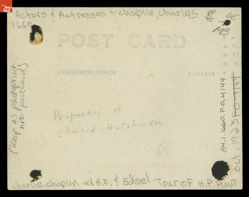 Edsel Ford (left) and Henry Ford (right) were photographed with Charles Chaplin while touring the actor-director through Ford Motor Company's Highland Park power plant in 1923. Thirteen years later, Chaplin satirized Ford's moving assembly line -- and the effects of its frantic pace on workers -- in his film Modern Times. Chaplin's pointed comedy examined the human cost of mass production.