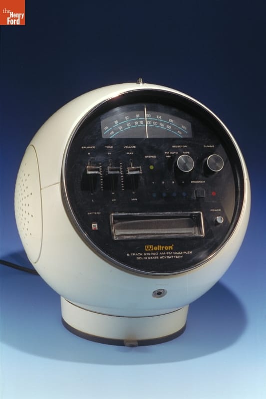 This tape player combined the newest audio format with the spaciest design. Eight-track tape became popular in the mid-1970s; unlike vinyl records, eight-tracks wouldn't skip and could be played in moving cars. This Weltron 2001 eight-track tape player was well-named: its design evokes the 1968 film "2001: A Space Odyssey," and other visions of our future in space.