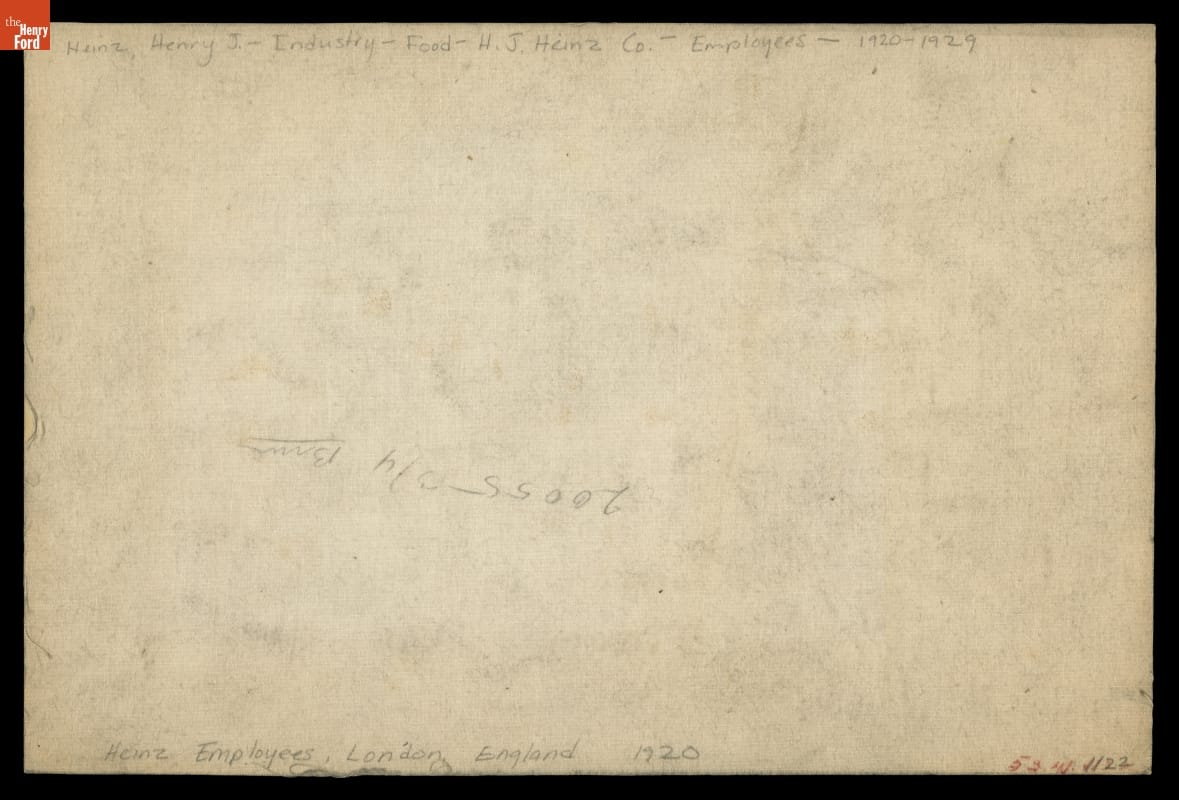H.J. Heinz entered the manufactured food industry 1869. With a rapidly expanding line of high-quality products and a flair for marketing, the Heinz brand quickly became a household name. As the manufacturing operation grew, the company itself expanded, building branches and factories across the U.S. and internationally as well. This photograph shows the employees from Heinz's London branch in 1920.