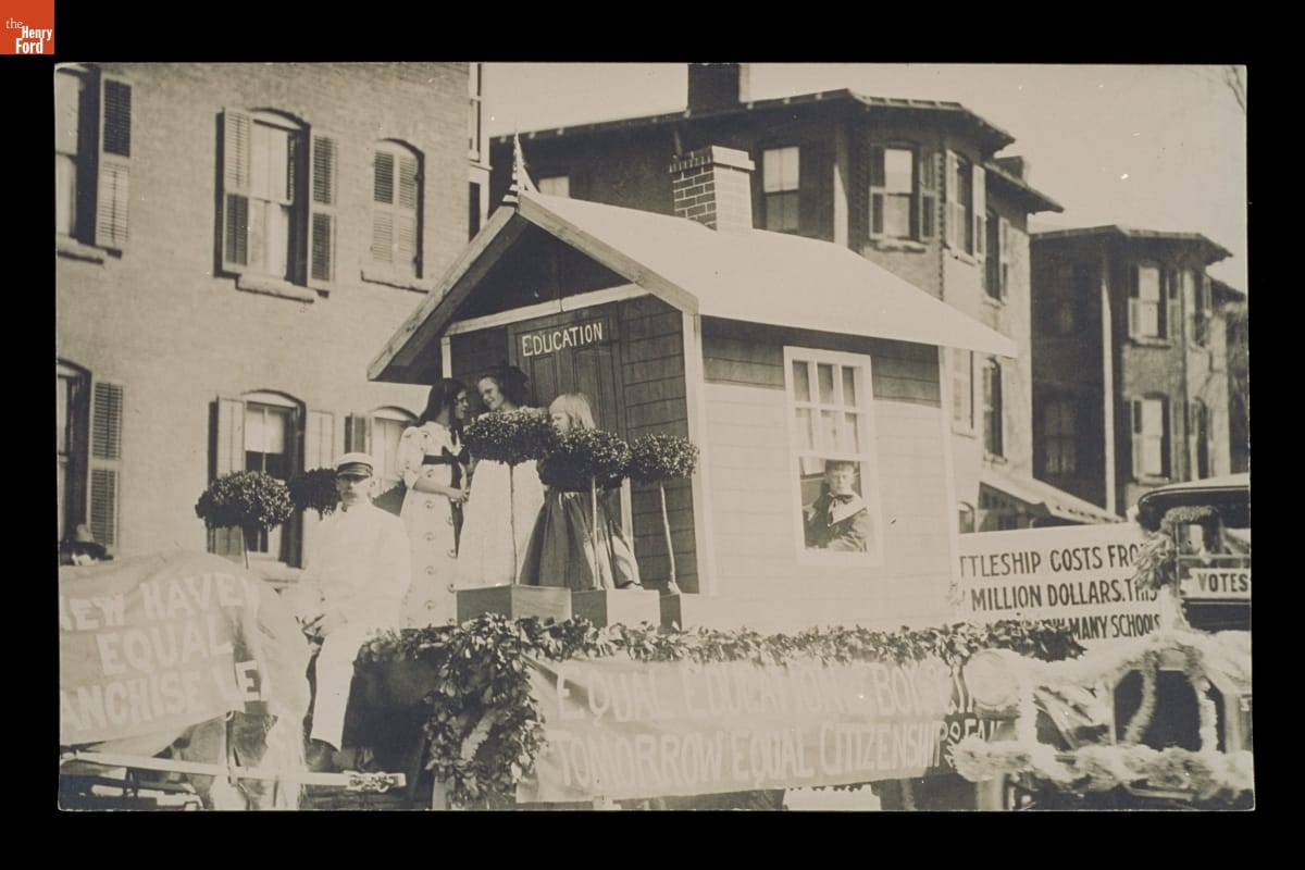 In the 1910s, many Americans joined the already decades-long fight for women's suffrage, or equal voting rights. To rally support, suffragists staged parades. These often elaborate processions championed numerous individual causes. This float in New Haven, Connecticut, related "equal education for boys and girls" to "equal citizenship" in the future. A constitutional amendment granting women suffrage was finally ratified in 1920.
