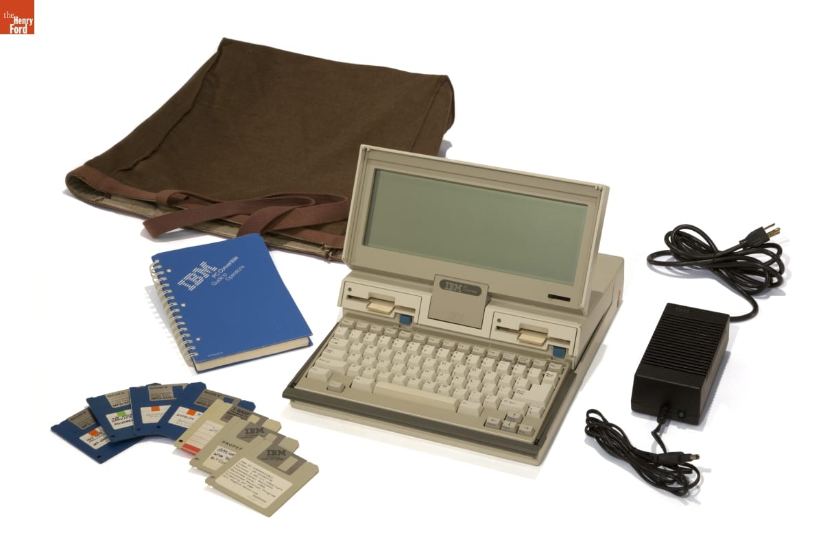 IBM, the dominant business machine company in the world, did not initially jump into the computer field. When it did announce its first personal computer in 1981, it also published the technical specifications allowing competitors to build compatible computers. This 1985 IBM 5140 Laptop was ivory in color and came with a canvas carrying bag.