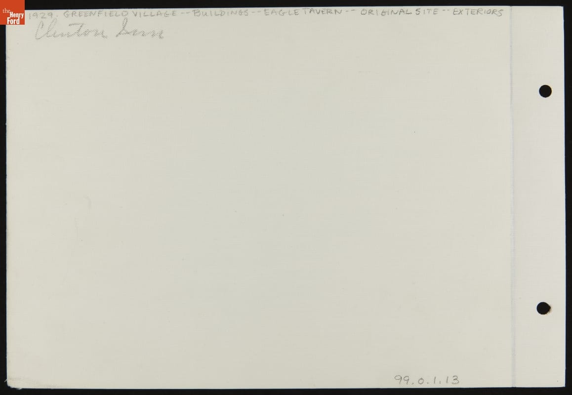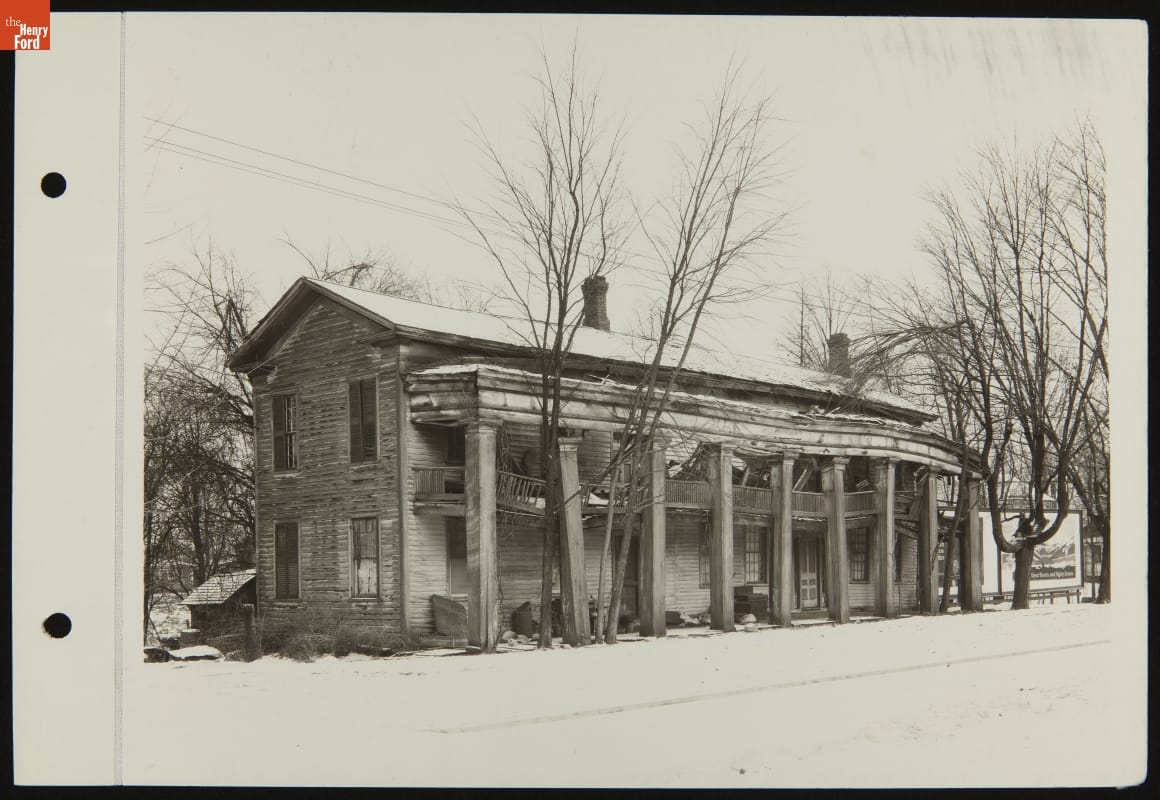 This building was constructed in 1831-2 as a stagecoach stop in Clinton, Michigan, on the Detroit-to-Chicago road. In the early 1900s, during its use as a private residence, the former hotel and tavern fell into disrepair. Henry Ford purchased the badly deteriorated structure in 1927, relocated it to Greenfield Village, and restored it as the Clinton Inn (later Eagle Tavern).