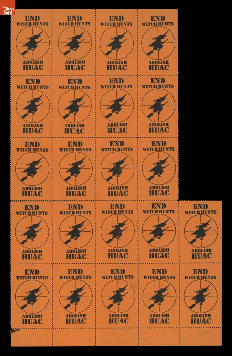 These poster stamps -- small postage stamp-sized labels -- called for the abolition of the House Un-American Activities Committee (HUAC). From 1938 to 1975, the committee was responsible for investigating alleged subversive activities by communists and fascists. The HUAC's tactics were often associated with political repression and unjust persecution, in what many called witch hunts reminiscent of the Salem Witch Trials.