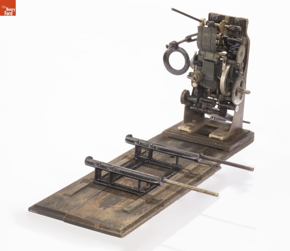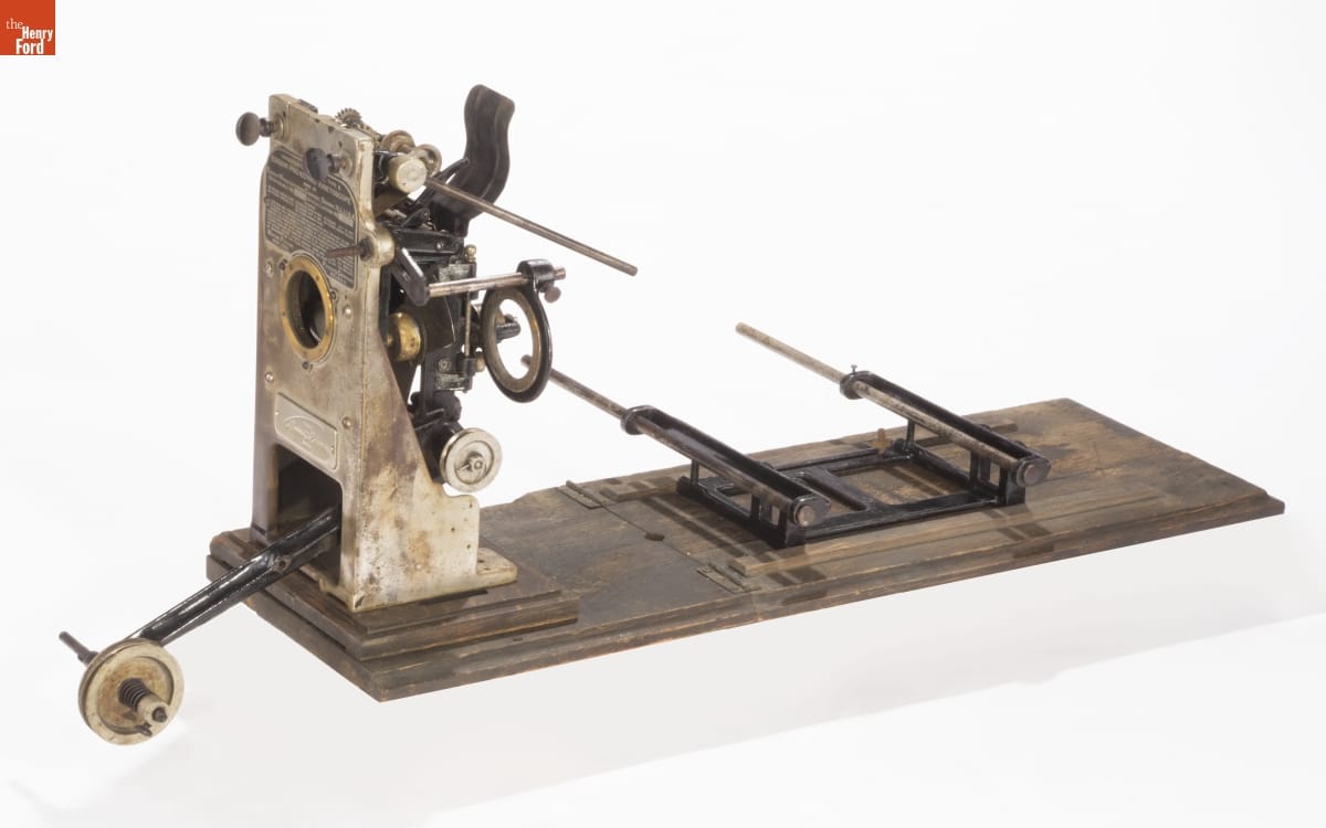 Front Plate: UNDERWRITER'S MODEL, TYPE B/EDISON PROJECTING KINETOSCOPE/MADE BY/EDISON MANUFACTURING COMPANY, ORANGE, N.J., U.S.A./MFR'S SERIAL NO. 1286 SPECIAL LICENSE NO. 3412/PATENTED/NO. 578,185, MARCH 2, 1897