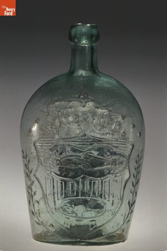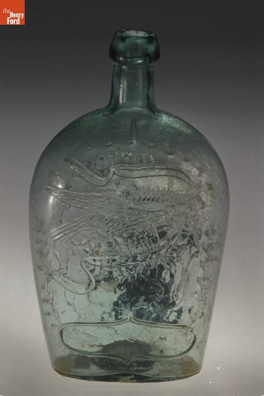 Glass factories in America began producing inexpensive, mold-formed flasks in the early 1800s. These figured flasks, often decorated with symbols of national pride or political or cultural affiliation, appealed to America's common man. The clasping hands, shield and eagle represent the Union -- a cause many Americans fought to uphold during the Civil War.