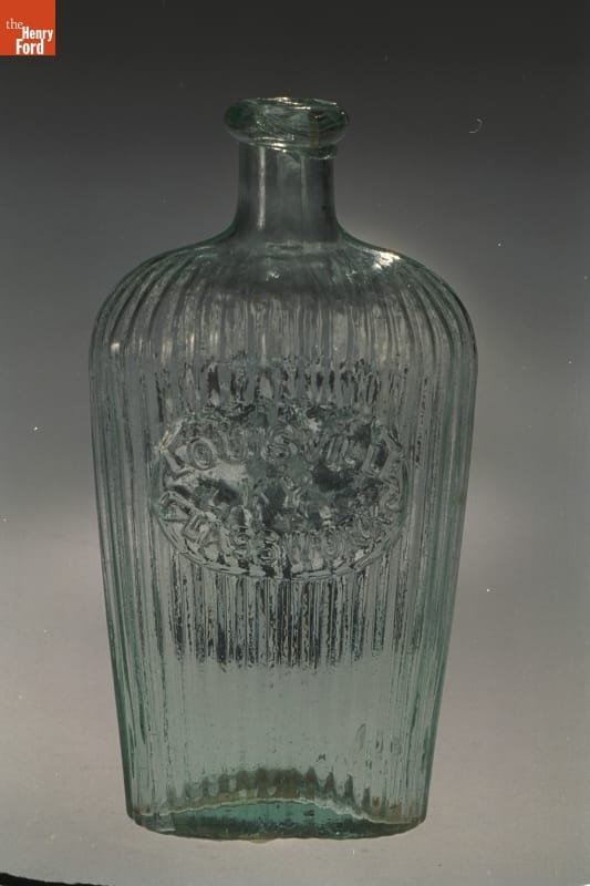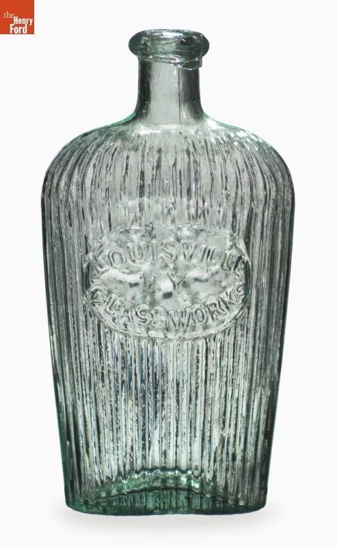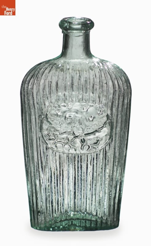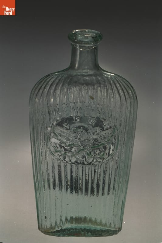 Glass factories in America began producing inexpensive, mold-formed flasks in the early 1800s. These figured flasks, often decorated with symbols of national pride or political or cultural affiliation, appealed to America's common man. Many flasks, like this one, contain images of an eagle -- a traditional symbol for America.