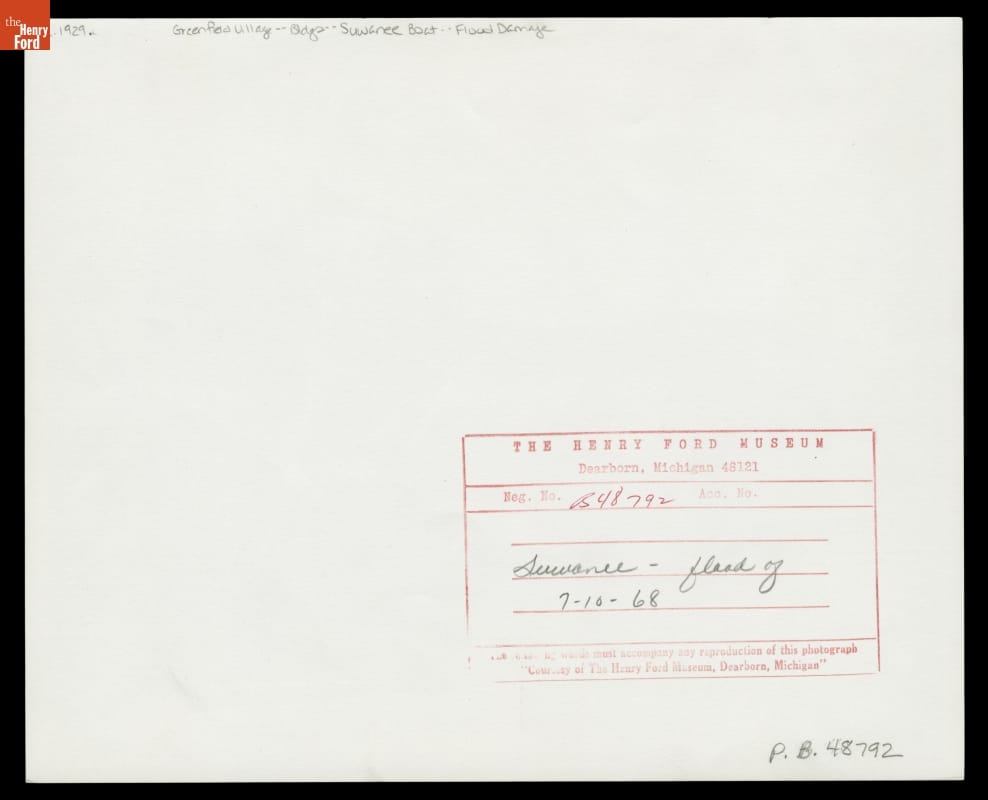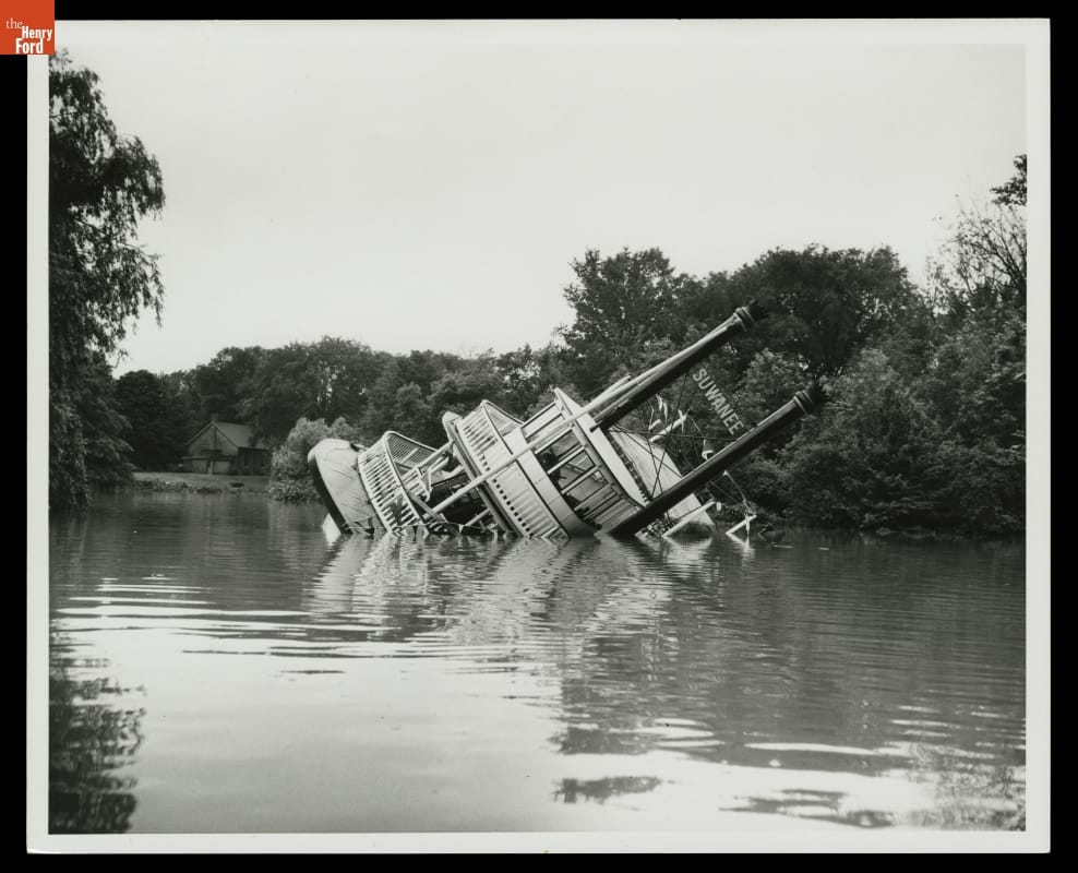 A summertime flood overwhelmed the steamboat Suwanee in July 1968. After the necessary repairs were made, the sternwheeler returned to service transporting visitors on the one-third-mile loop around Greenfield Village's Suwanee Lagoon.