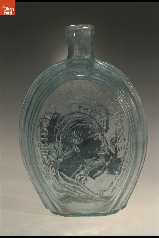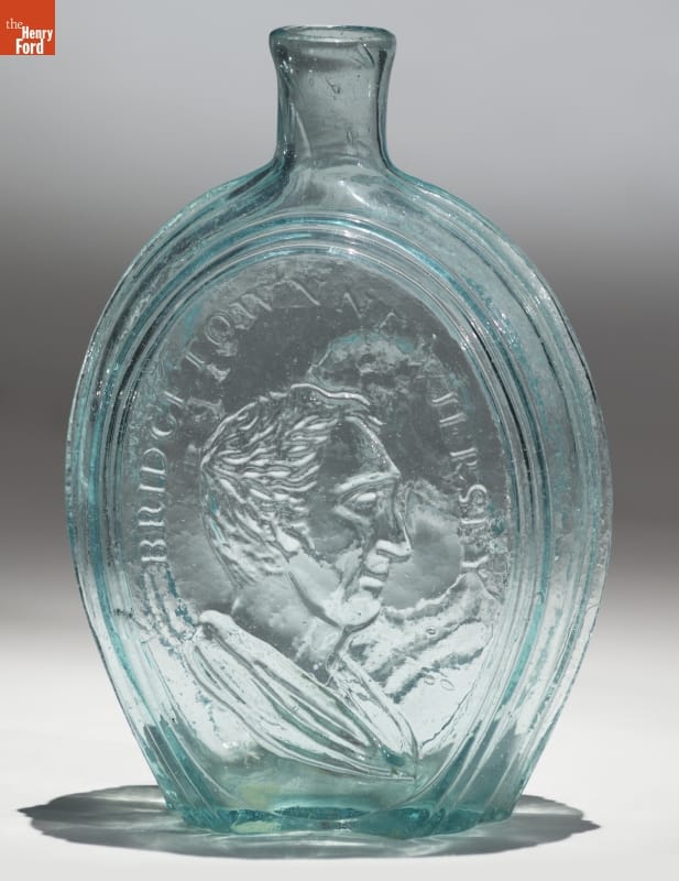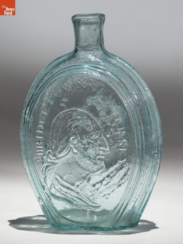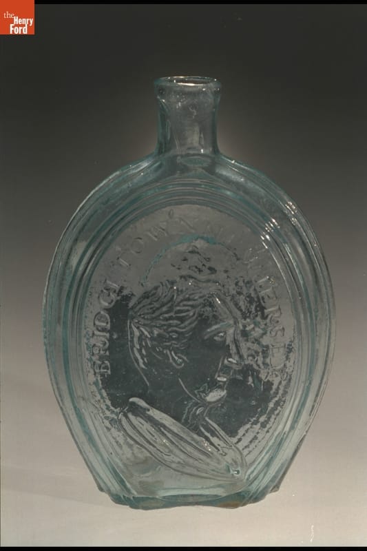 Whether depicted as commander-in-chief of the Continental Army, the first president of the United States, or a symbol of the republic, George Washington is a common likeness on early American flasks. Washington appears on 72 recorded flask designs--more than any other person. This example shows Washington with later politician, Henry Clay. Both are depicted as classical statesmen.