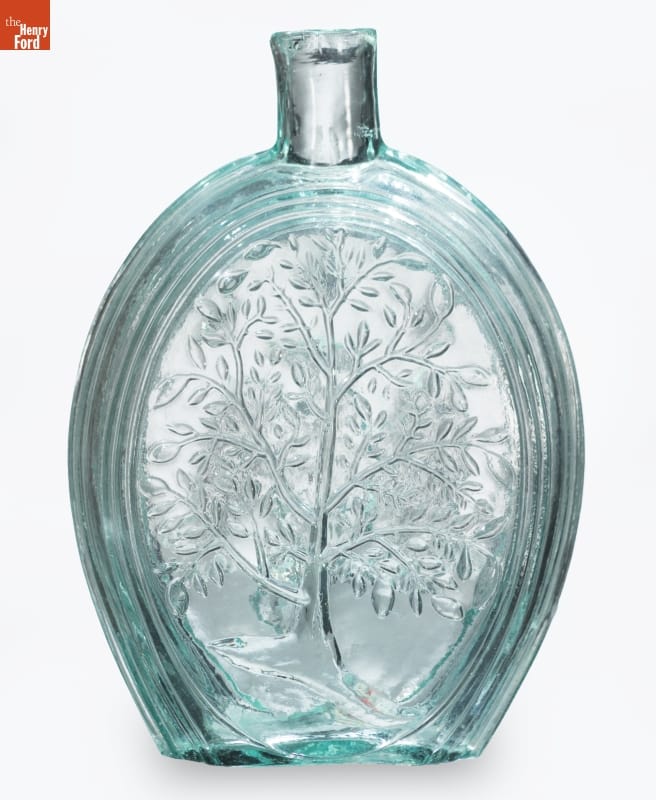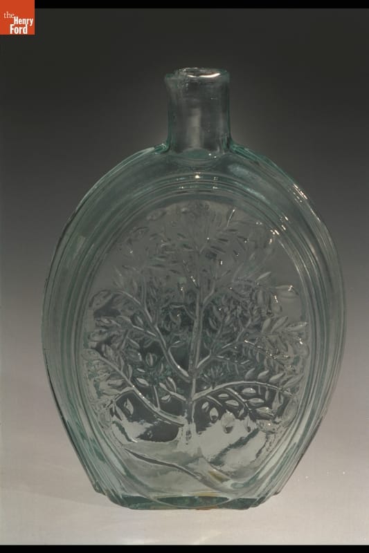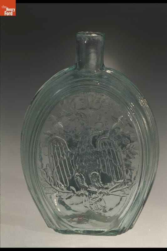 Glass factories in America began producing inexpensive, mold-formed flasks in the early 1800s. These figured flasks, often decorated with symbols of national pride or political or cultural affiliation, appealed to America's common man. The eagle on this flask was a symbol for America. The tree found on the back may have been purely decorative.