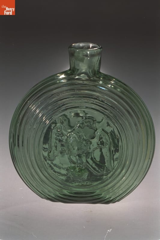 Glass factories in America began producing inexpensive, mold-formed flasks in the early 1800s. These figured flasks, often decorated with symbols of national pride or political or cultural affiliation, appealed to America's common man. Many flasks, like this one, contain images of an eagle -- a traditional symbol for America.