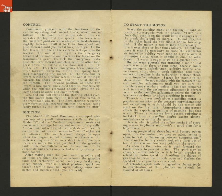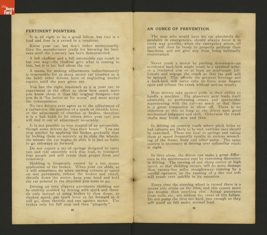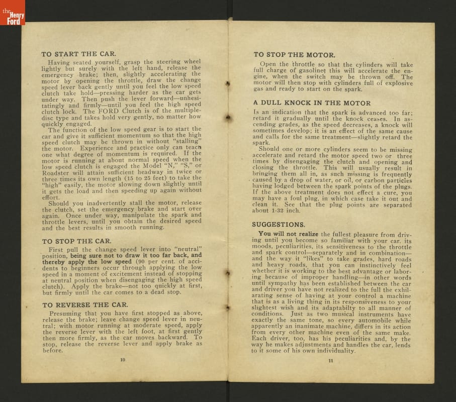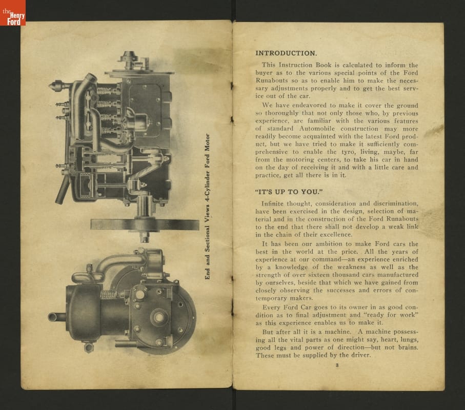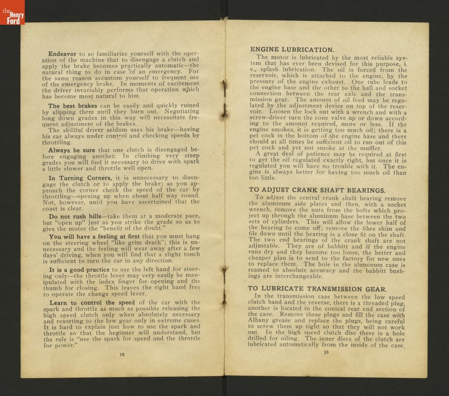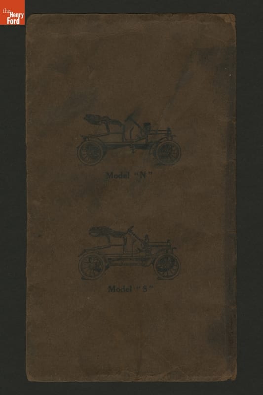 This 1908 set of instruction helped drivers care for and operate Ford Models N and S. These inexpensive vehicles were the immediate predecessors of Ford's Model T.