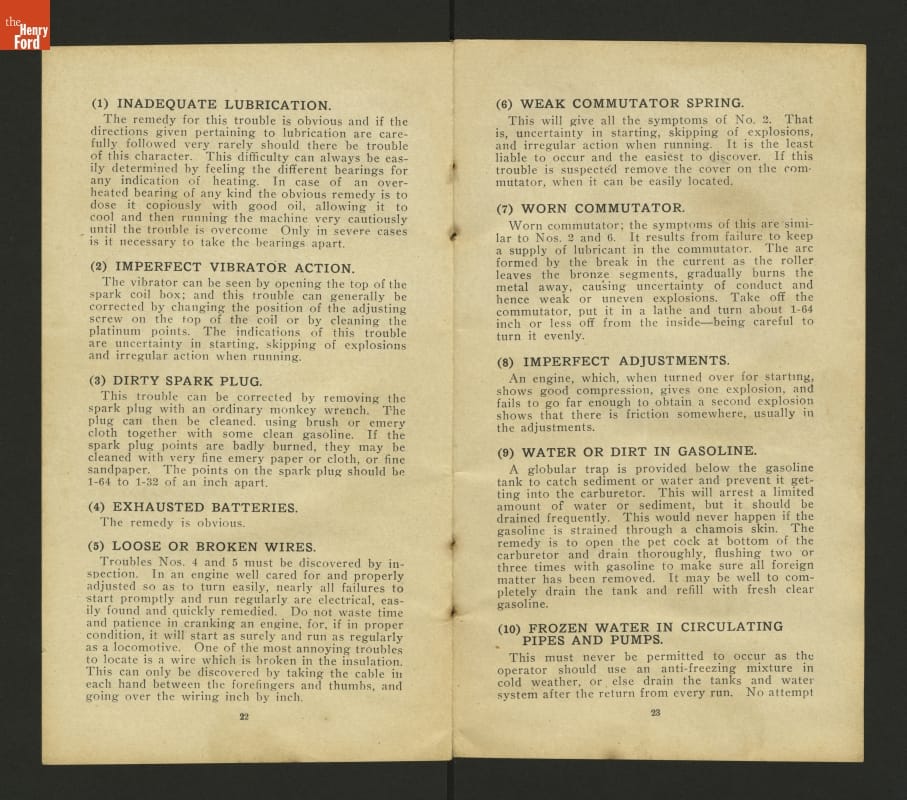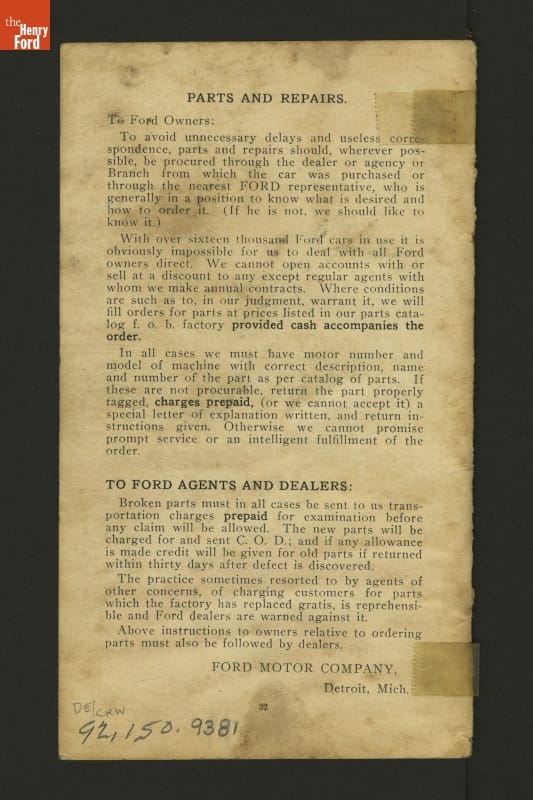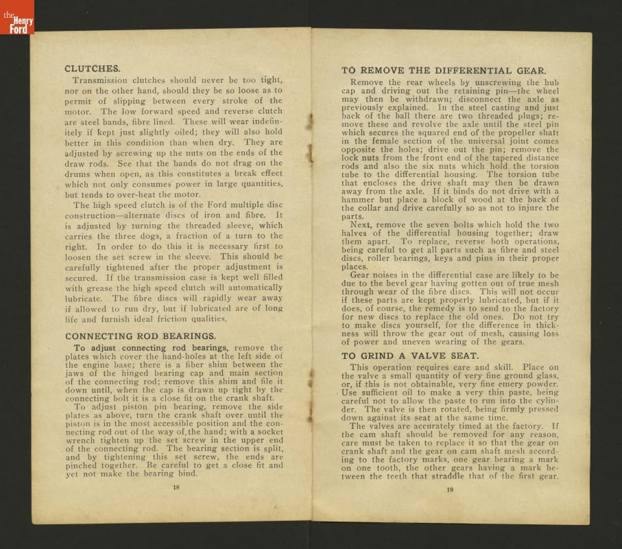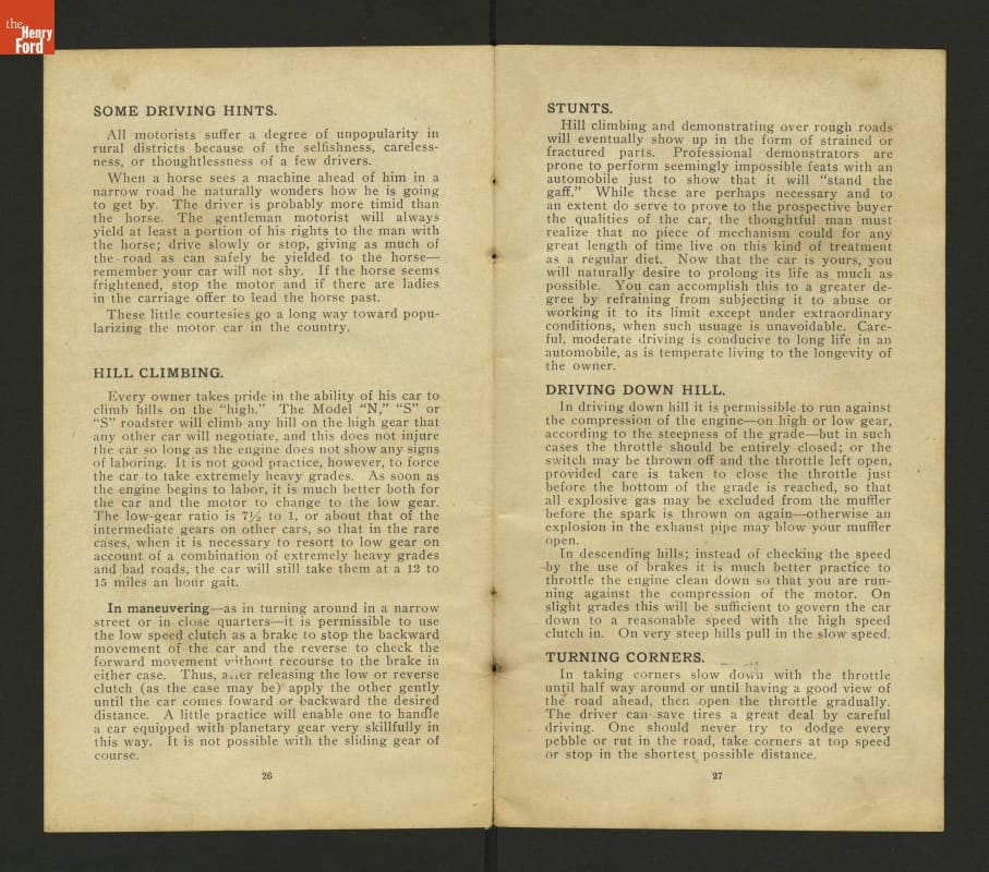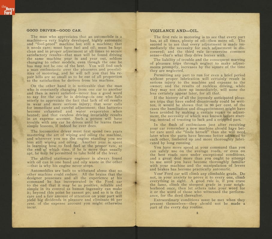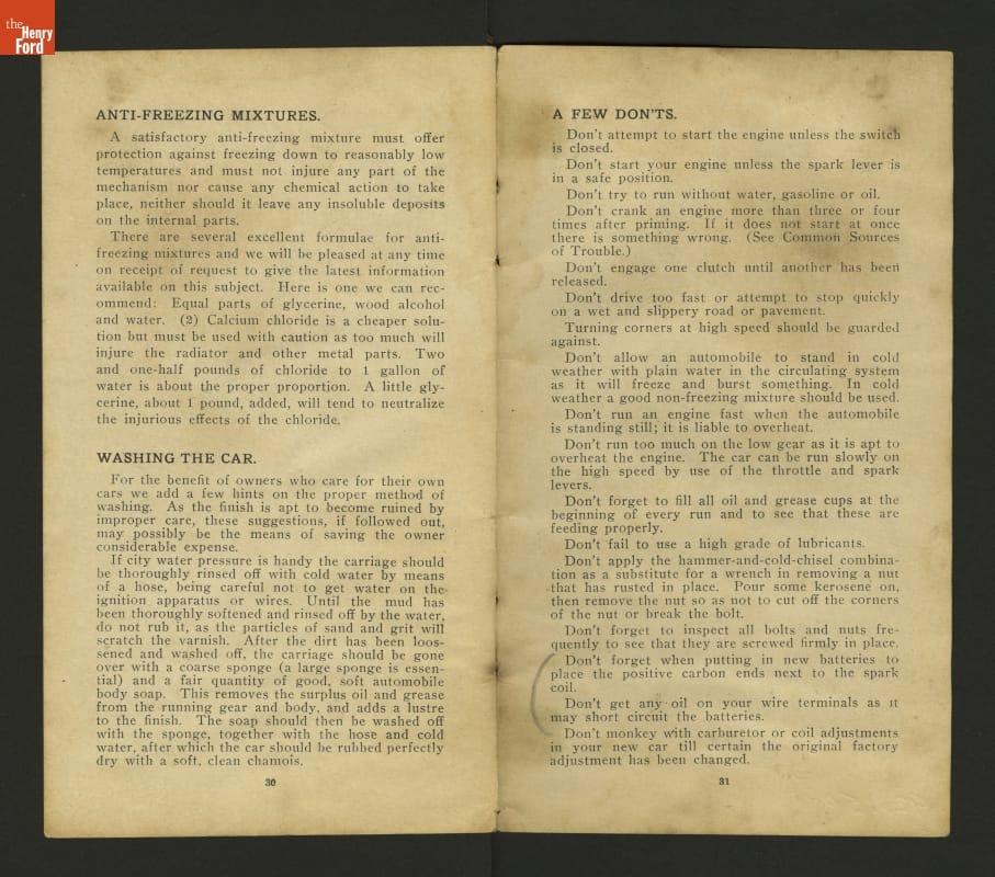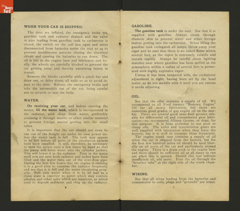 This 1908 set of instruction helped drivers care for and operate Ford Models N and S. These inexpensive vehicles were the immediate predecessors of Ford's Model T.