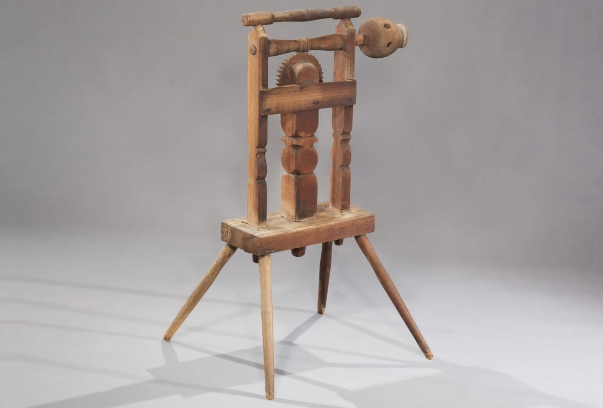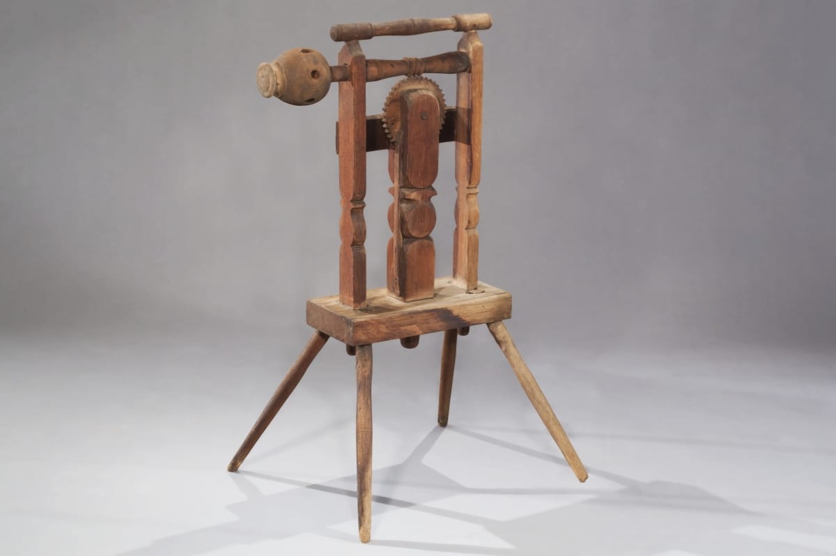 A clock reel is a device used to wind spun yarn into measured skeins. The mechanism is similar to a mechanical clock. The dial's hand is attached to gears that count off the number of times the reel revolves. The dial kept track automatically, making it easy to know how many yards had been spun--without having to keep track in one's head.
