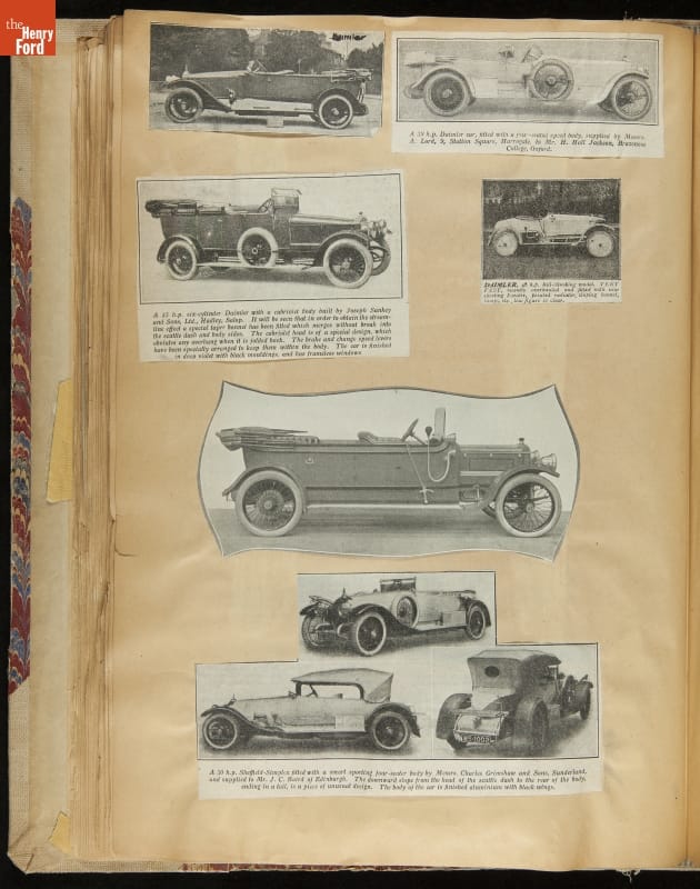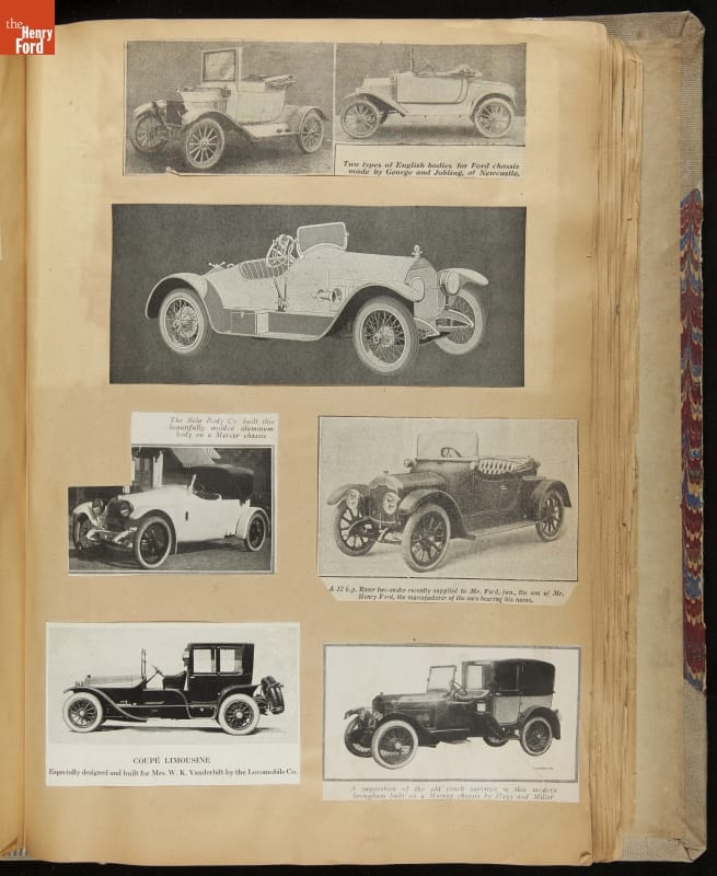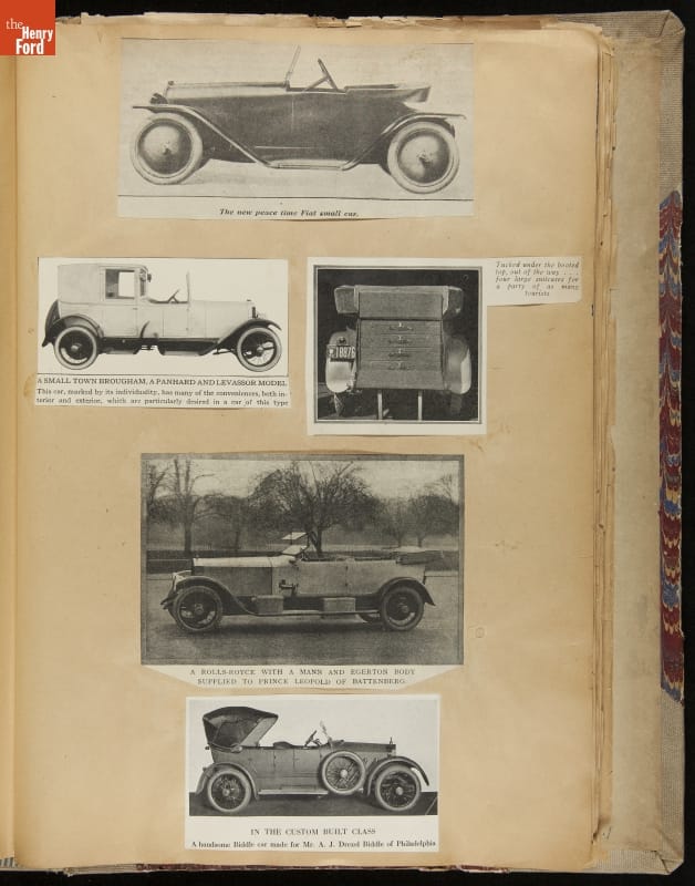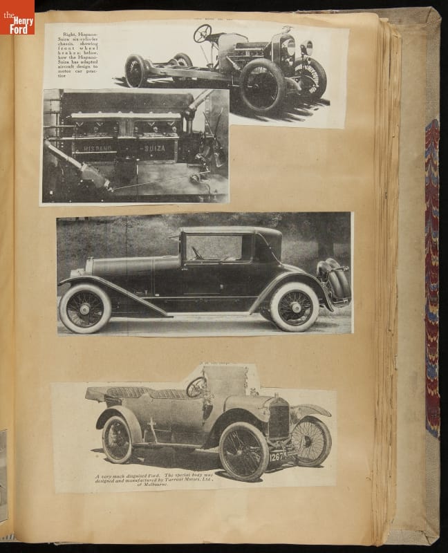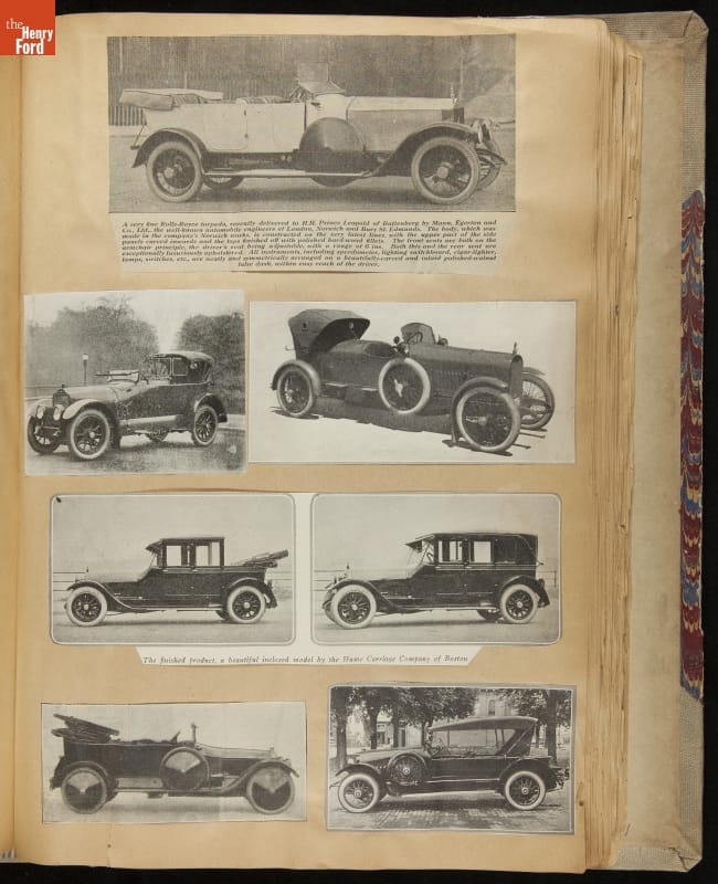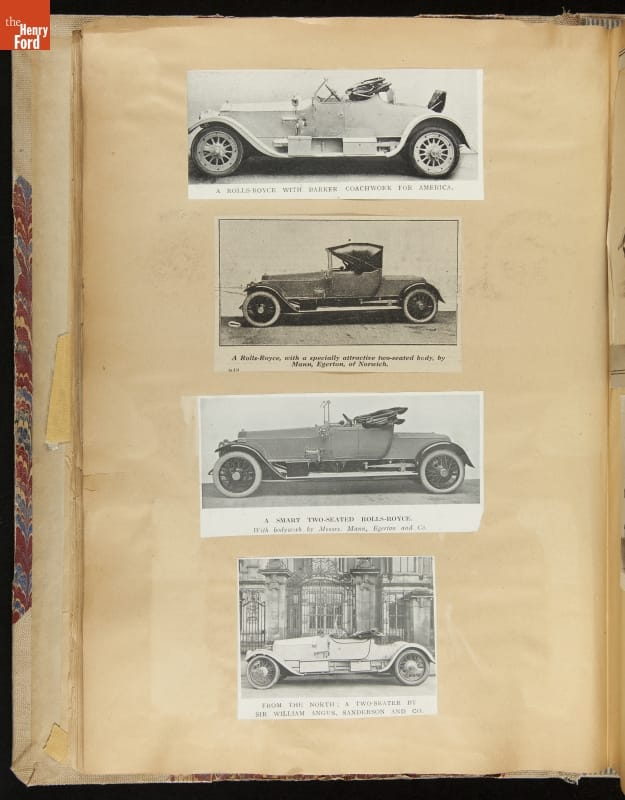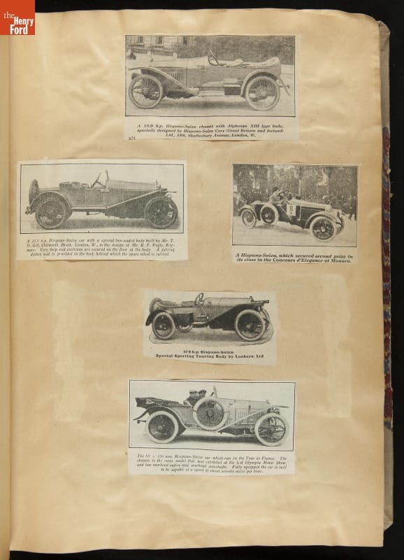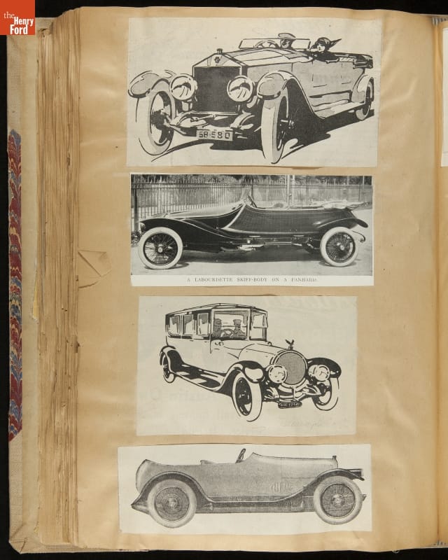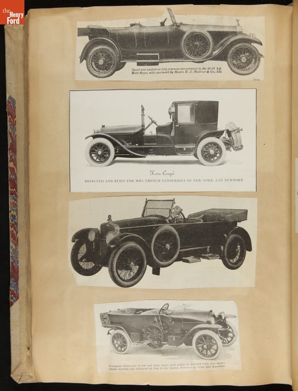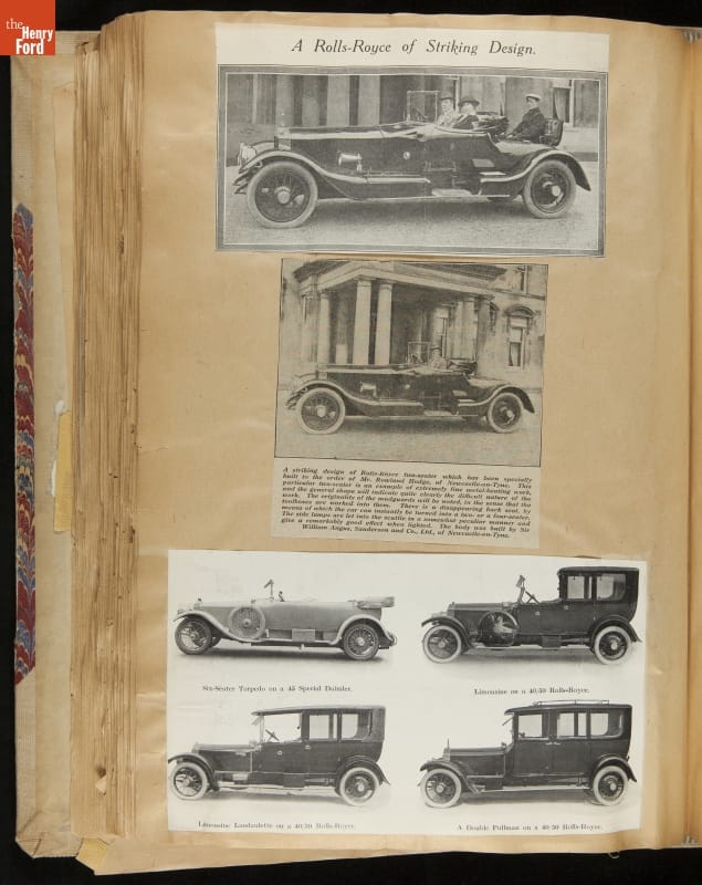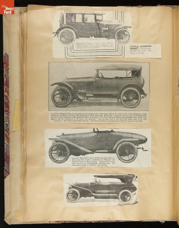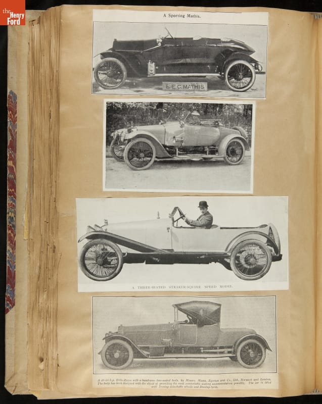 Given his father's obsession, it is no surprise that Edsel Ford was passionate about cars. While Henry Ford focused on the mechanical side of the automobile, Edsel Ford admired the aesthetics of automotive styling. This scrapbook features some of the designs that caught the younger Ford's eye. Elegant European marques like Hispano-Suiza and Rolls-Royce fill its pages.