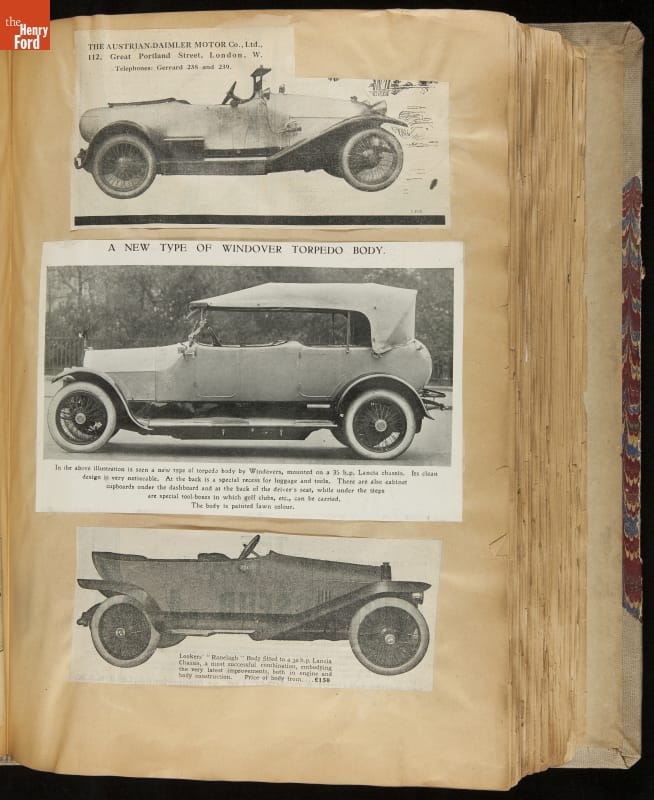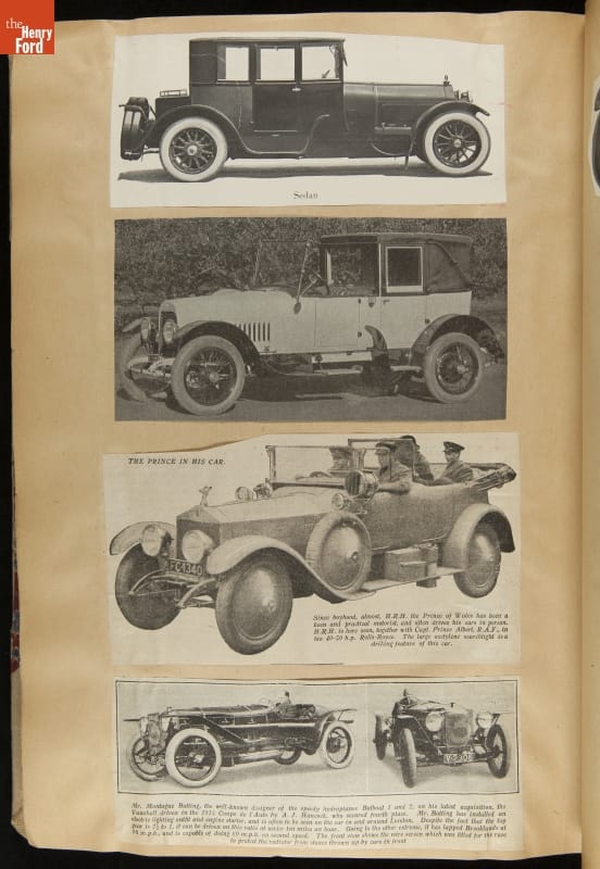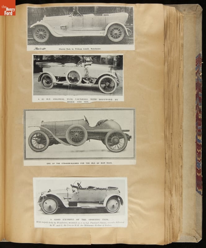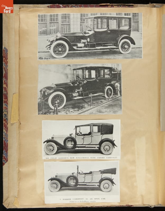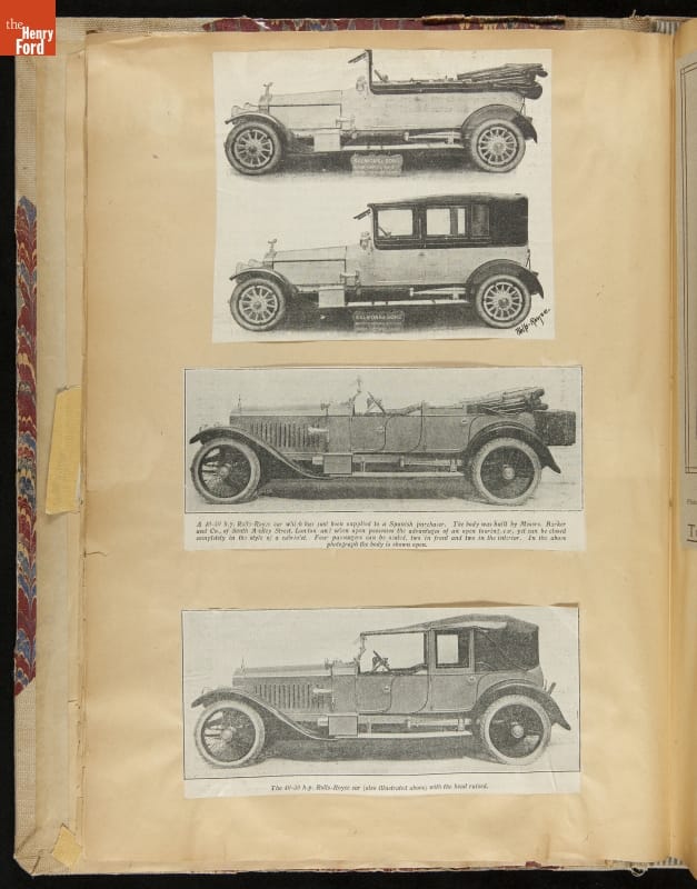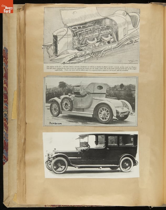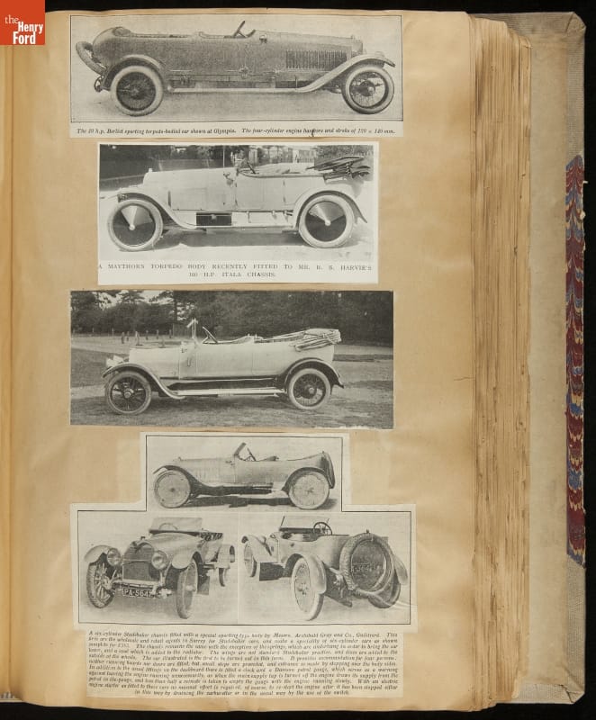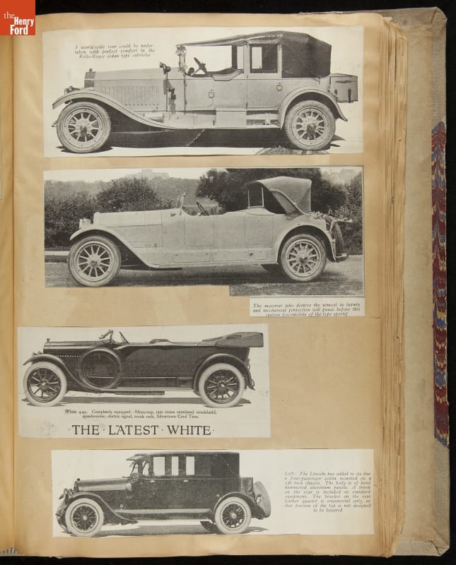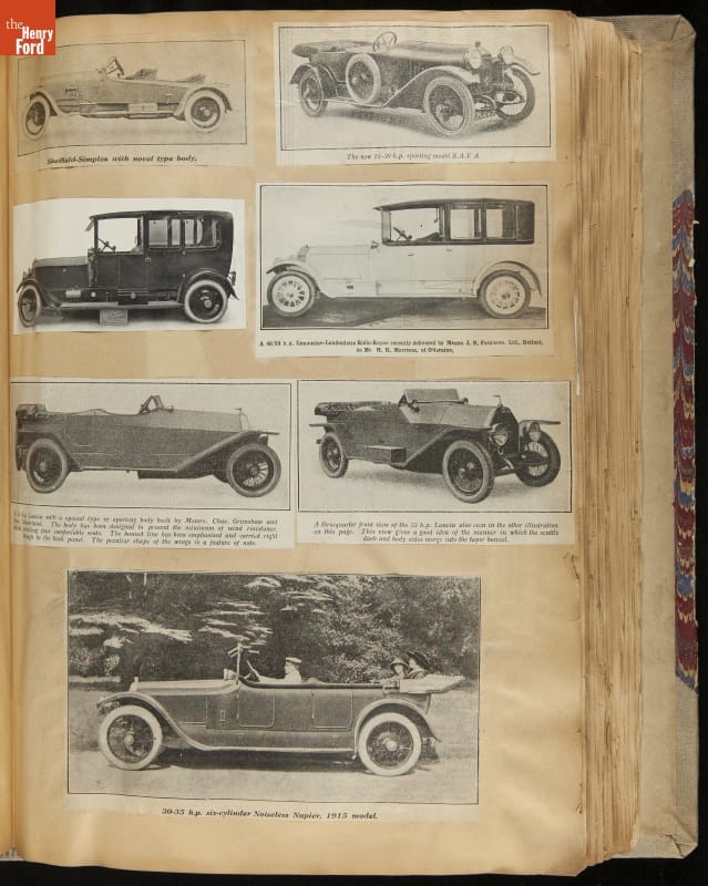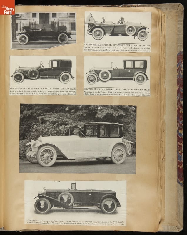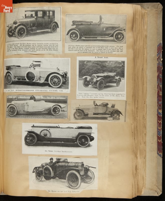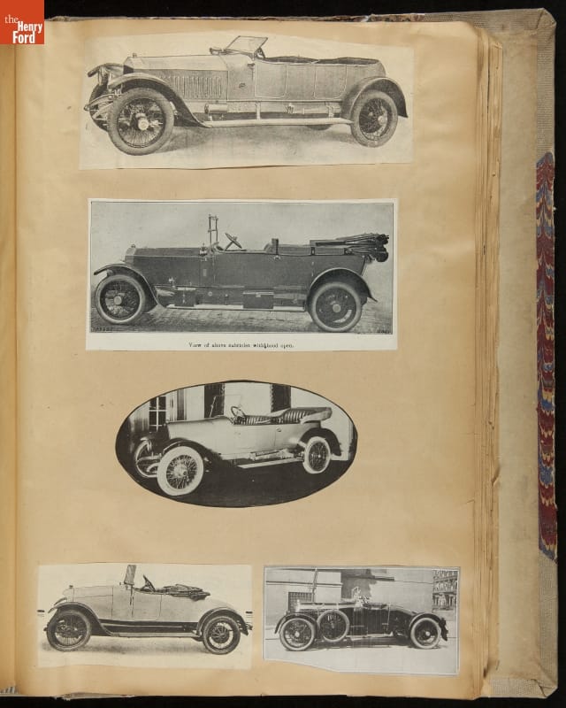 Given his father's obsession, it is no surprise that Edsel Ford was passionate about cars. While Henry Ford focused on the mechanical side of the automobile, Edsel Ford admired the aesthetics of automotive styling. This scrapbook features some of the designs that caught the younger Ford's eye. Elegant European marques like Hispano-Suiza and Rolls-Royce fill its pages.