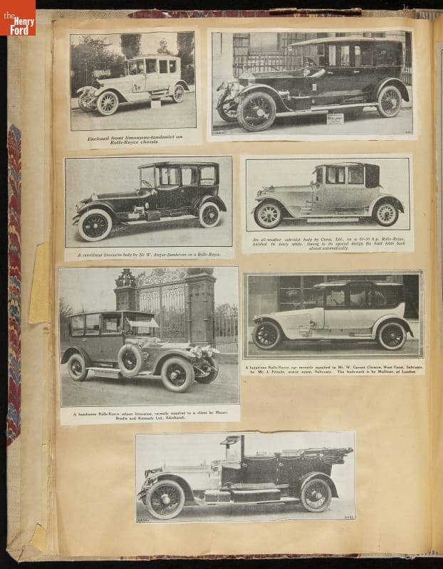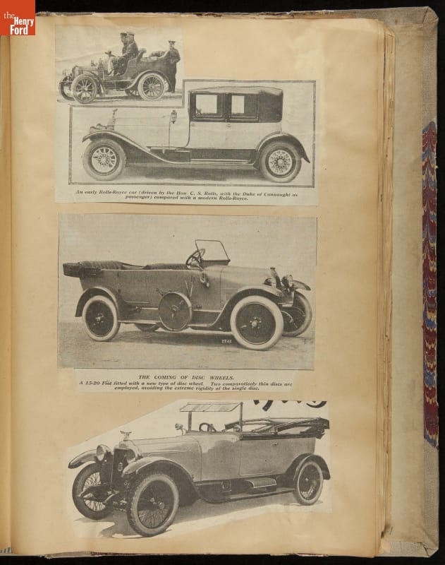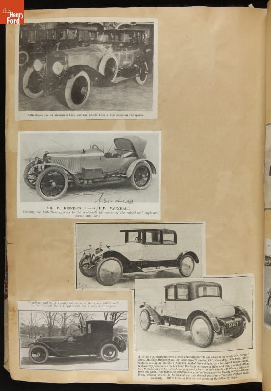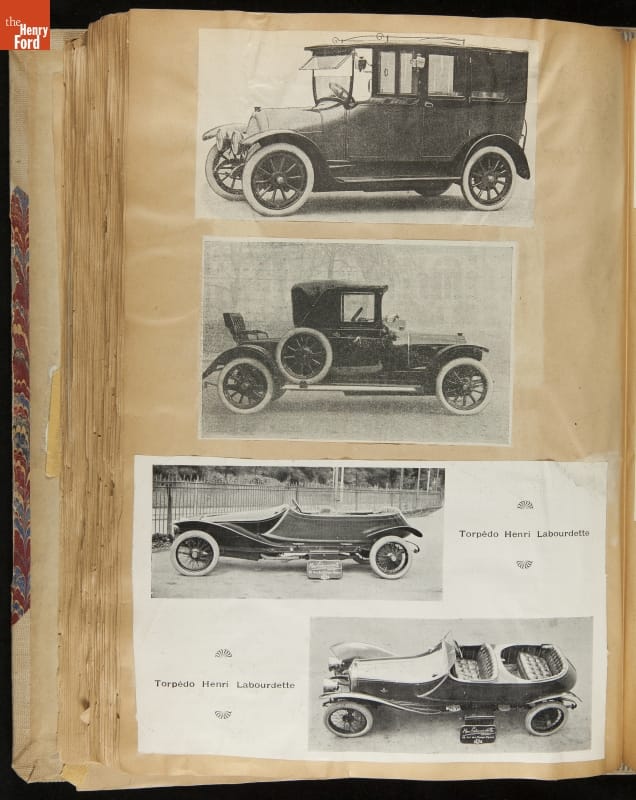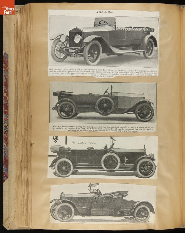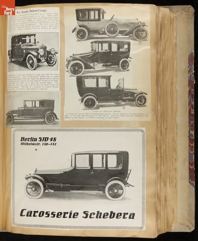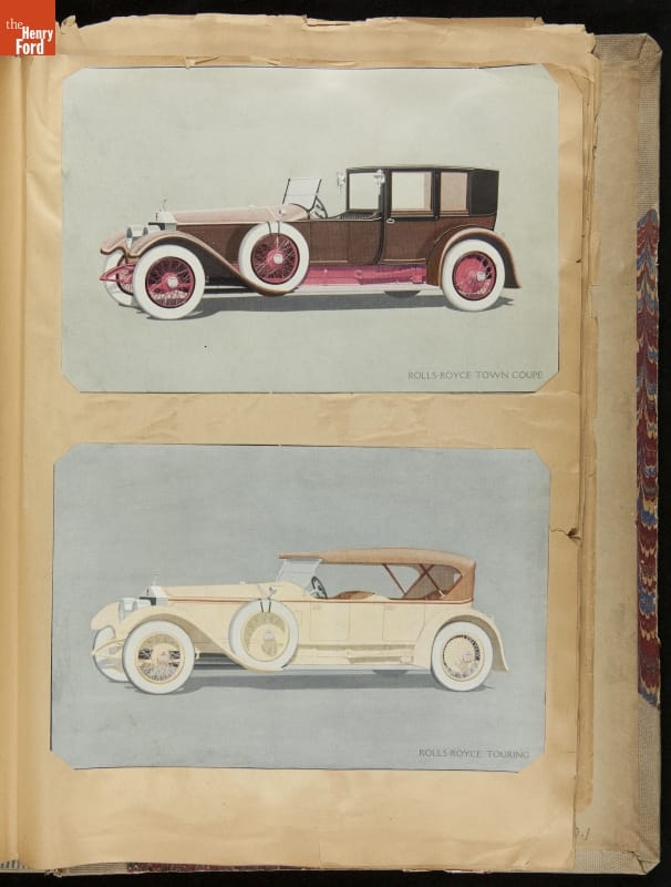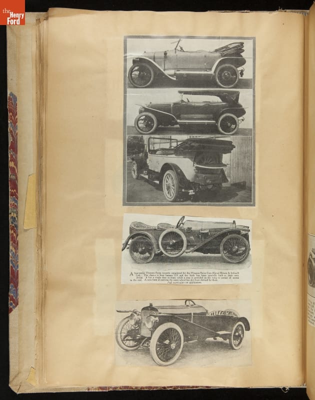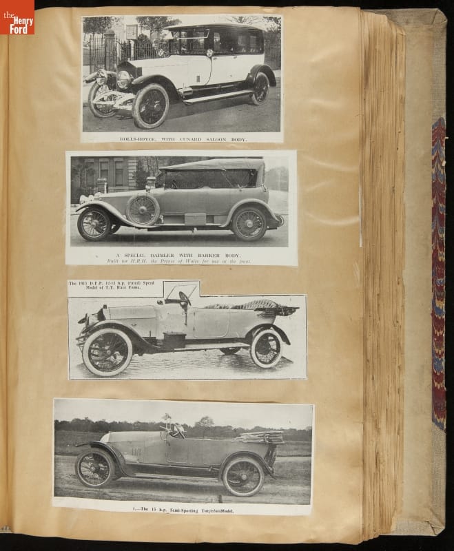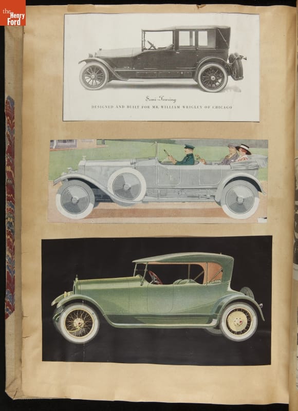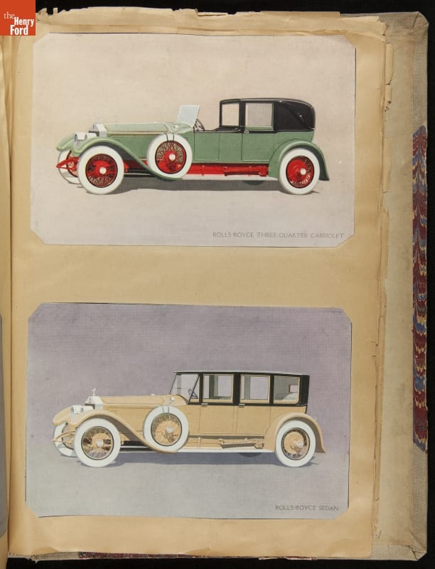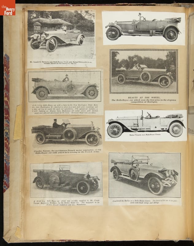 Given his father's obsession, it is no surprise that Edsel Ford was passionate about cars. While Henry Ford focused on the mechanical side of the automobile, Edsel Ford admired the aesthetics of automotive styling. This scrapbook features some of the designs that caught the younger Ford's eye. Elegant European marques like Hispano-Suiza and Rolls-Royce fill its pages.