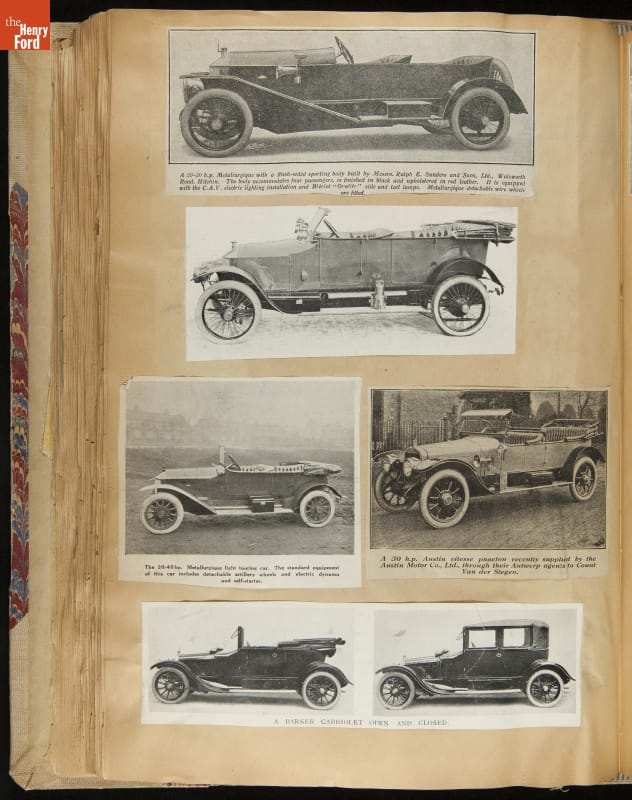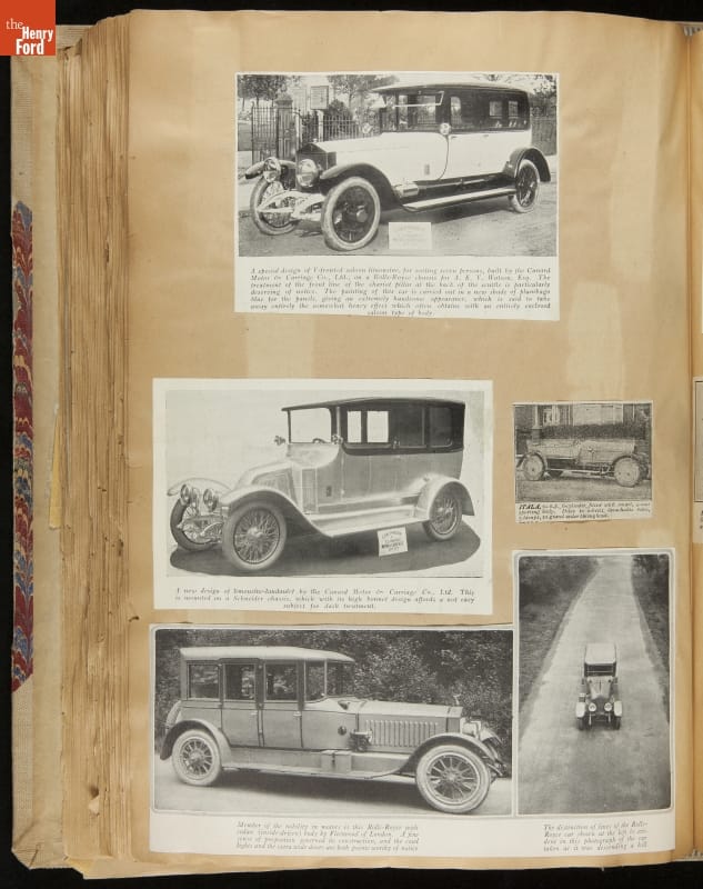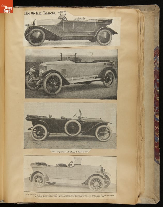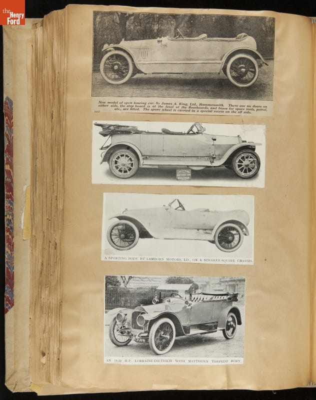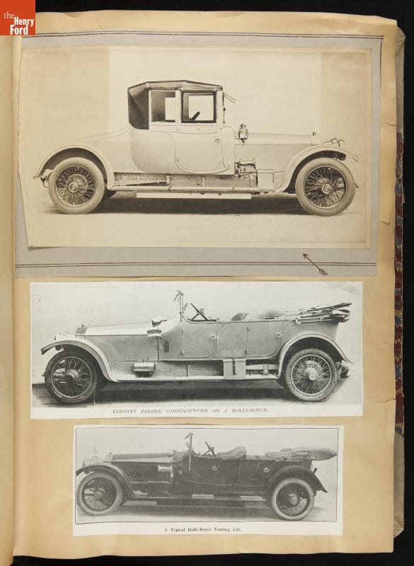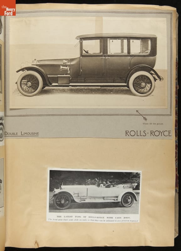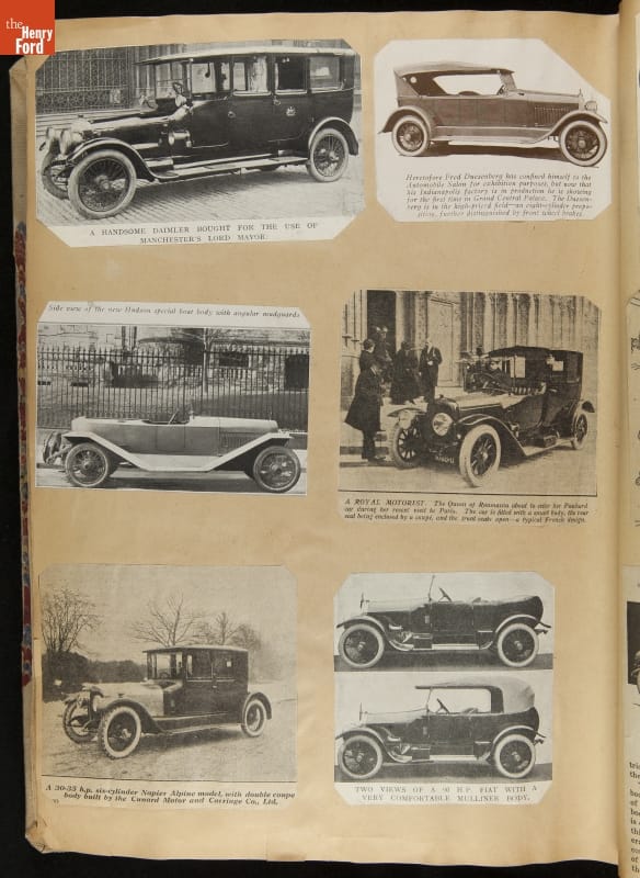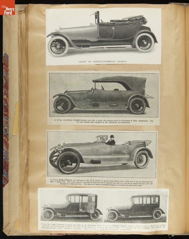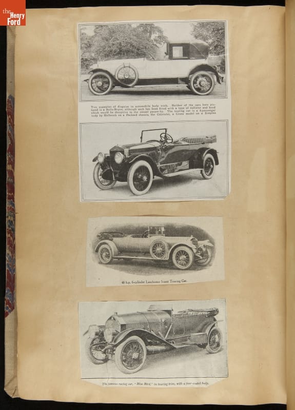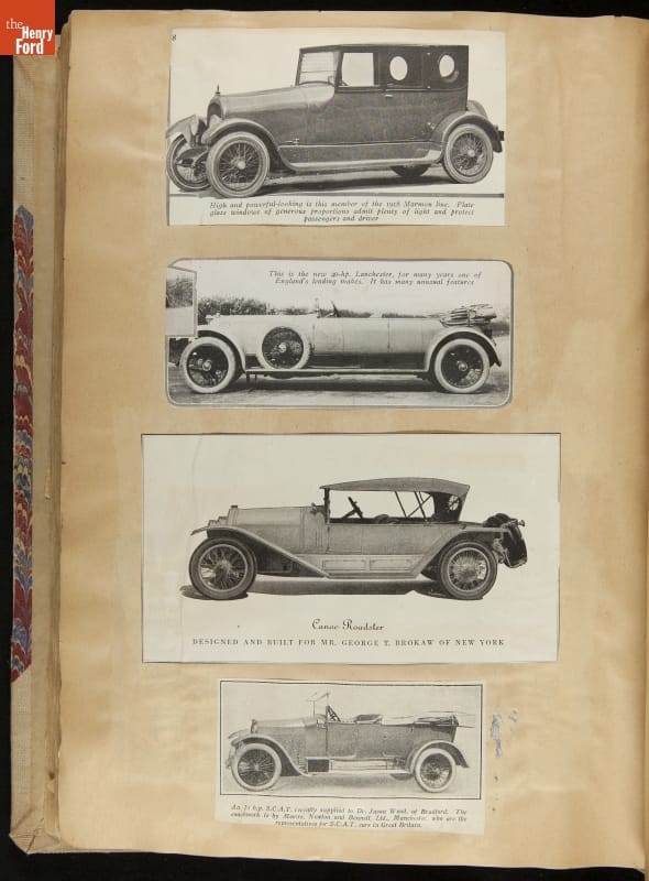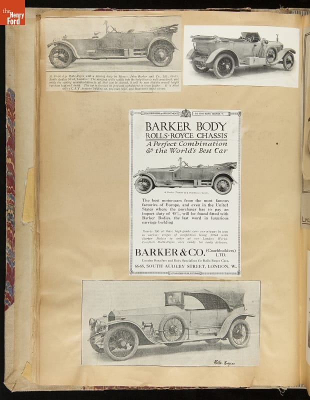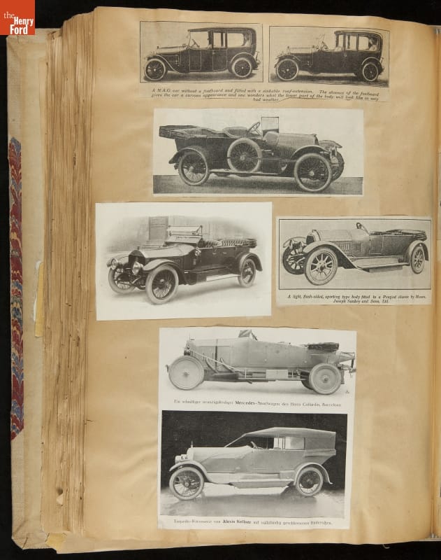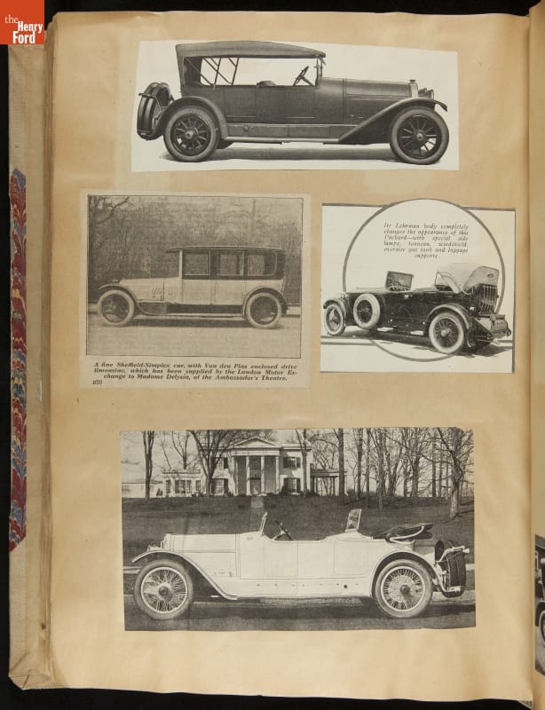 Given his father's obsession, it is no surprise that Edsel Ford was passionate about cars. While Henry Ford focused on the mechanical side of the automobile, Edsel Ford admired the aesthetics of automotive styling. This scrapbook features some of the designs that caught the younger Ford's eye. Elegant European marques like Hispano-Suiza and Rolls-Royce fill its pages.