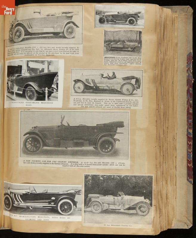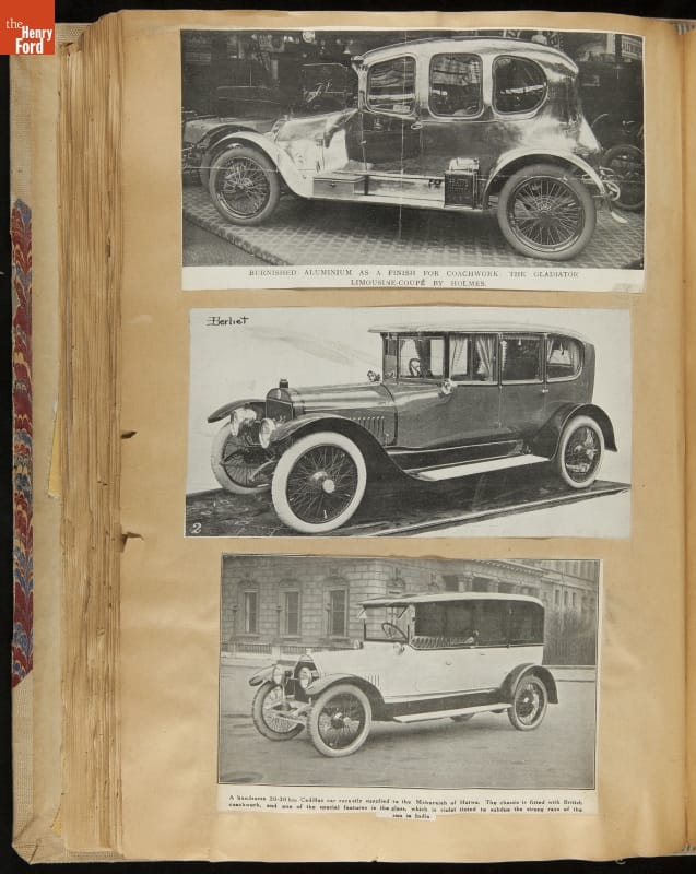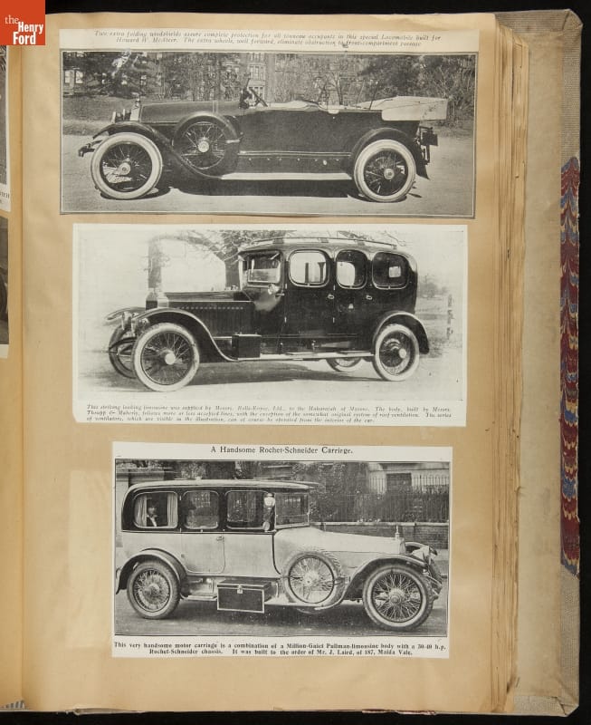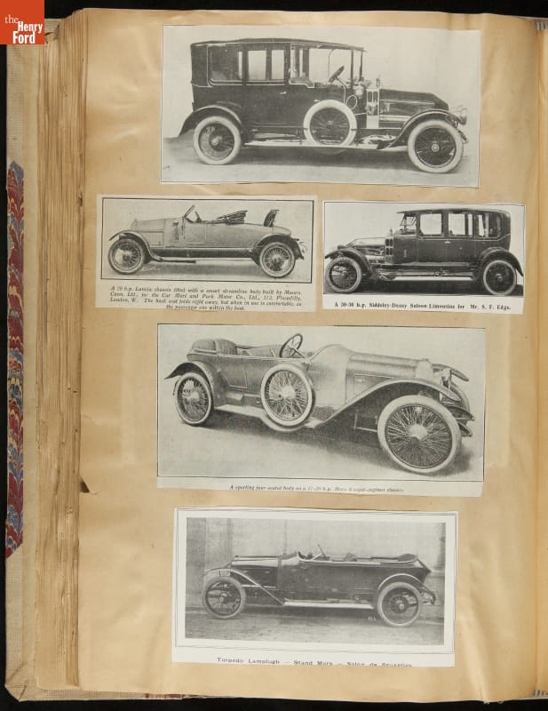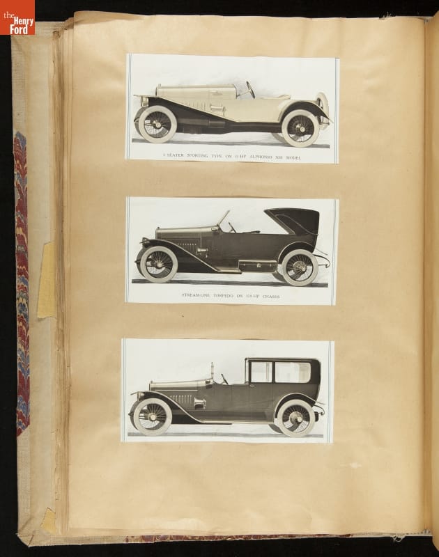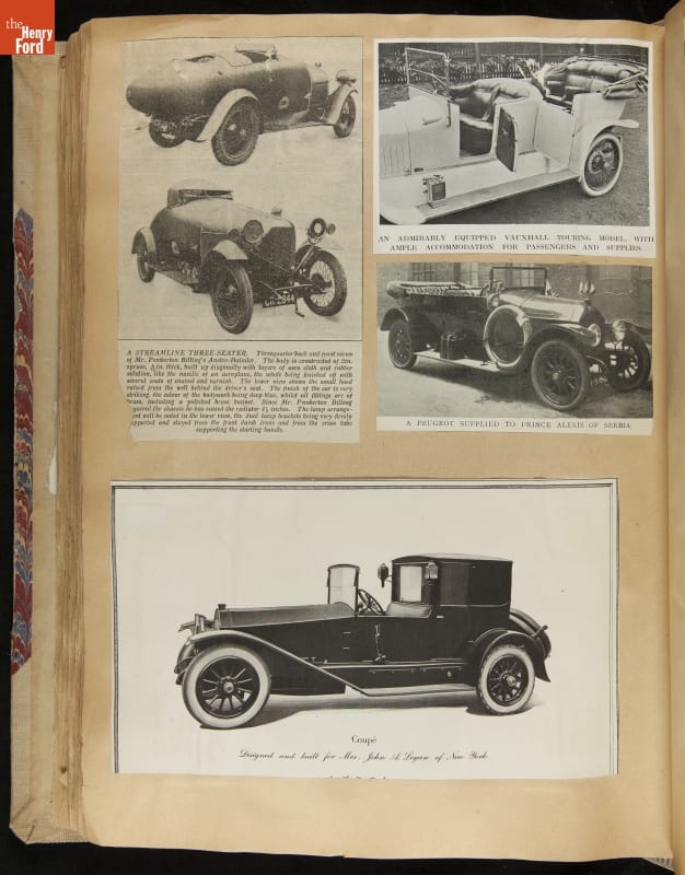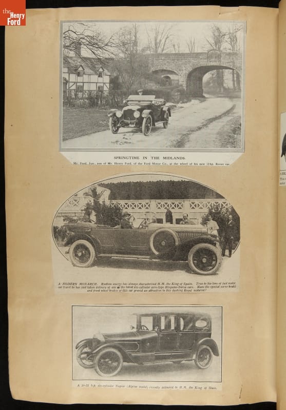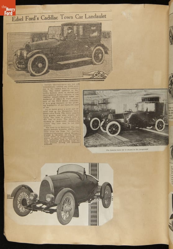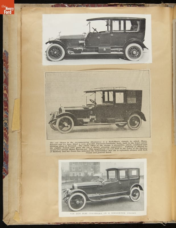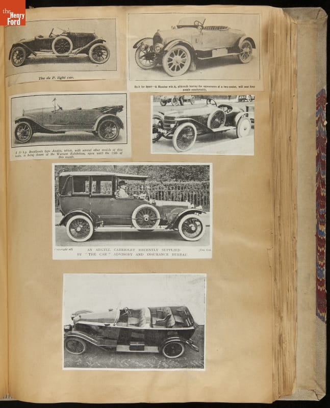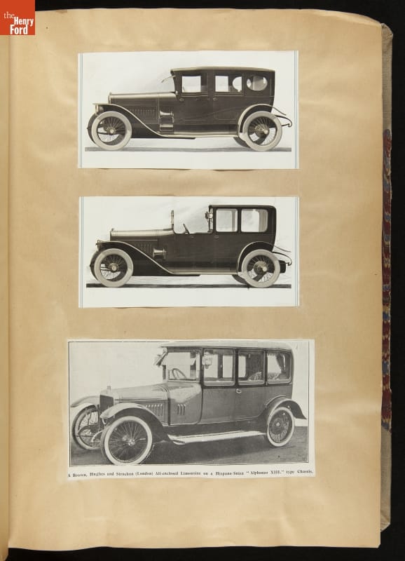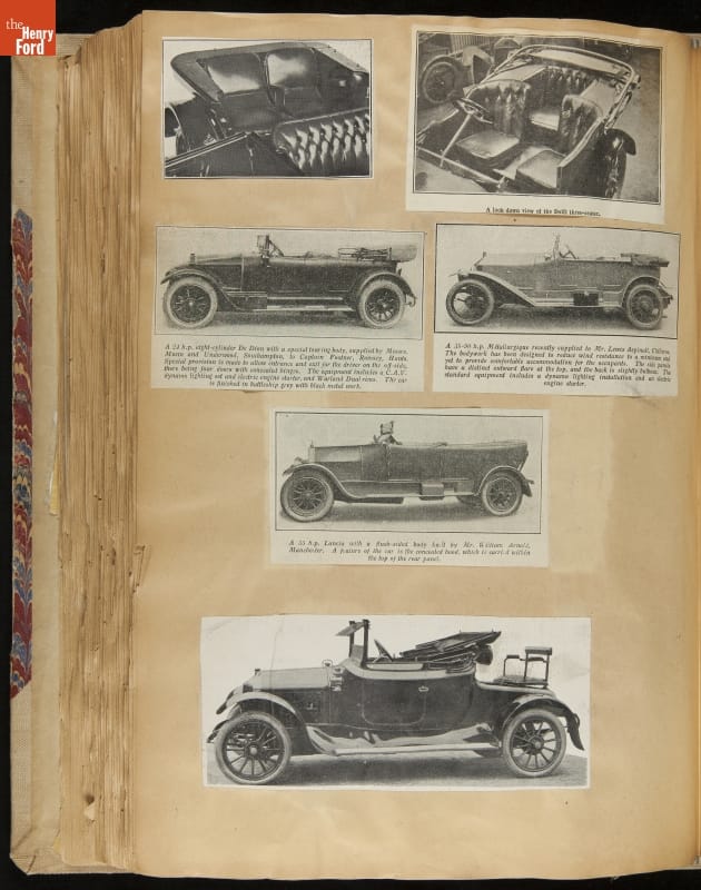 Given his father's obsession, it is no surprise that Edsel Ford was passionate about cars. While Henry Ford focused on the mechanical side of the automobile, Edsel Ford admired the aesthetics of automotive styling. This scrapbook features some of the designs that caught the younger Ford's eye. Elegant European marques like Hispano-Suiza and Rolls-Royce fill its pages.