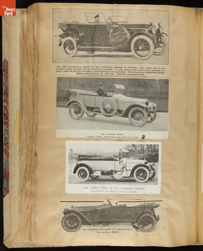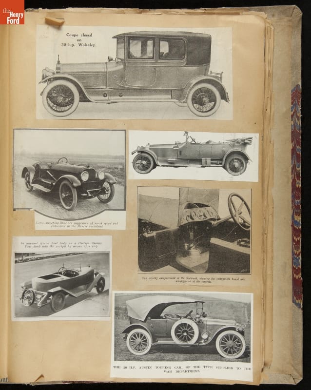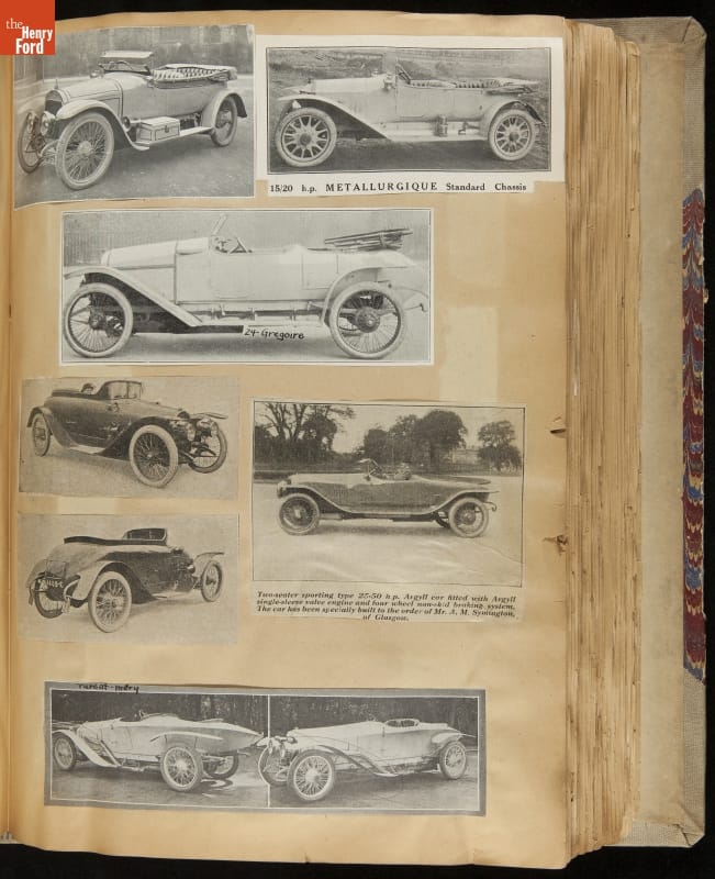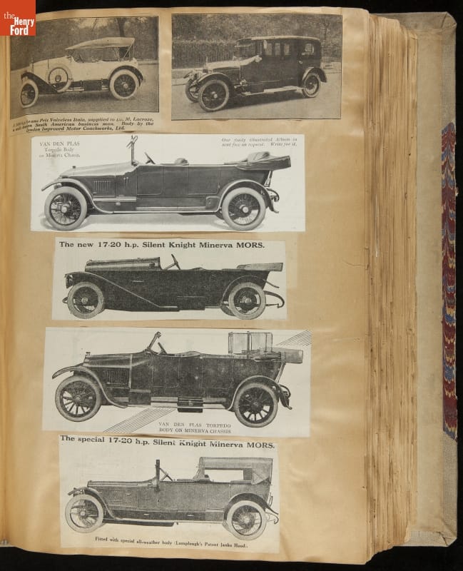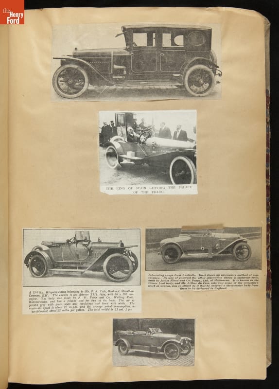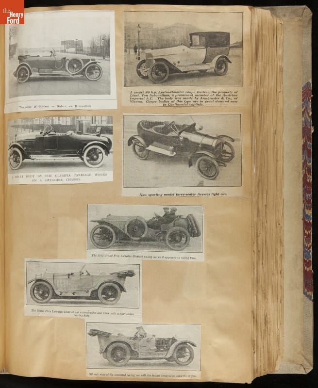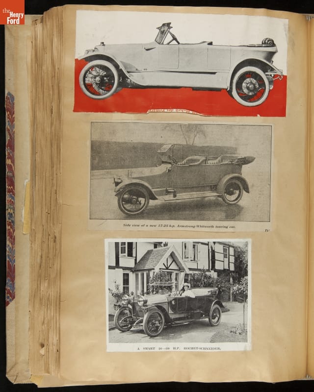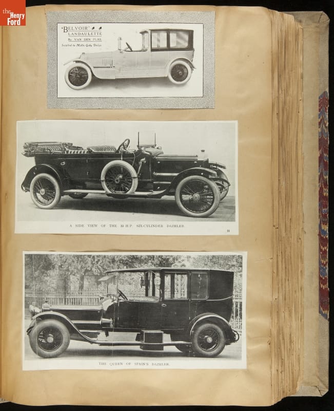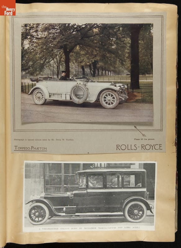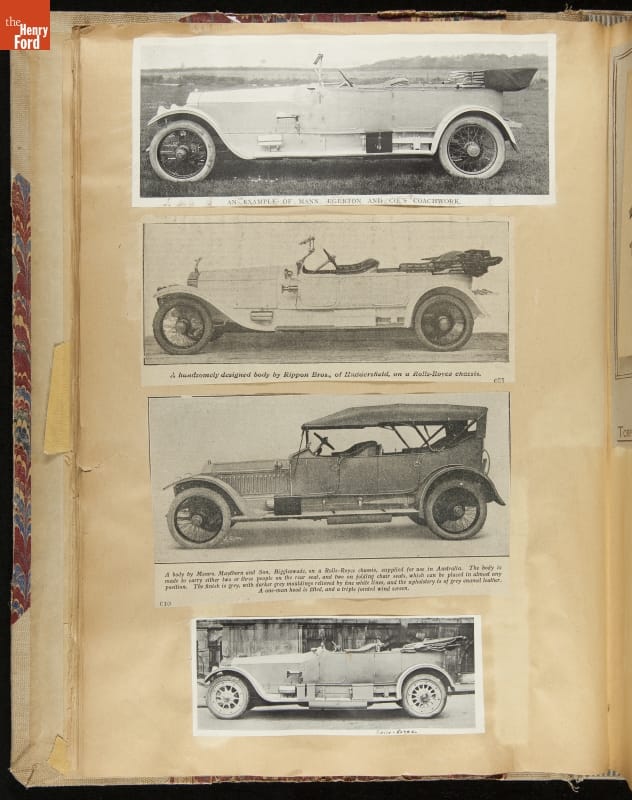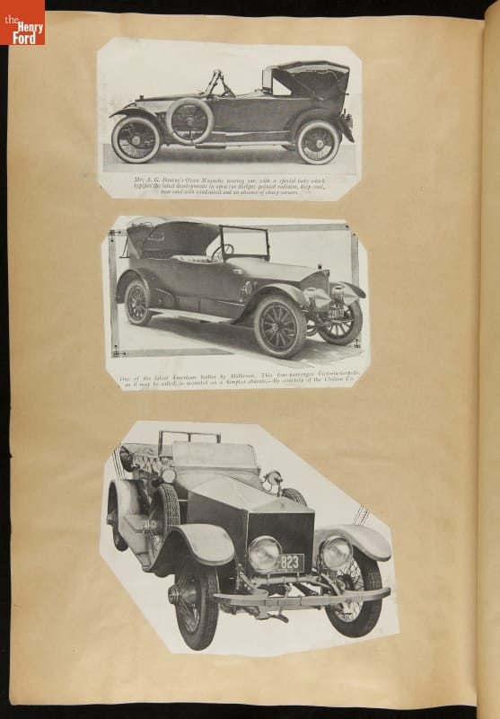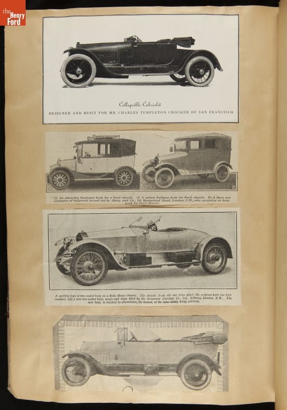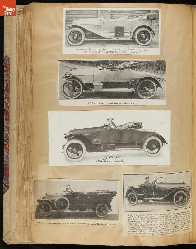 Given his father's obsession, it is no surprise that Edsel Ford was passionate about cars. While Henry Ford focused on the mechanical side of the automobile, Edsel Ford admired the aesthetics of automotive styling. This scrapbook features some of the designs that caught the younger Ford's eye. Elegant European marques like Hispano-Suiza and Rolls-Royce fill its pages.