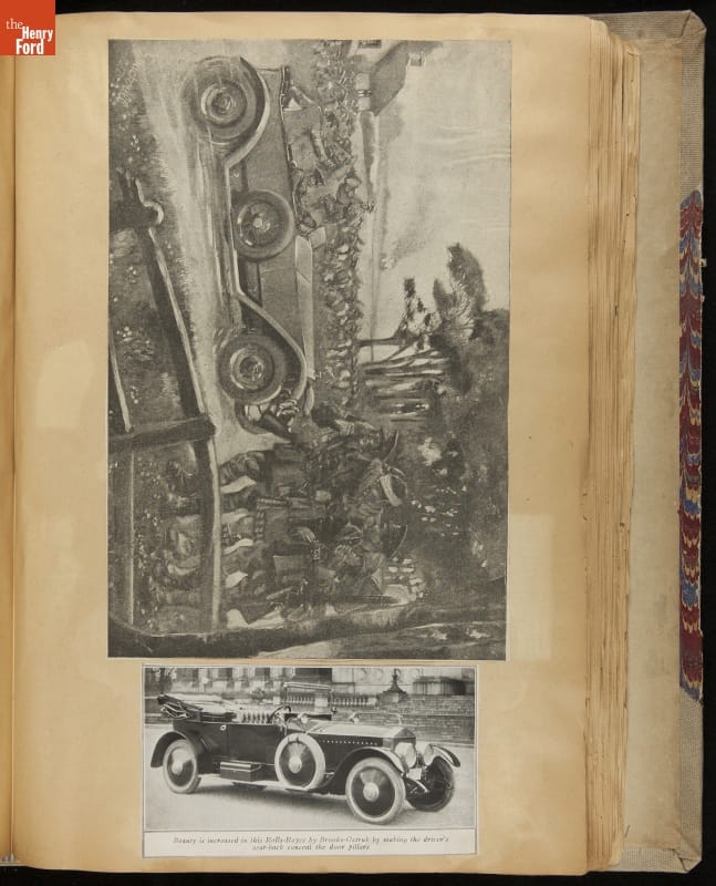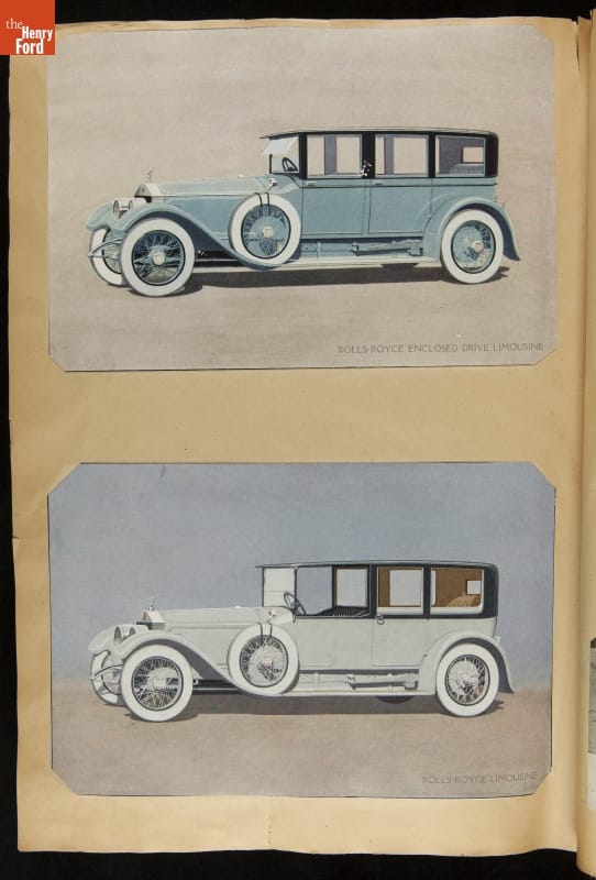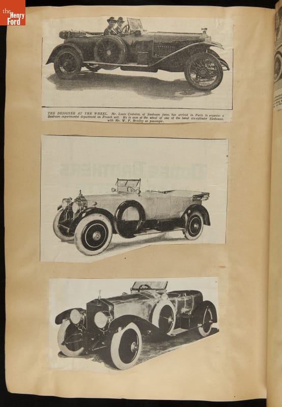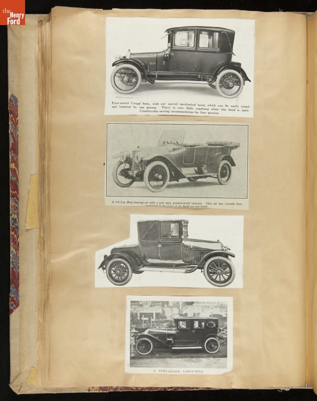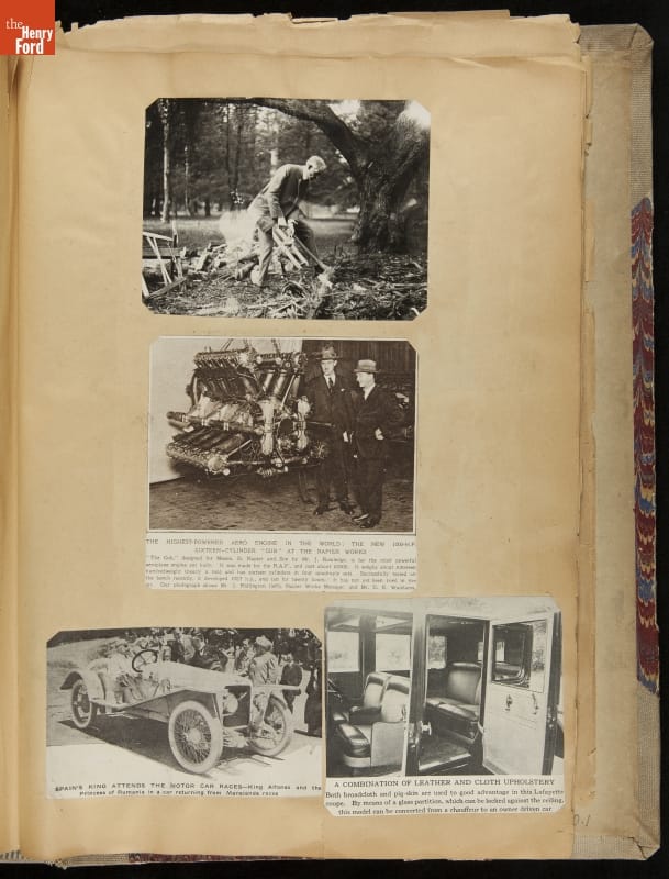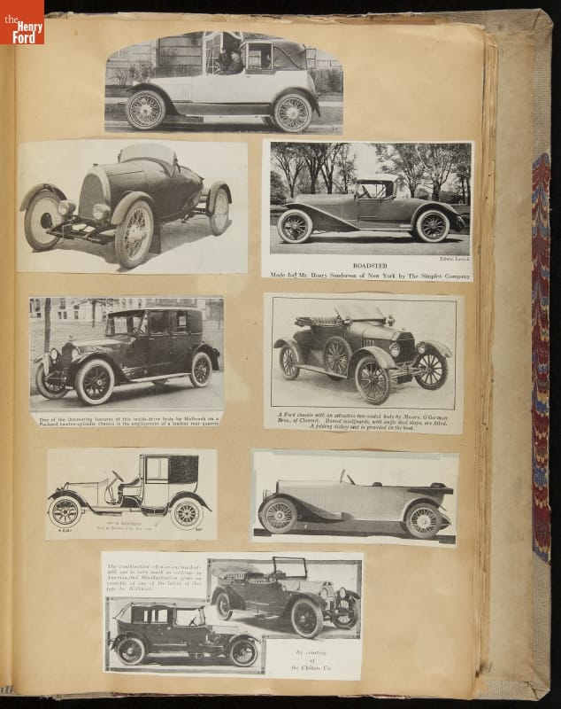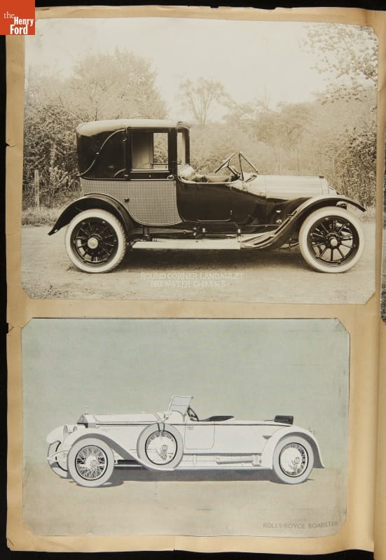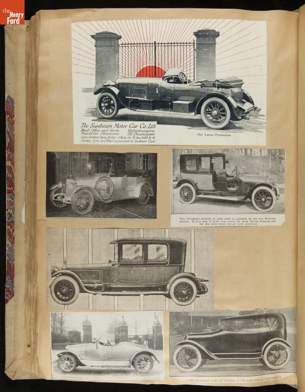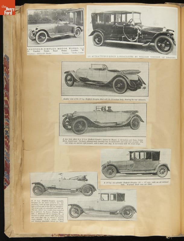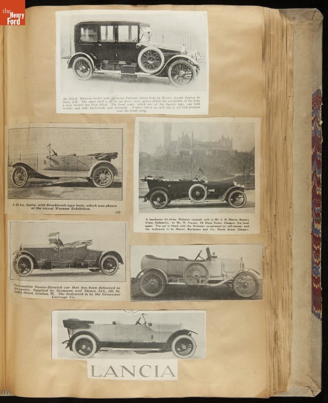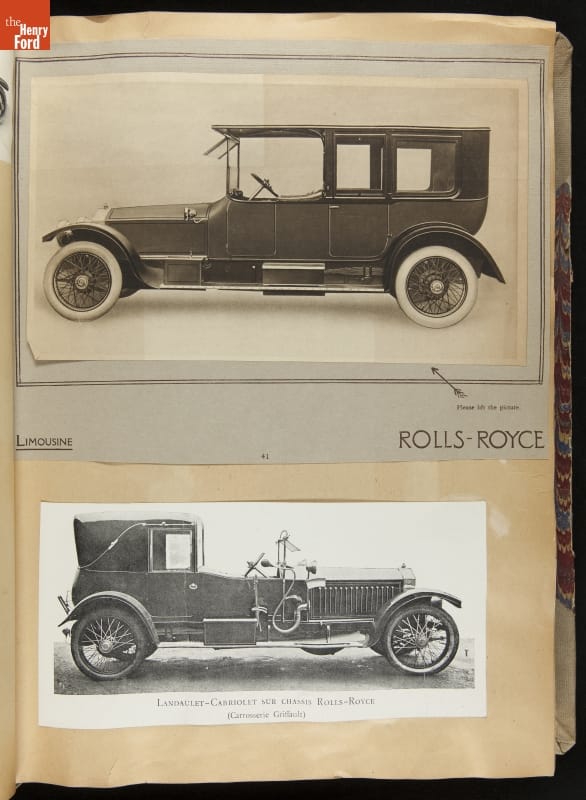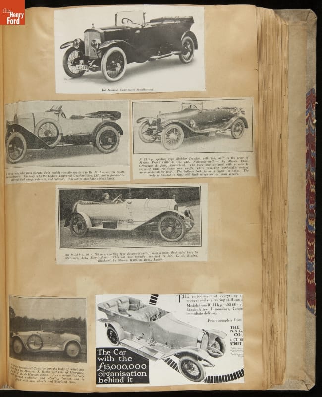 Given his father's obsession, it is no surprise that Edsel Ford was passionate about cars. While Henry Ford focused on the mechanical side of the automobile, Edsel Ford admired the aesthetics of automotive styling. This scrapbook features some of the designs that caught the younger Ford's eye. Elegant European marques like Hispano-Suiza and Rolls-Royce fill its pages.