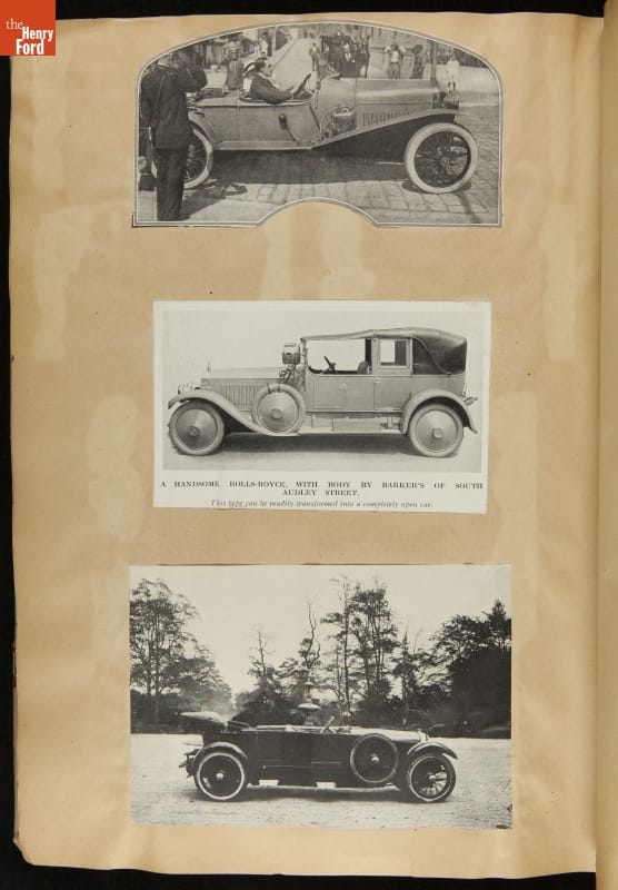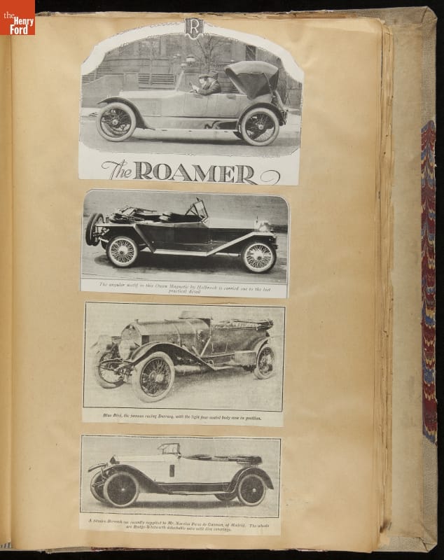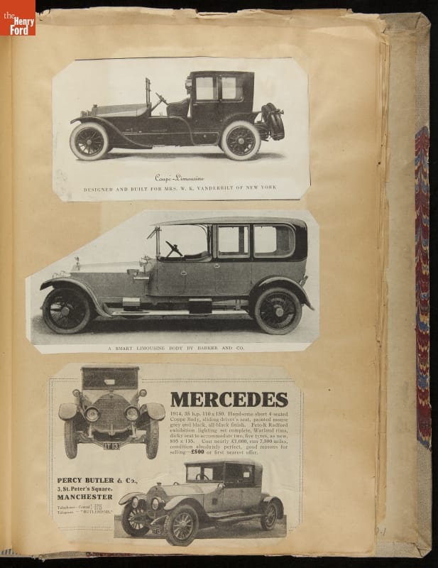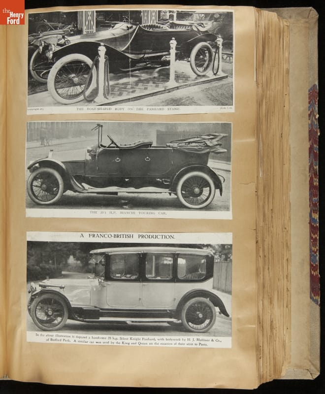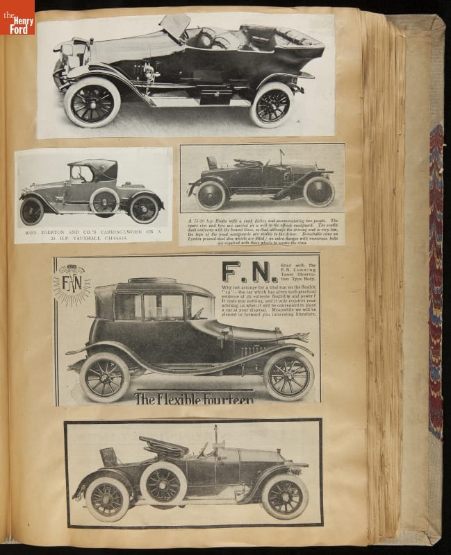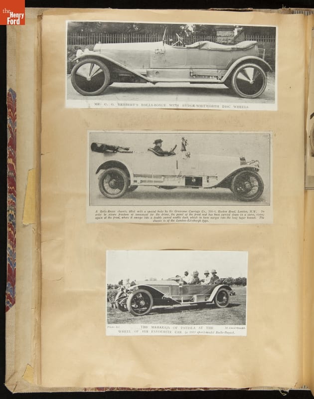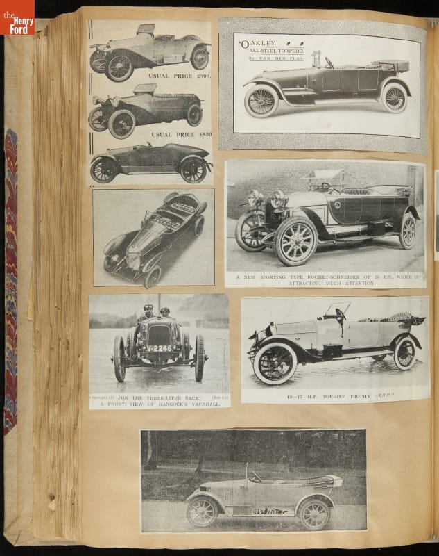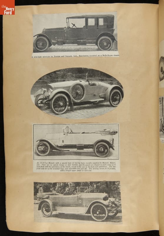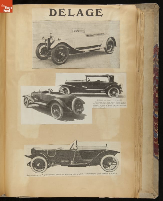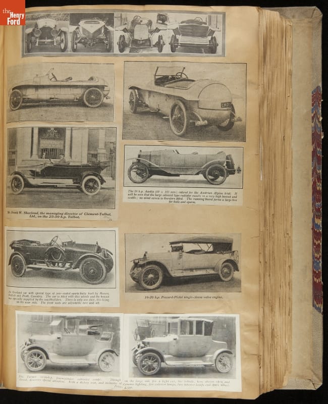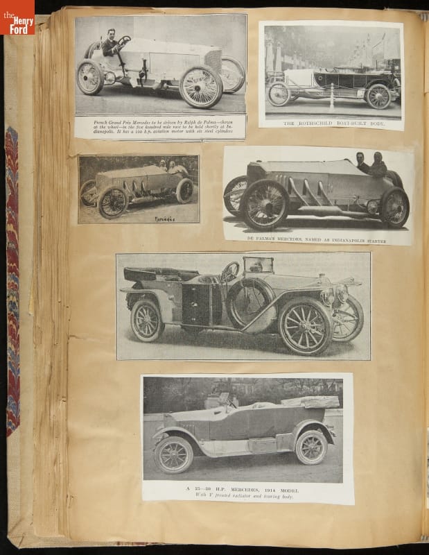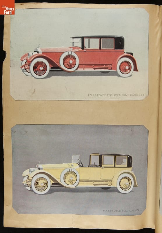 Given his father's obsession, it is no surprise that Edsel Ford was passionate about cars. While Henry Ford focused on the mechanical side of the automobile, Edsel Ford admired the aesthetics of automotive styling. This scrapbook features some of the designs that caught the younger Ford's eye. Elegant European marques like Hispano-Suiza and Rolls-Royce fill its pages.