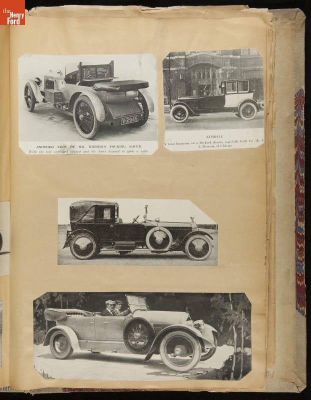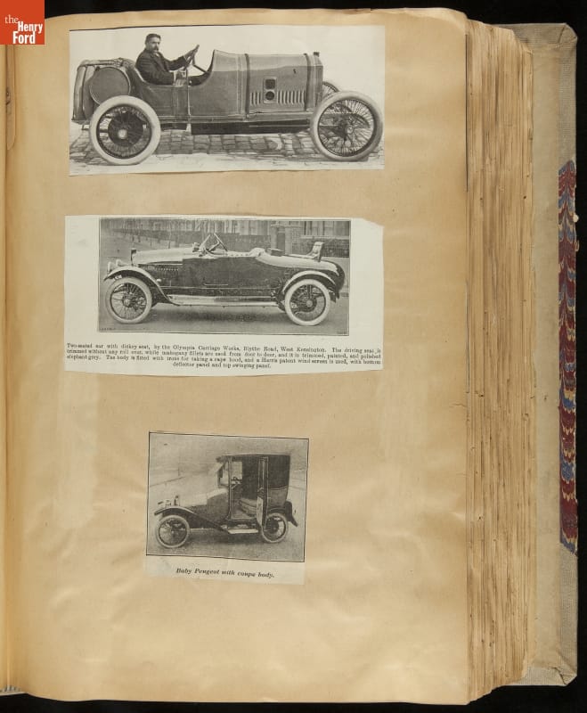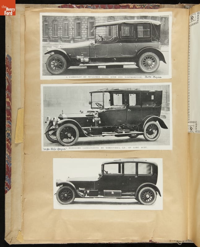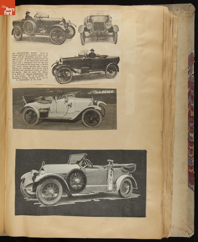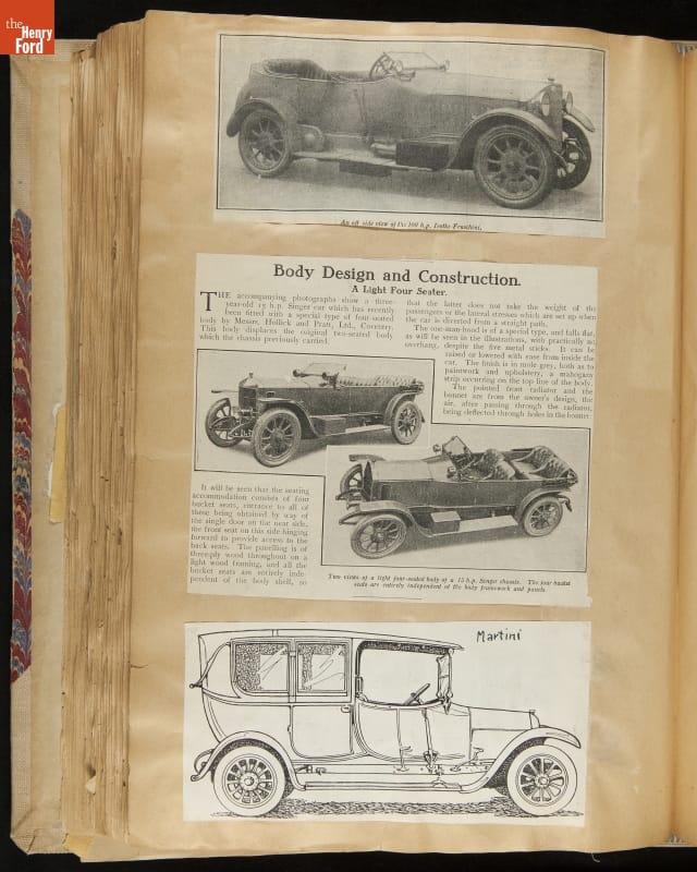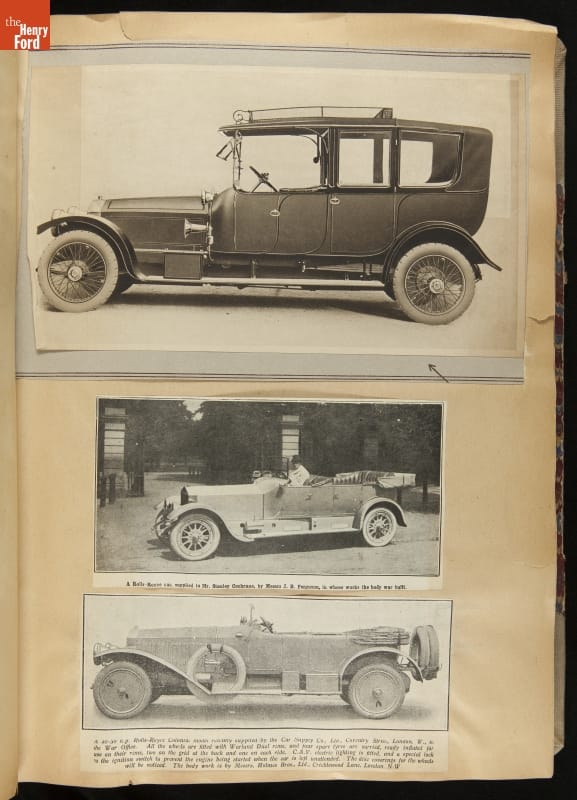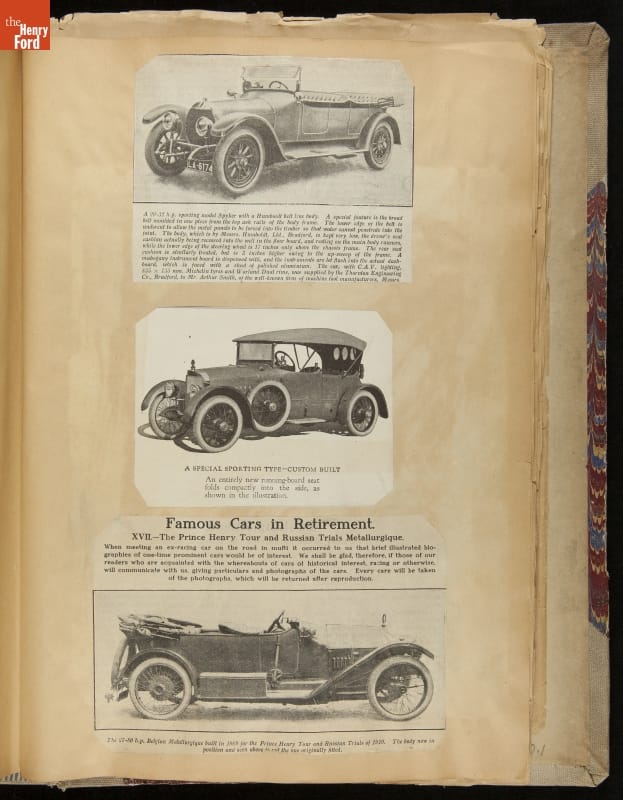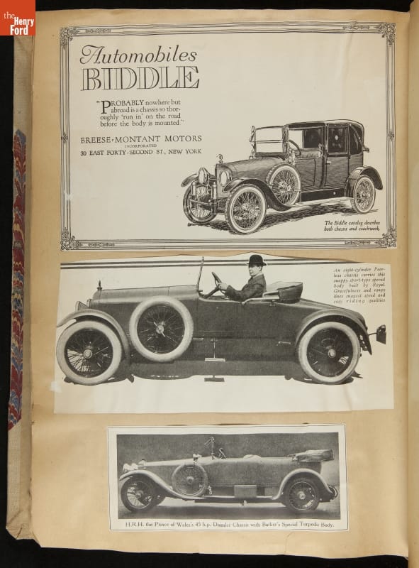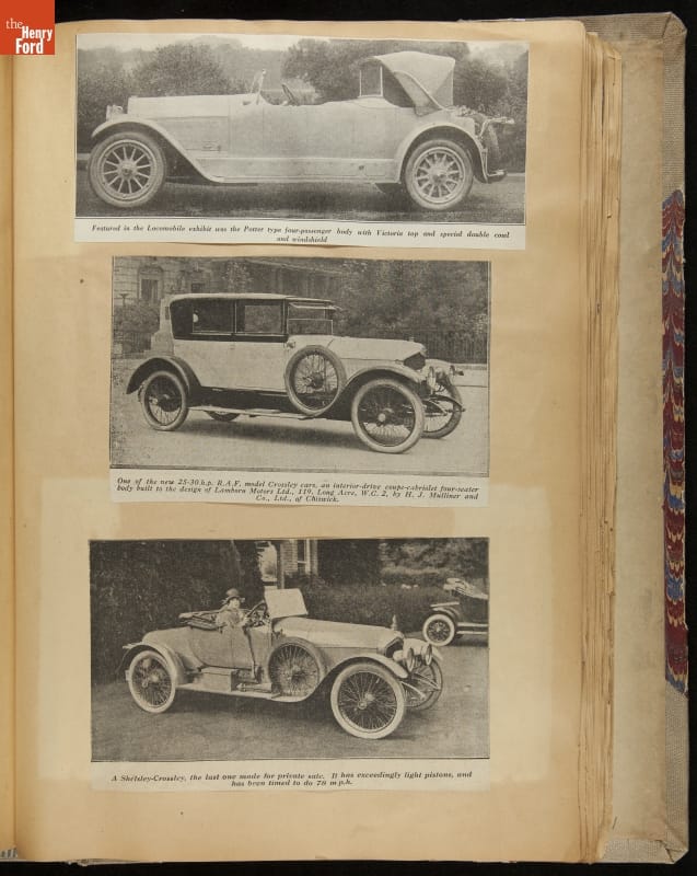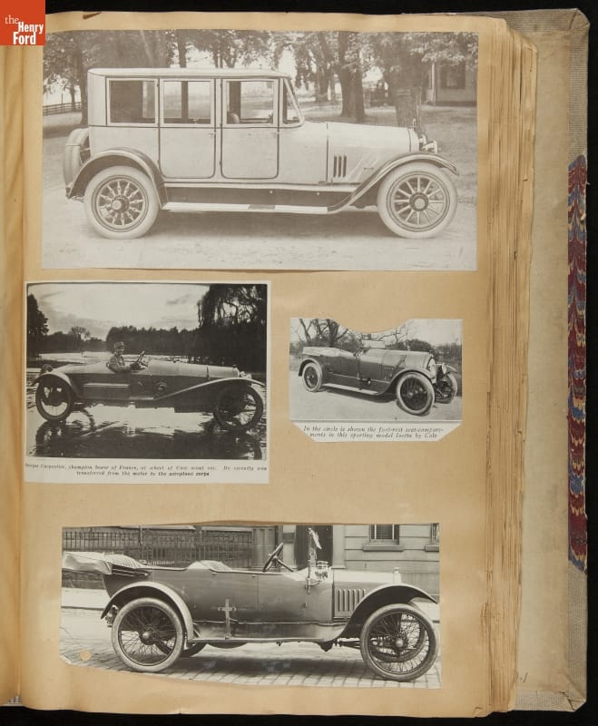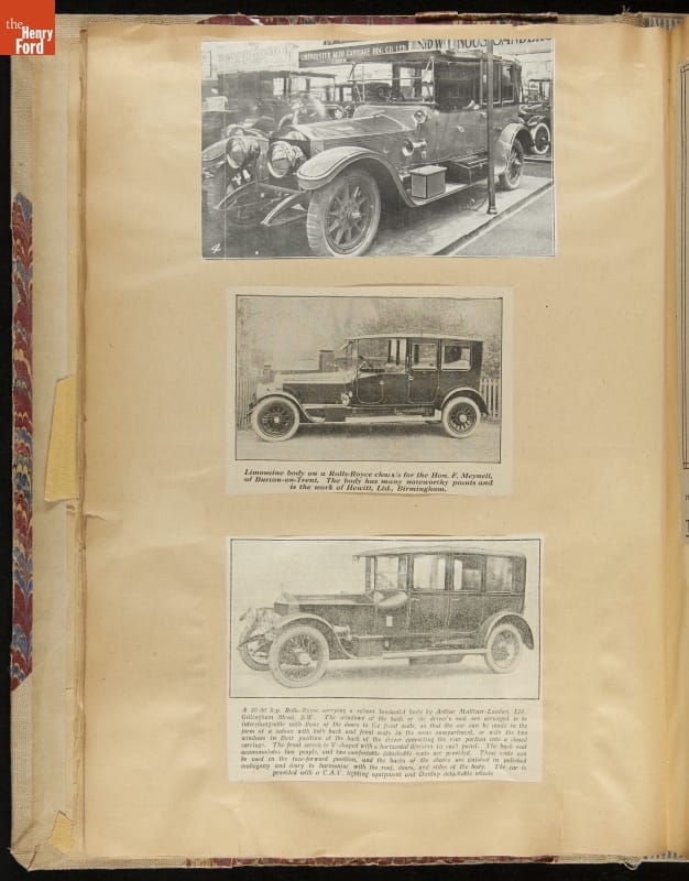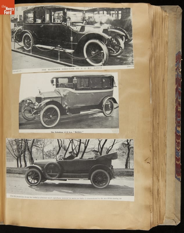 Given his father's obsession, it is no surprise that Edsel Ford was passionate about cars. While Henry Ford focused on the mechanical side of the automobile, Edsel Ford admired the aesthetics of automotive styling. This scrapbook features some of the designs that caught the younger Ford's eye. Elegant European marques like Hispano-Suiza and Rolls-Royce fill its pages.