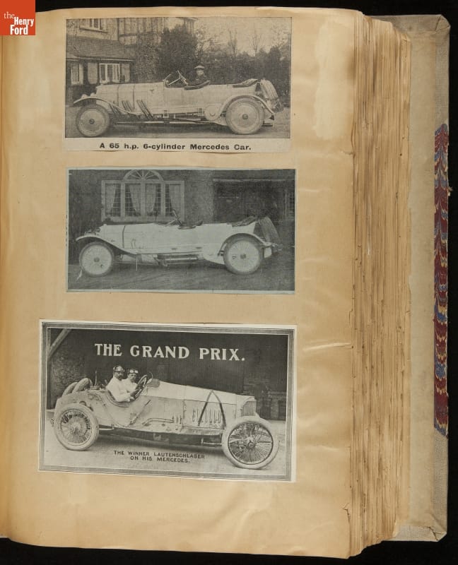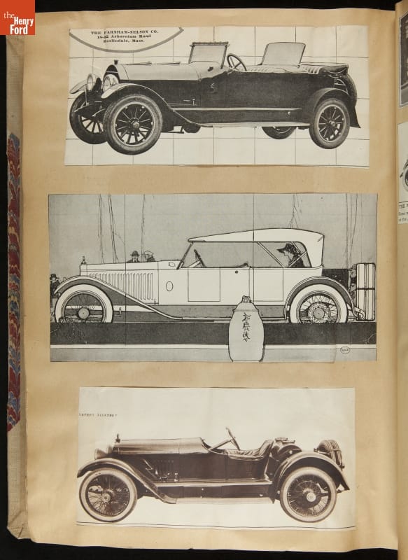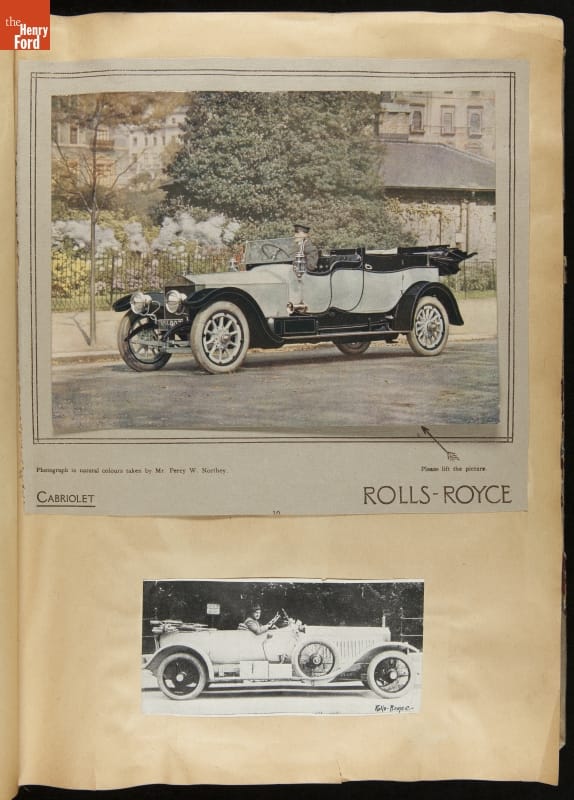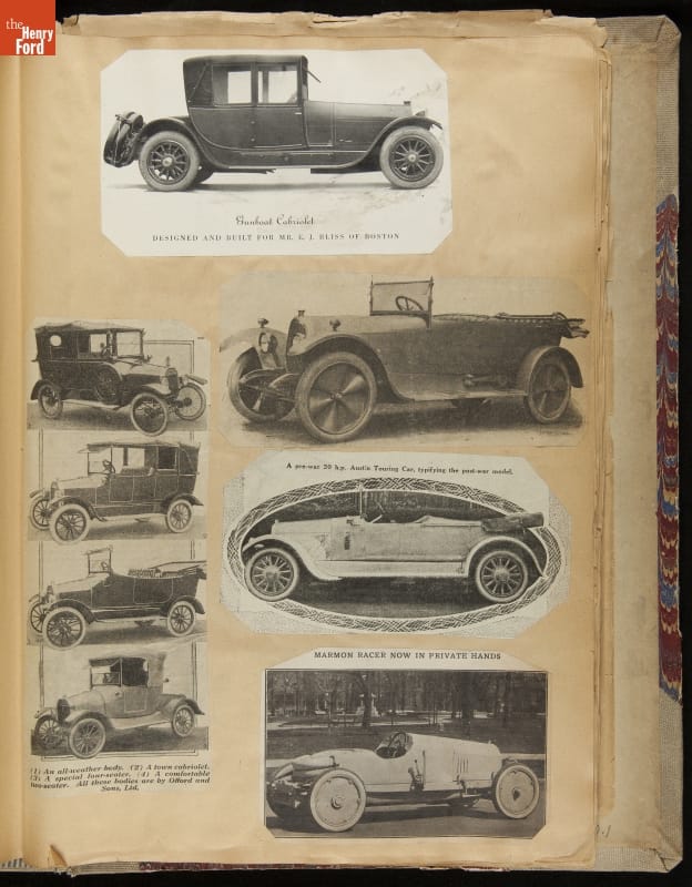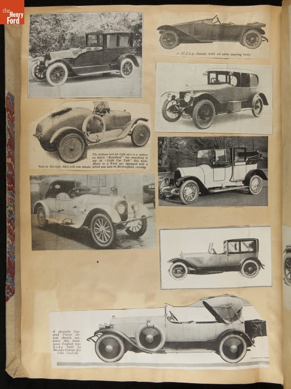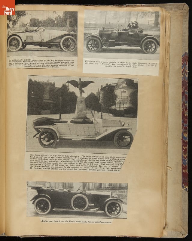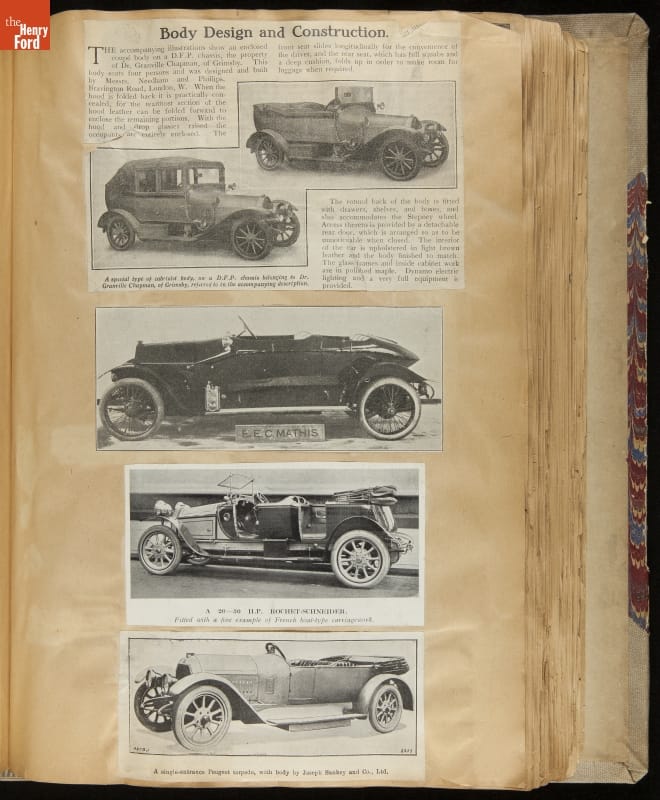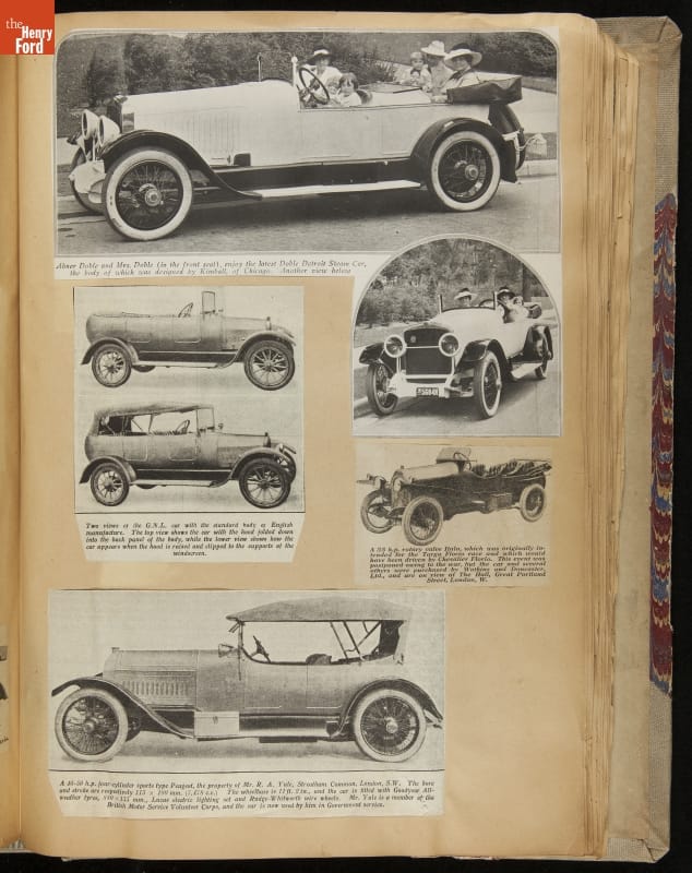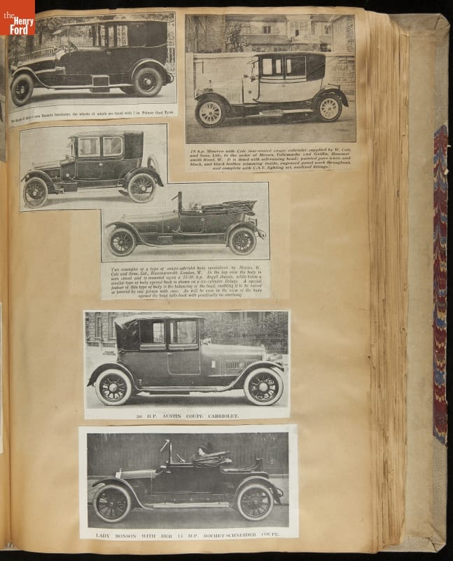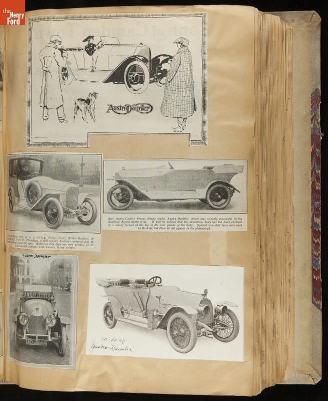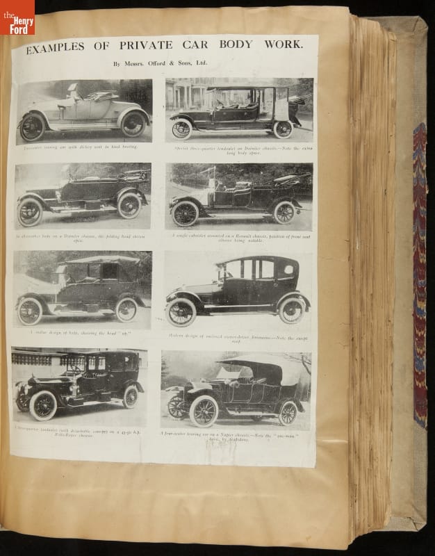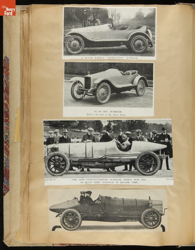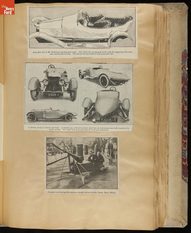 Given his father's obsession, it is no surprise that Edsel Ford was passionate about cars. While Henry Ford focused on the mechanical side of the automobile, Edsel Ford admired the aesthetics of automotive styling. This scrapbook features some of the designs that caught the younger Ford's eye. Elegant European marques like Hispano-Suiza and Rolls-Royce fill its pages.