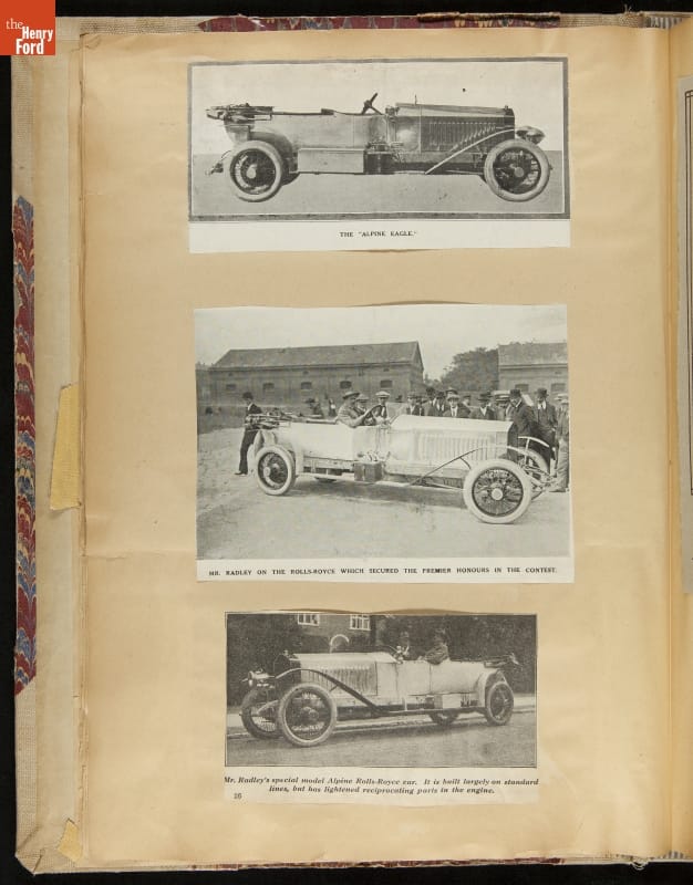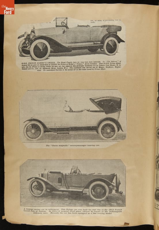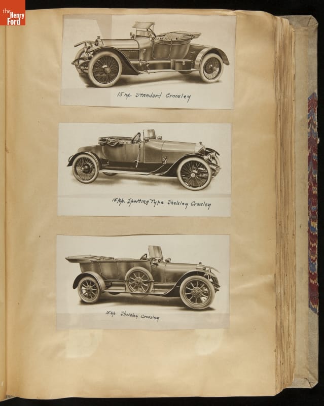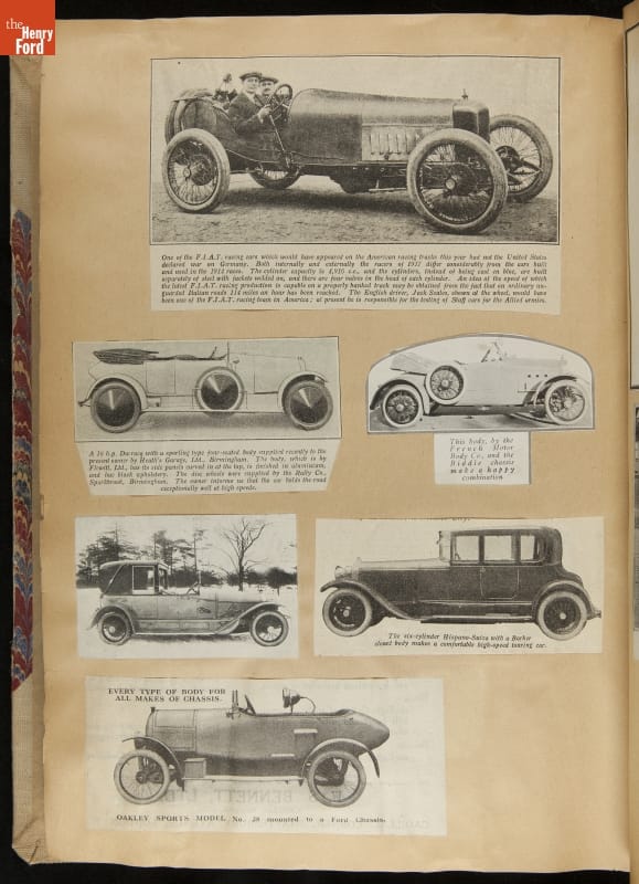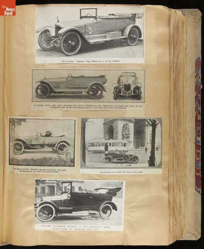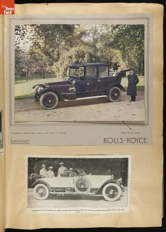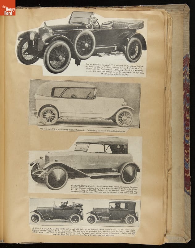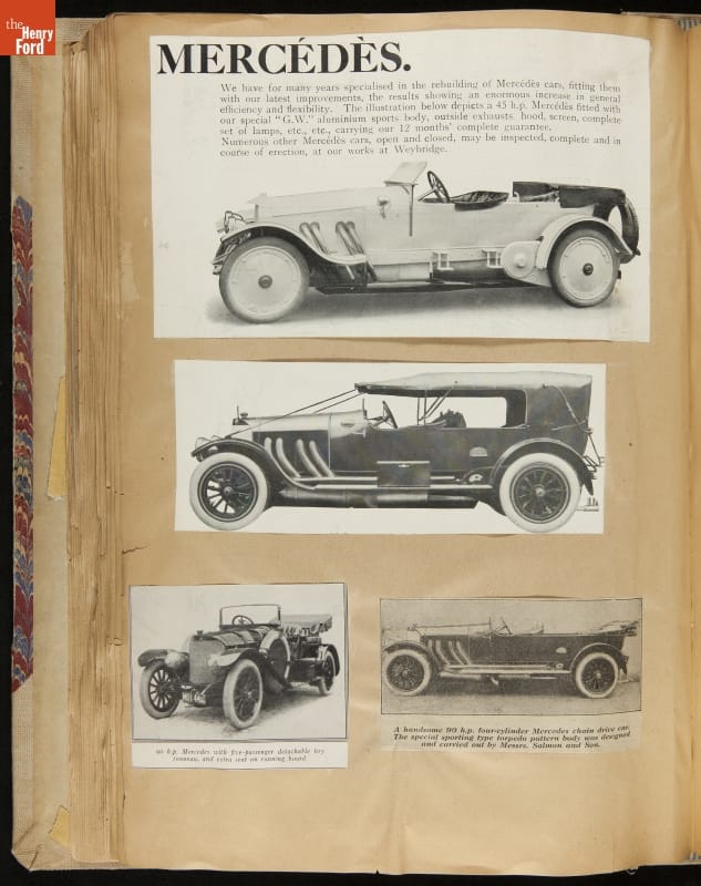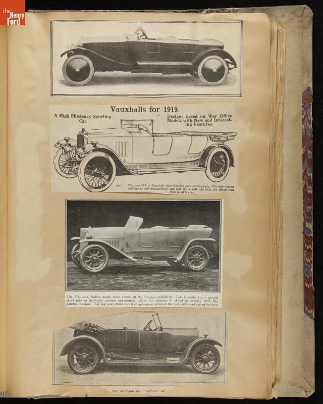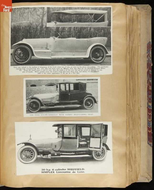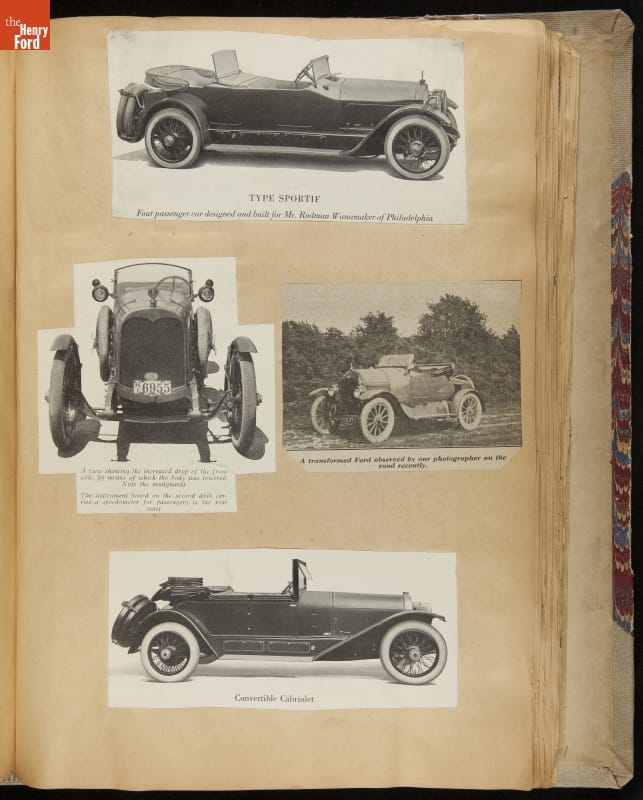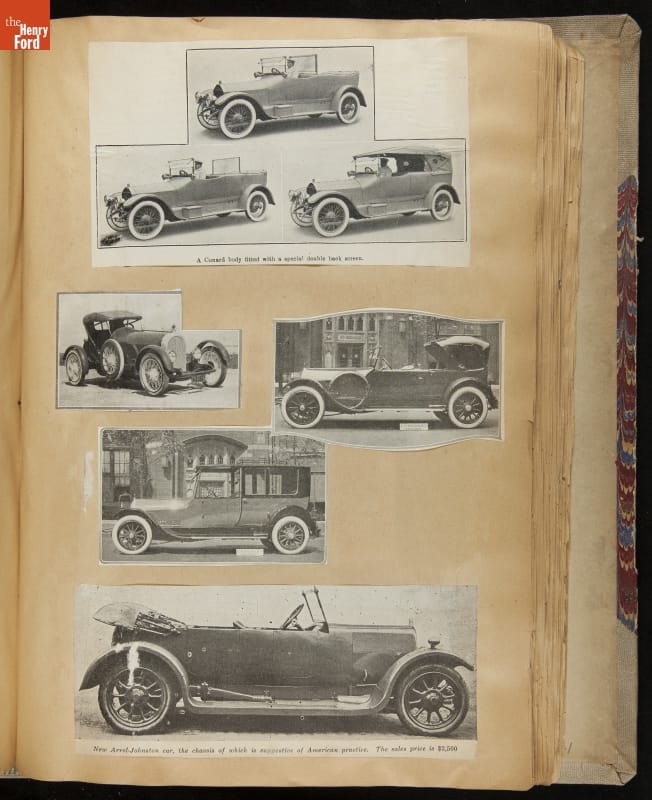 Given his father's obsession, it is no surprise that Edsel Ford was passionate about cars. While Henry Ford focused on the mechanical side of the automobile, Edsel Ford admired the aesthetics of automotive styling. This scrapbook features some of the designs that caught the younger Ford's eye. Elegant European marques like Hispano-Suiza and Rolls-Royce fill its pages.