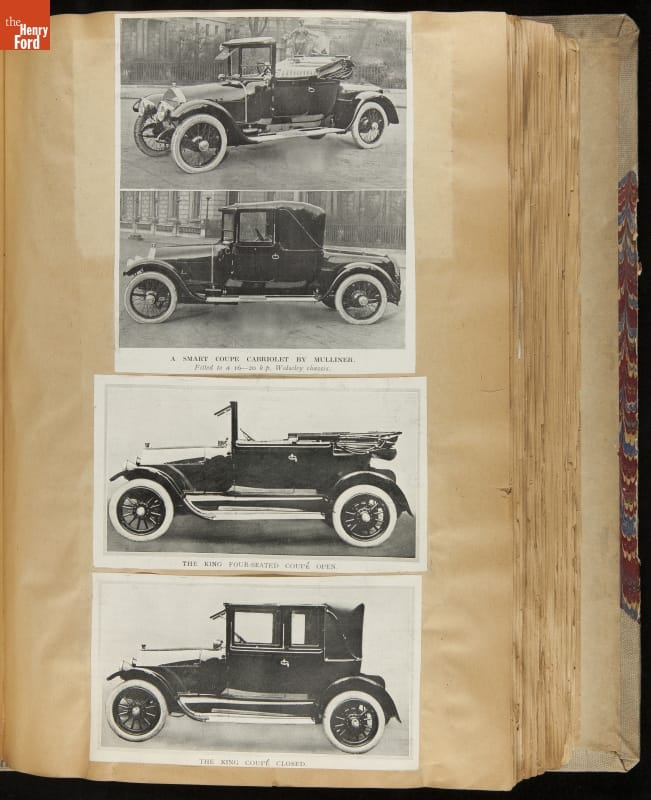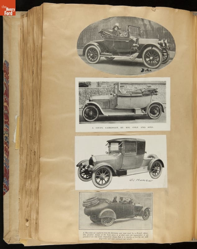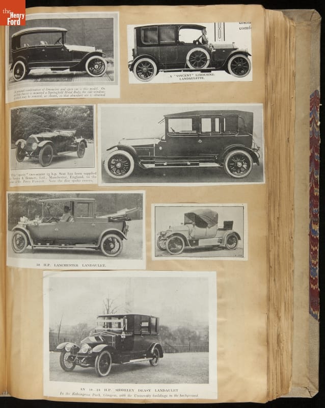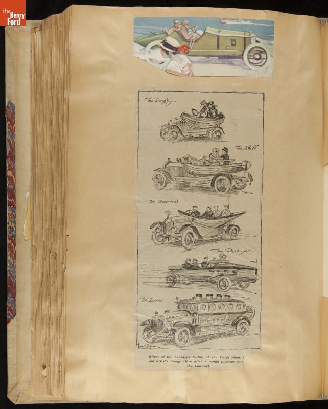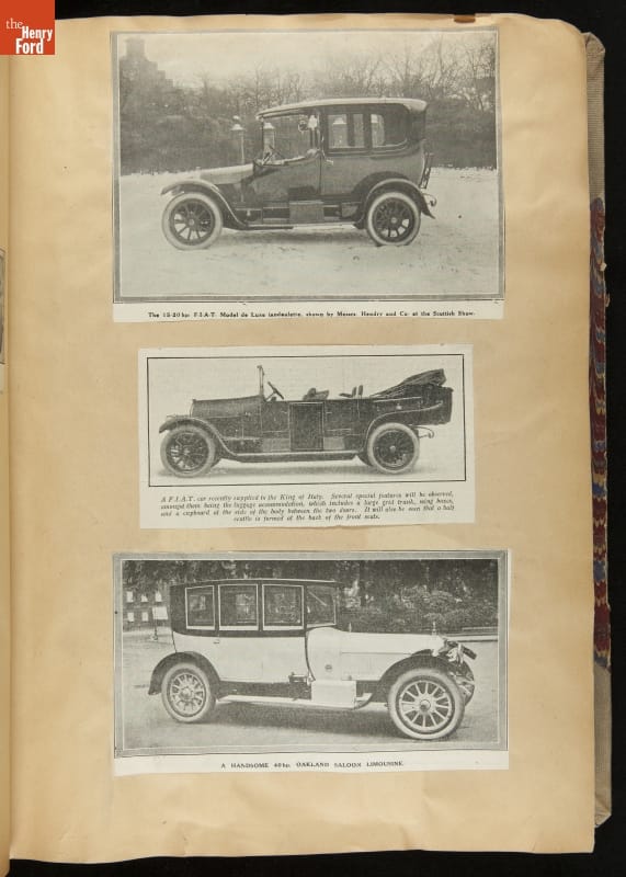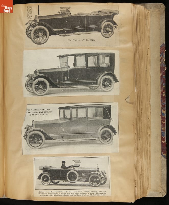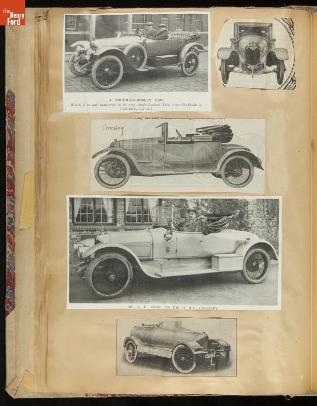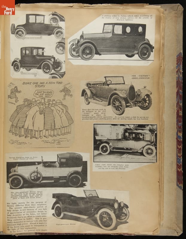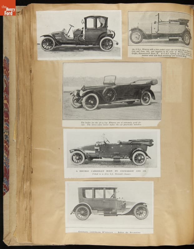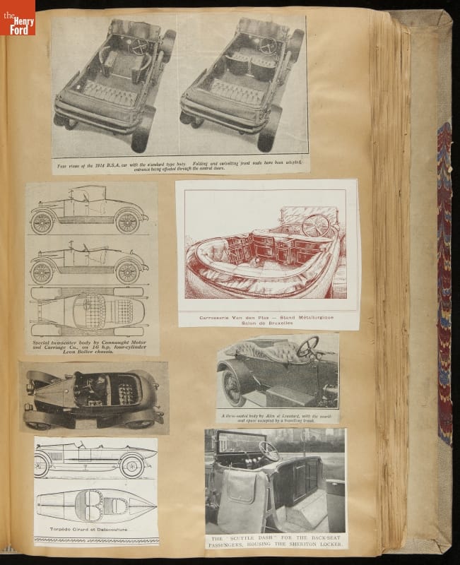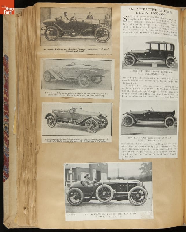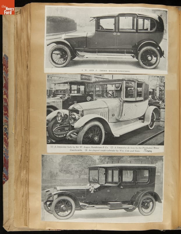 Given his father's obsession, it is no surprise that Edsel Ford was passionate about cars. While Henry Ford focused on the mechanical side of the automobile, Edsel Ford admired the aesthetics of automotive styling. This scrapbook features some of the designs that caught the younger Ford's eye. Elegant European marques like Hispano-Suiza and Rolls-Royce fill its pages.
