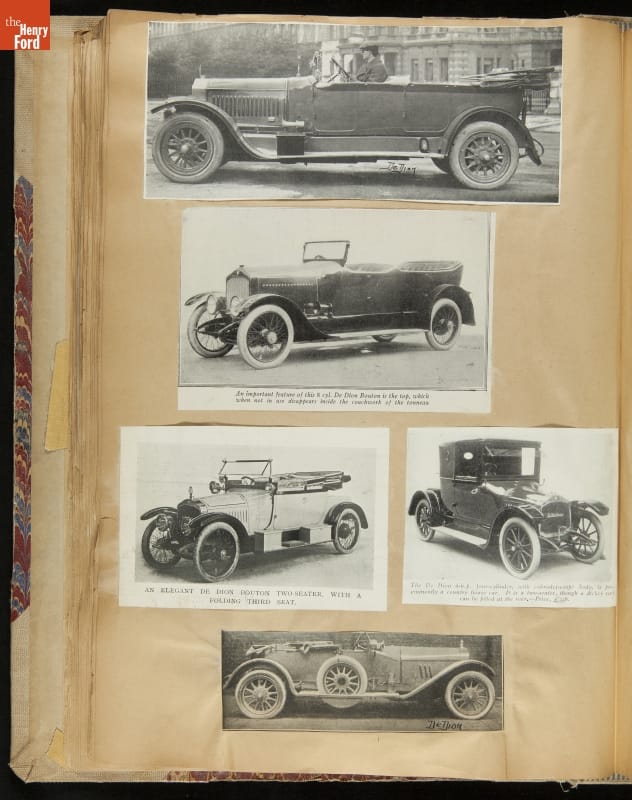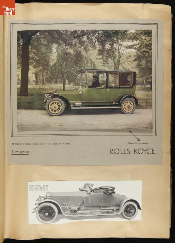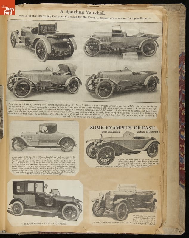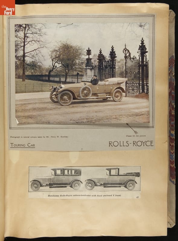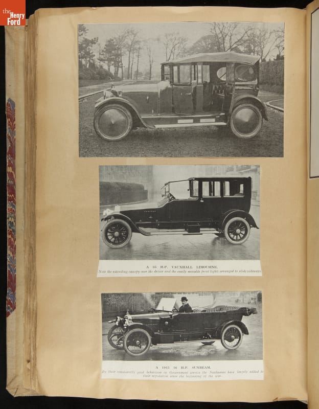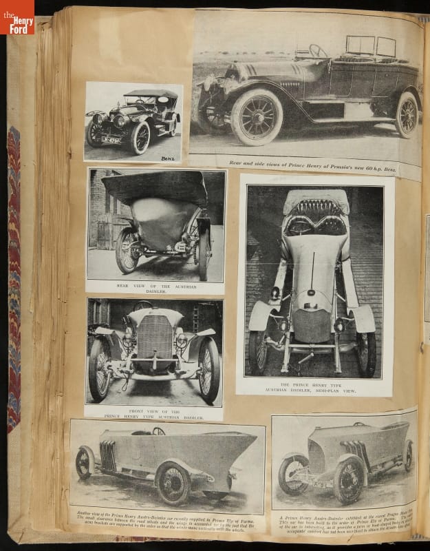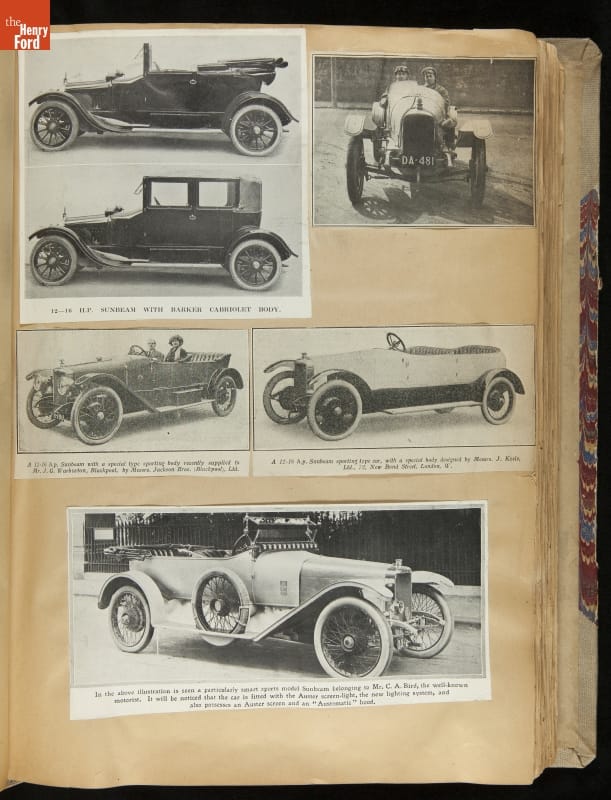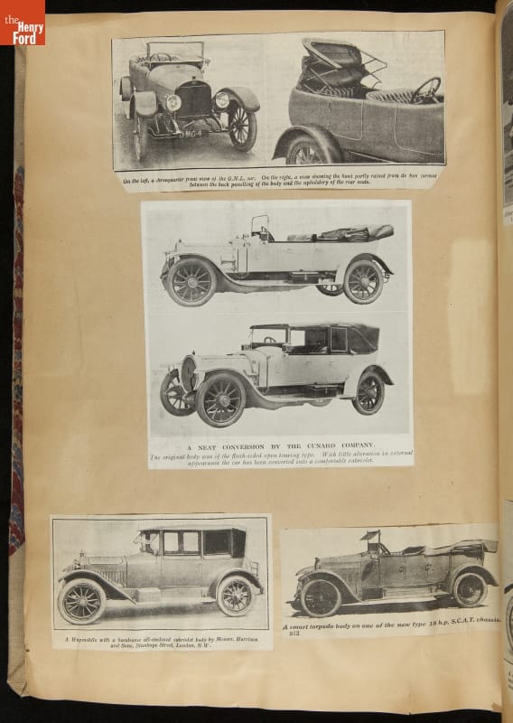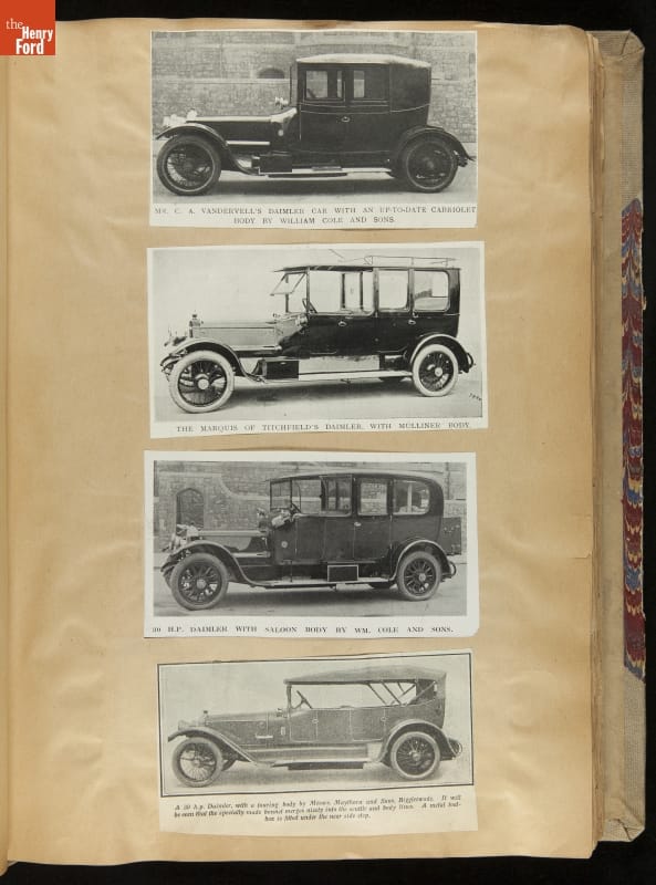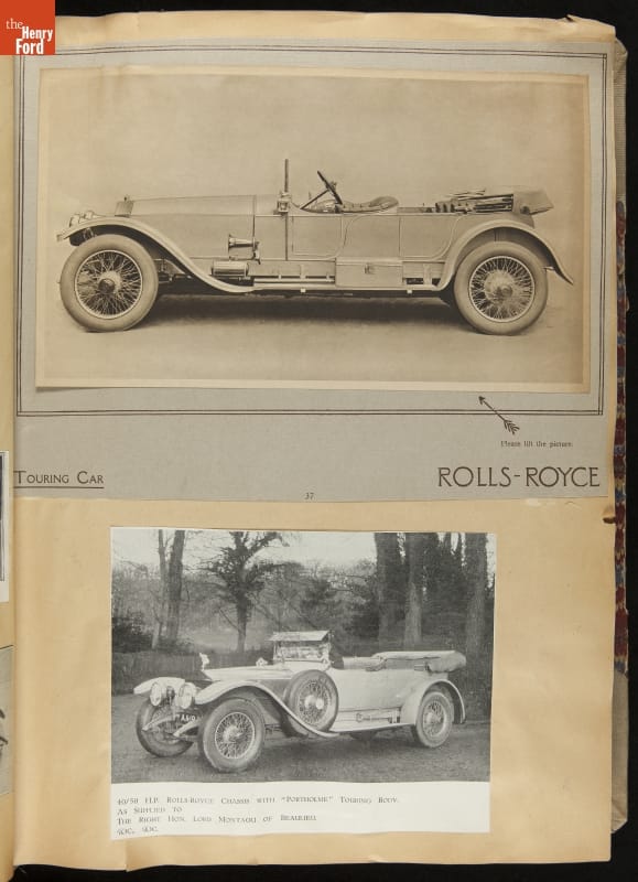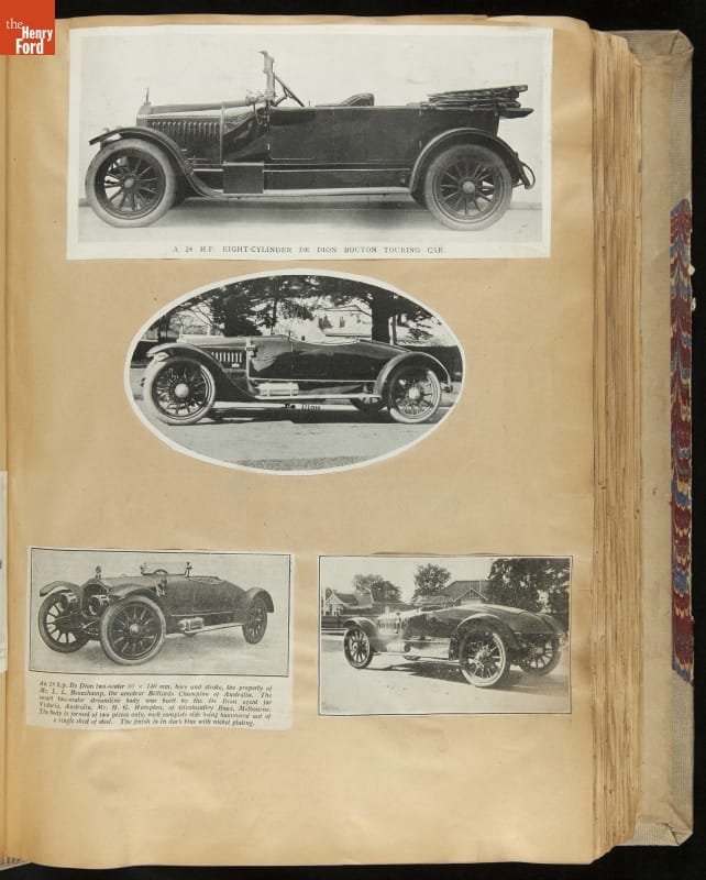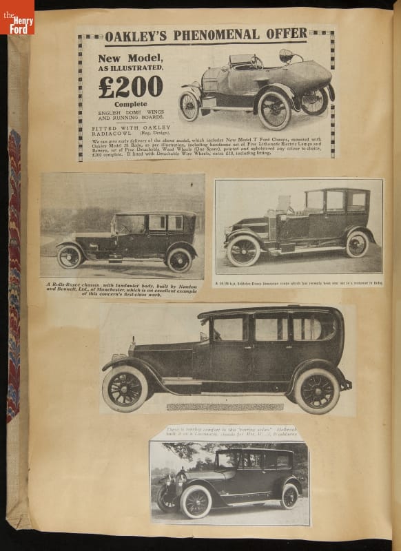 Given his father's obsession, it is no surprise that Edsel Ford was passionate about cars. While Henry Ford focused on the mechanical side of the automobile, Edsel Ford admired the aesthetics of automotive styling. This scrapbook features some of the designs that caught the younger Ford's eye. Elegant European marques like Hispano-Suiza and Rolls-Royce fill its pages.