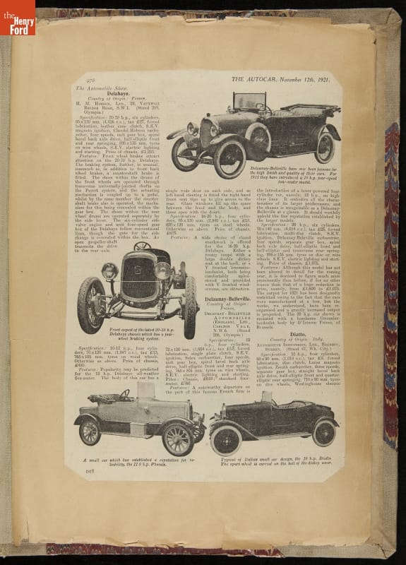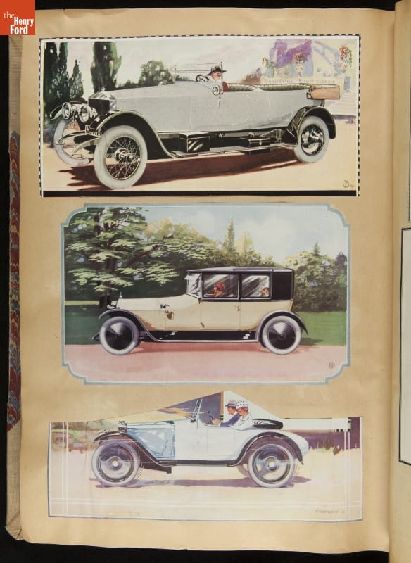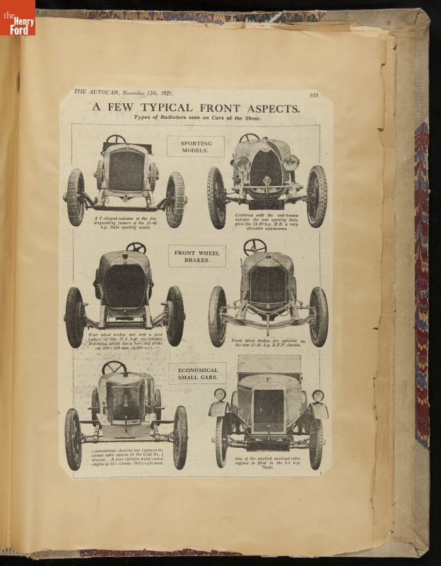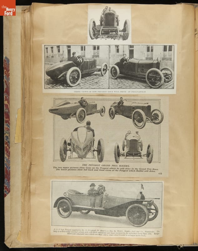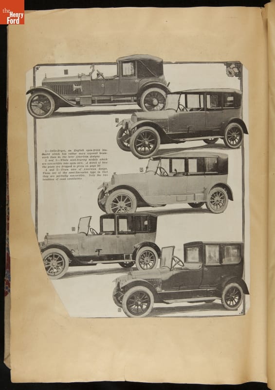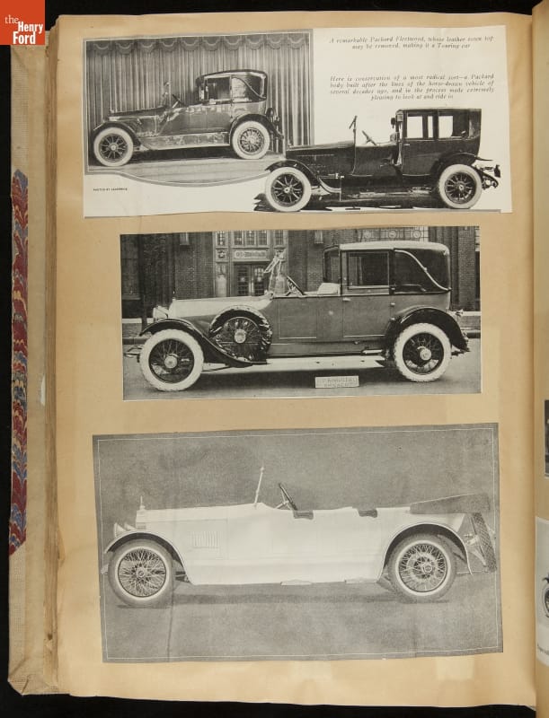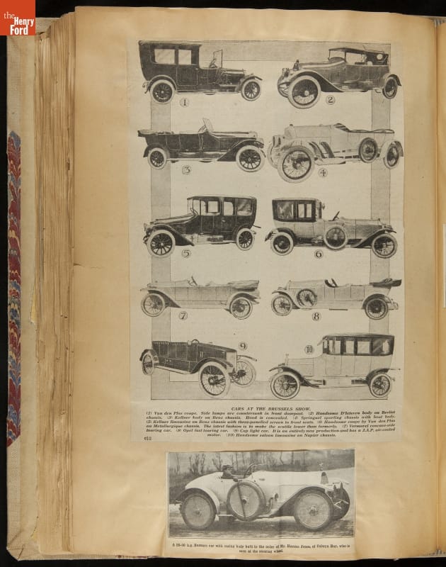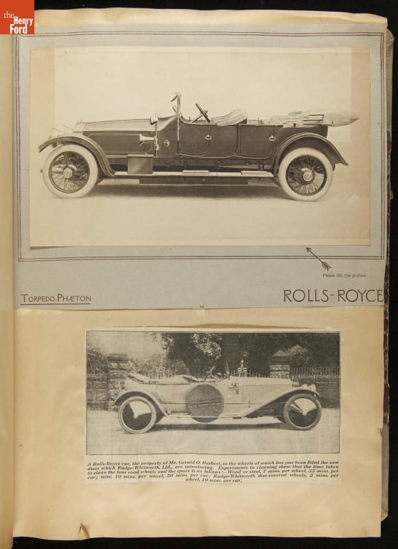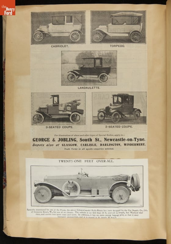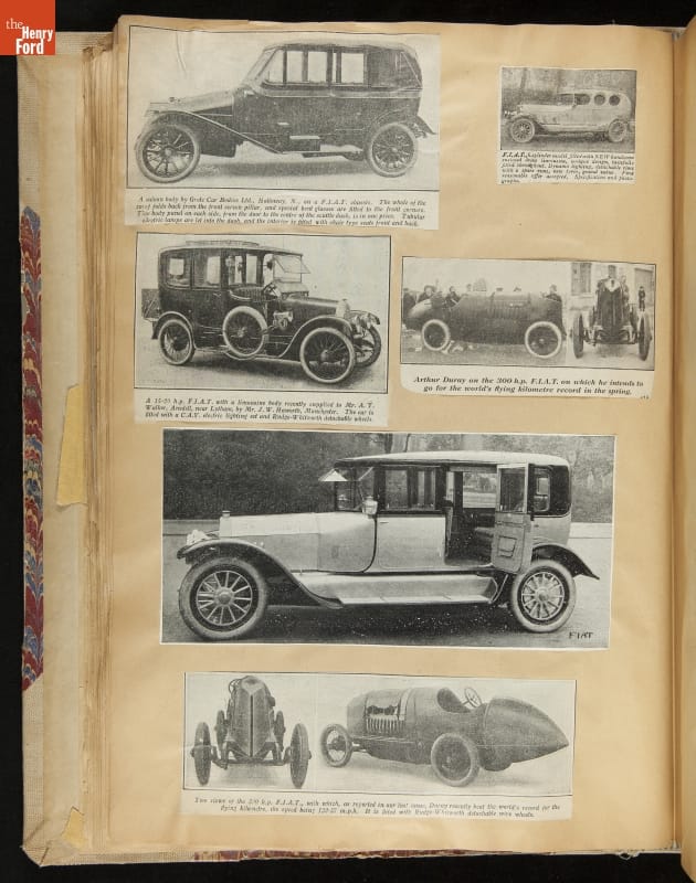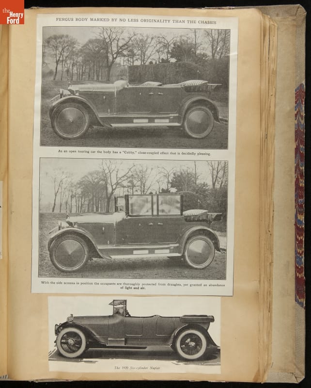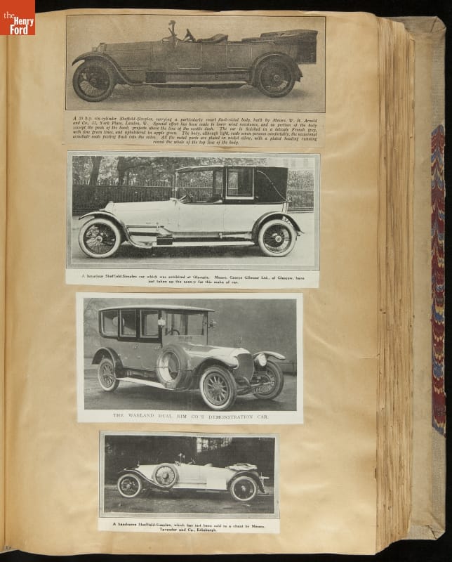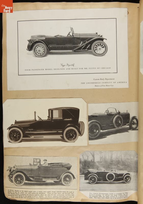 Given his father's obsession, it is no surprise that Edsel Ford was passionate about cars. While Henry Ford focused on the mechanical side of the automobile, Edsel Ford admired the aesthetics of automotive styling. This scrapbook features some of the designs that caught the younger Ford's eye. Elegant European marques like Hispano-Suiza and Rolls-Royce fill its pages.
